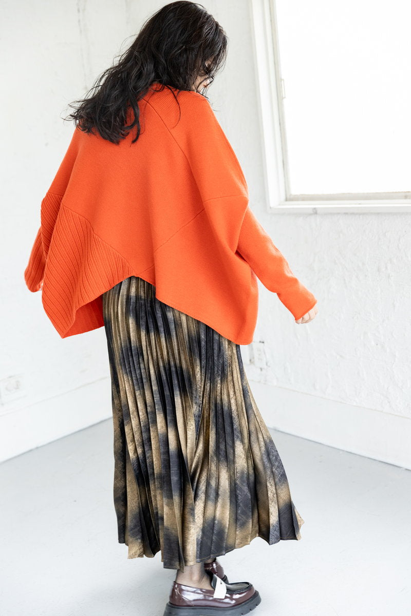存在感を放つORANGEは、ダークに傾く冬に温もりとエネルギーをチャージ。重厚なメタリックスカートも、プリーツで軽やか。