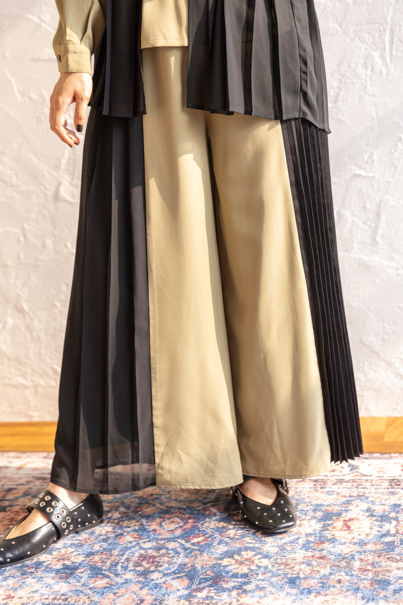 クラス感のあるプリーツのセットアップは、秋冬のパーティシーンに。軽やかな透け感と落ち着きのあるシルエットがグッドバランス。
