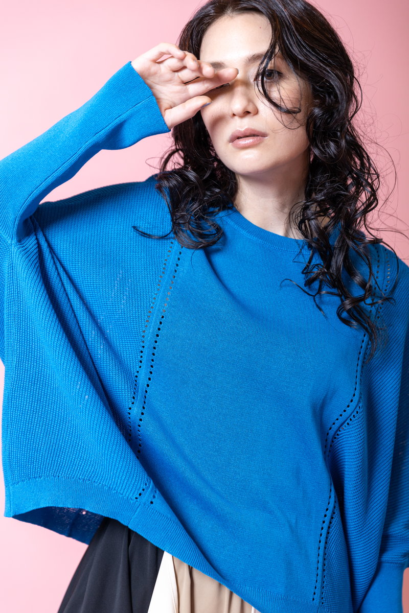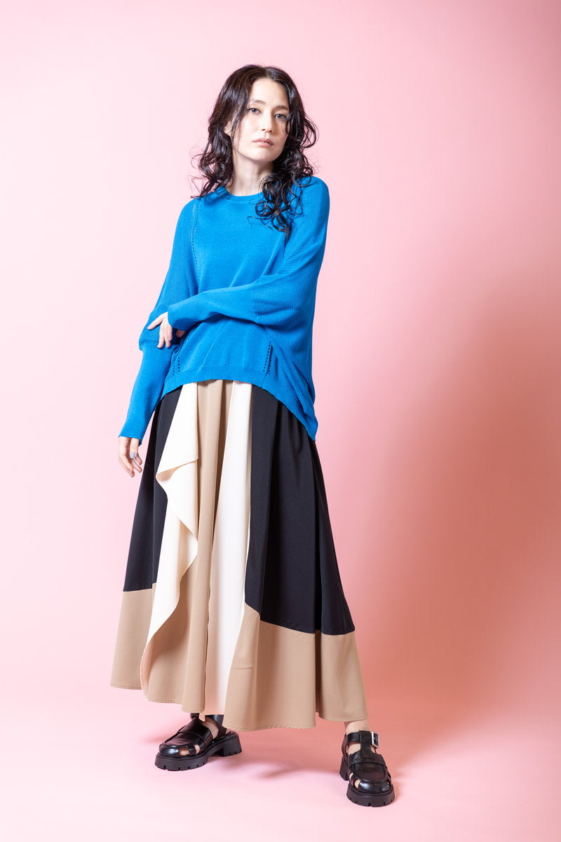 鮮やかなブルーニットを主役に、配色スカートで軽やかな動きをプラス。 シンプルながらも表情のある、大人のカジュアルシックスタイル。