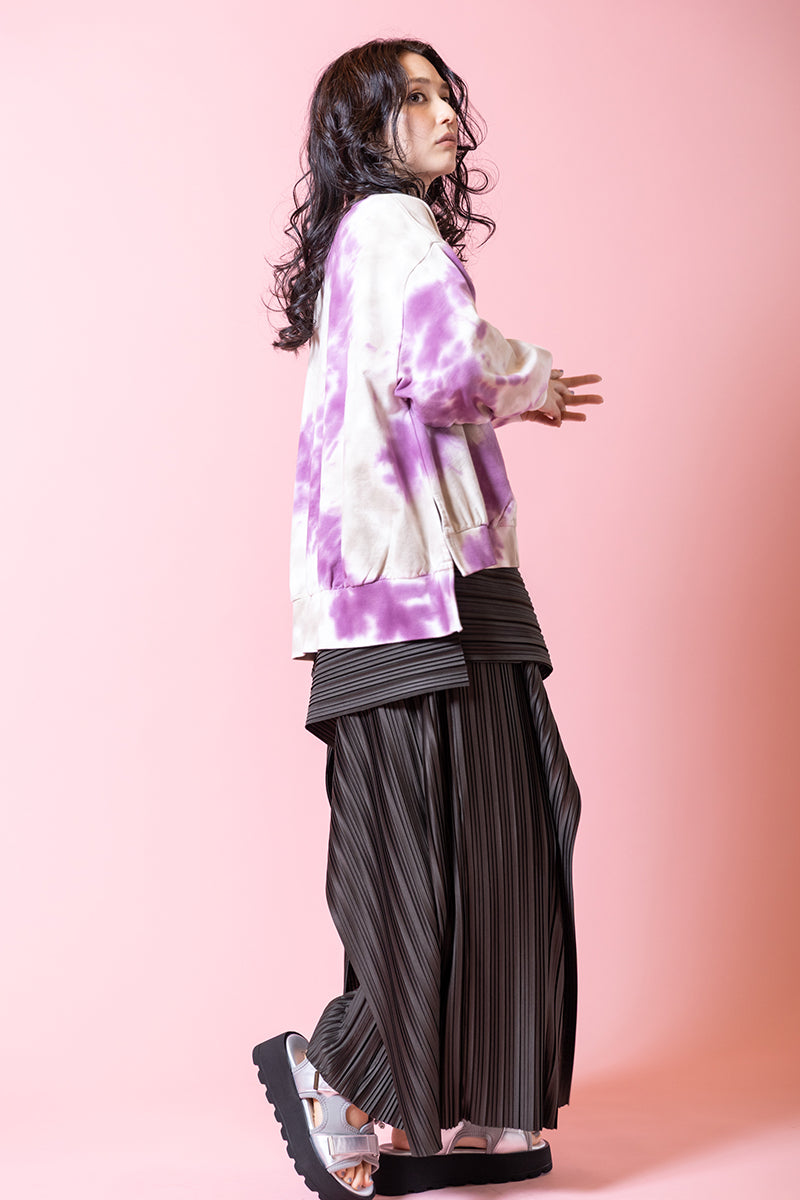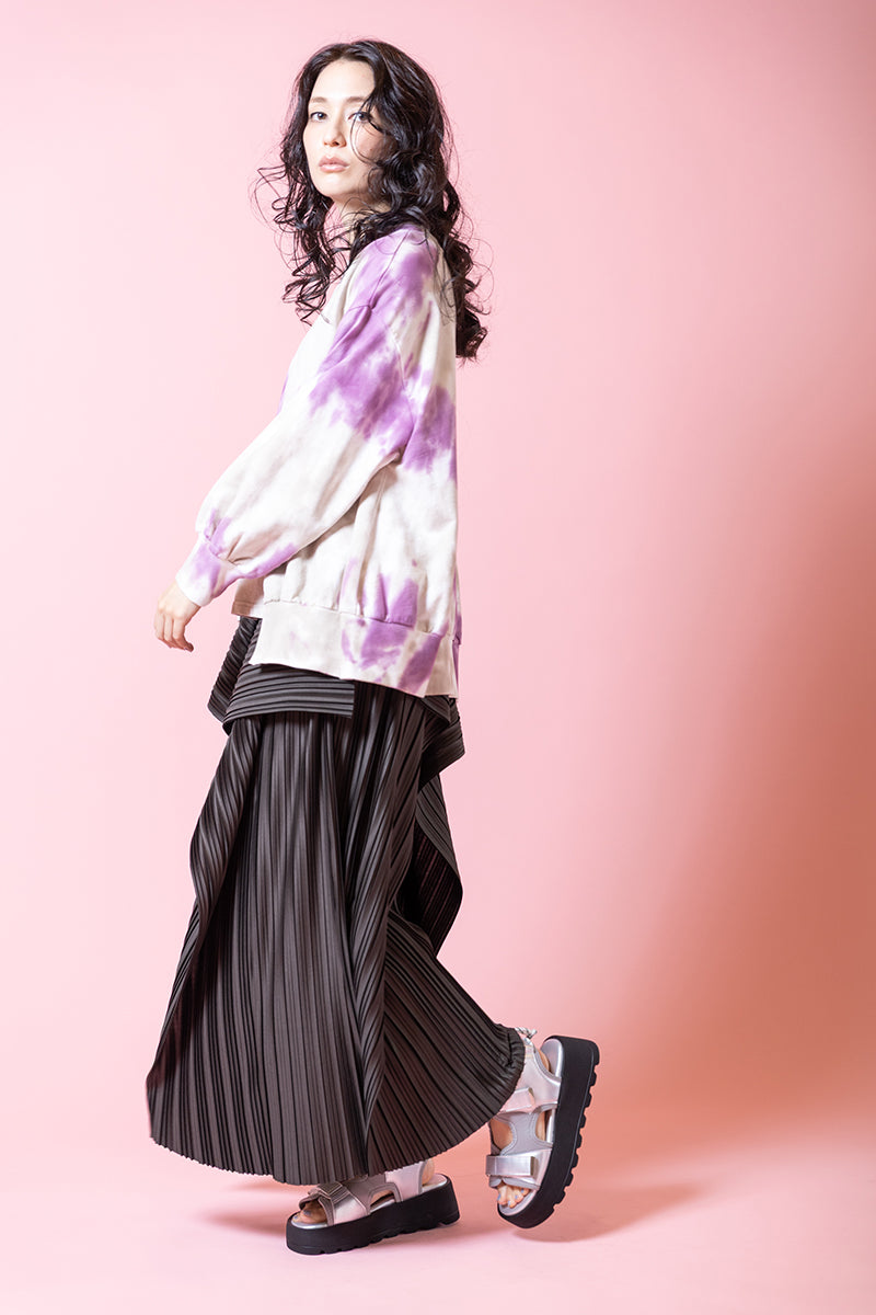 ピースフルなタイダイを、 ダークなボトムで引き締めて。 マットなプリーツ素材が、 波打つカスケードラインを華麗に後押し。