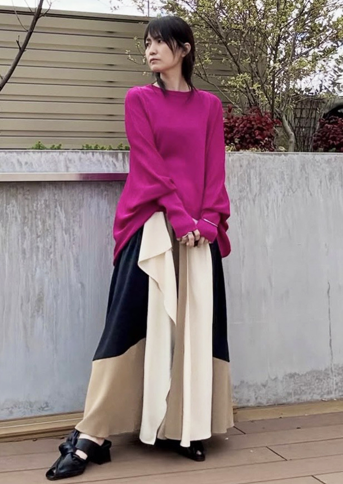OSMOSISらしい配色デザインに、さりげないカスケードがエッジを効かせるスカート。