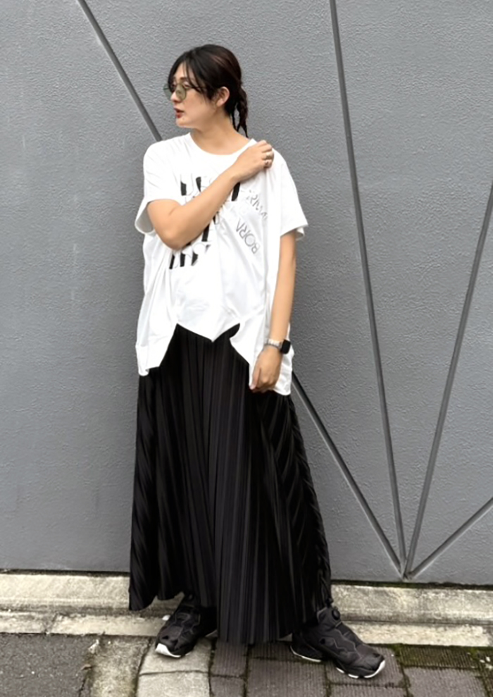 Y2Kムードのリメイク風Tシャツは、こなれた風合いで大人に馴染む1枚。