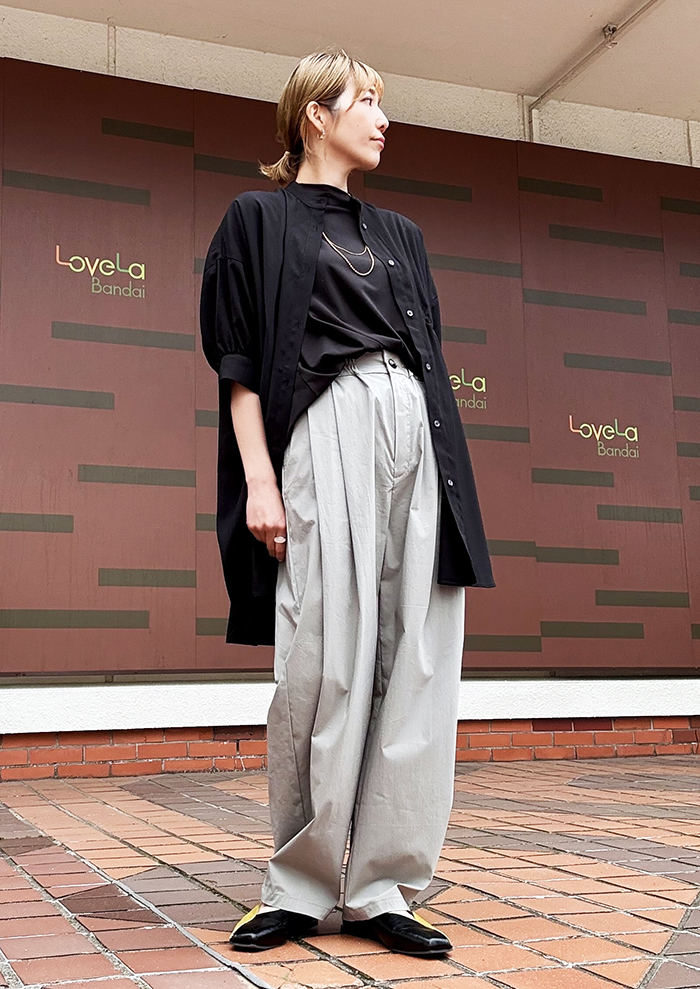 ややフレアに広がるシルエットは、体型カバーにも効く。