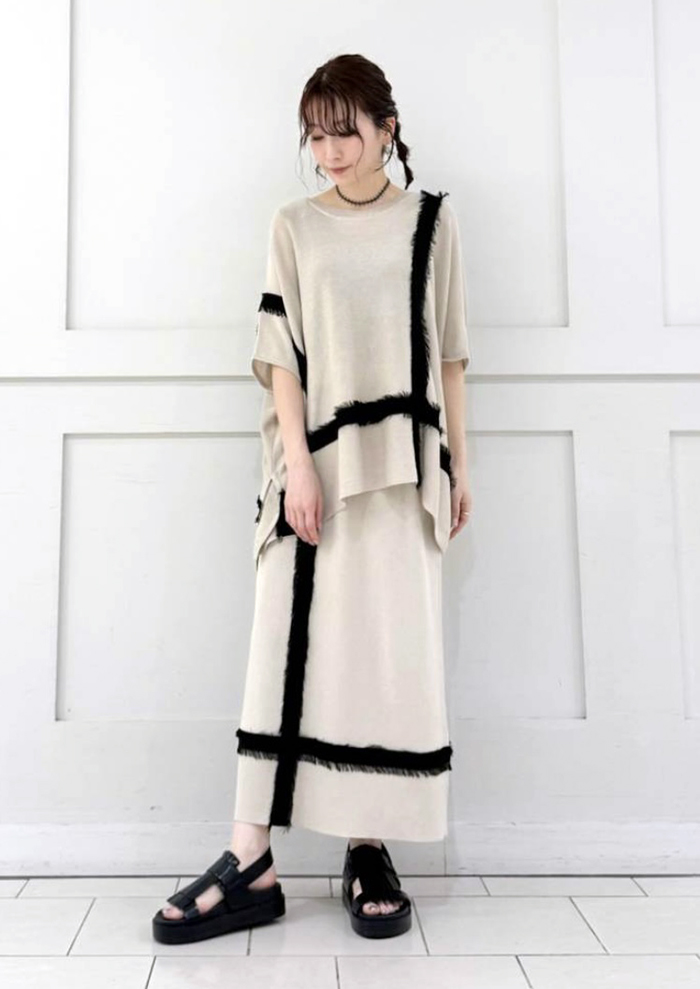 程よくリーンなシルエットのスカートに、フリンジテープのアクセントがよりスタイルアップ効果をもたらす。