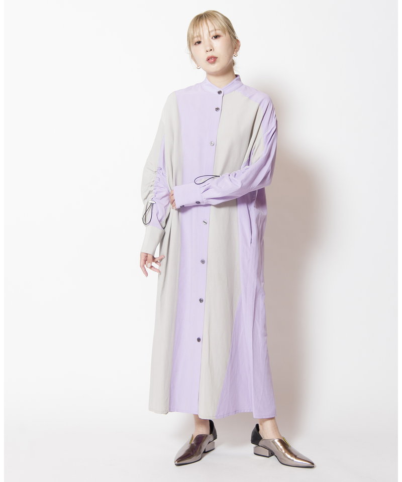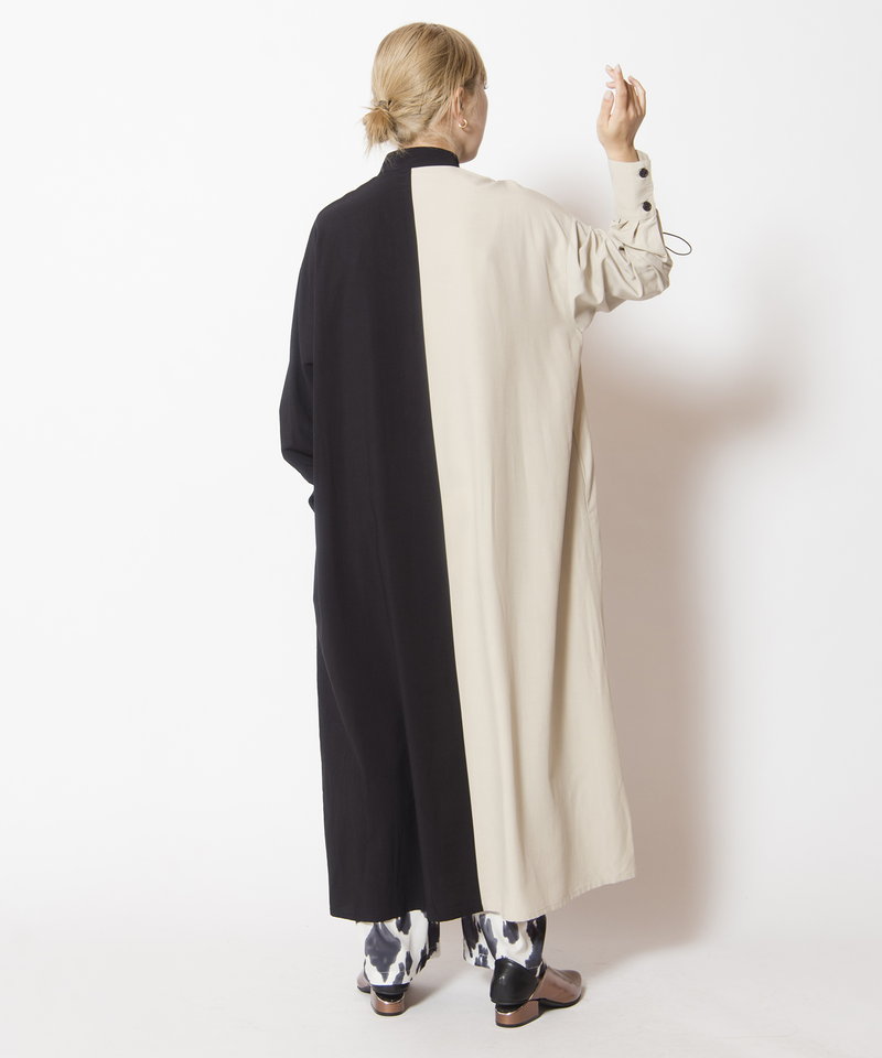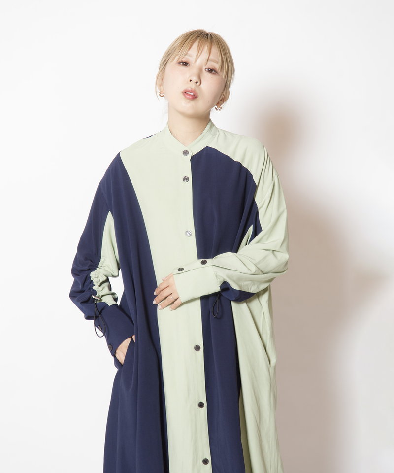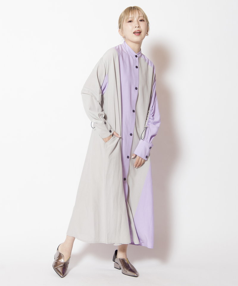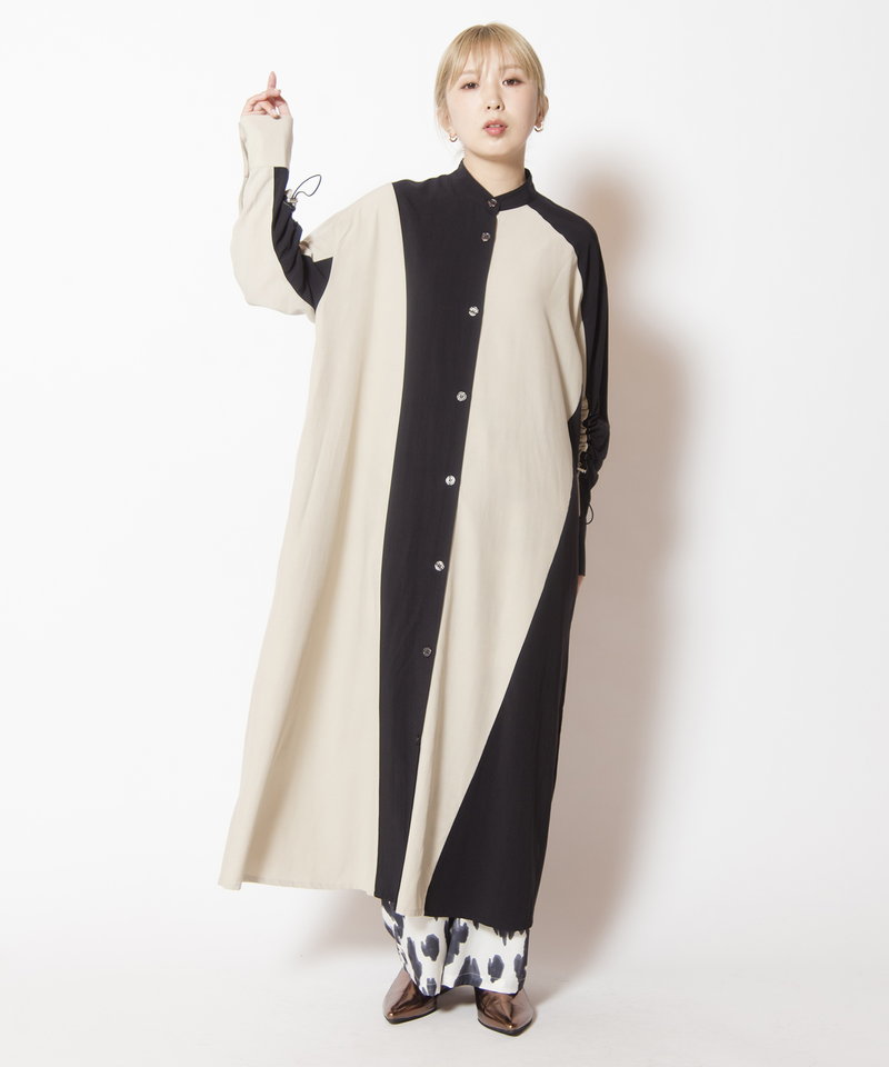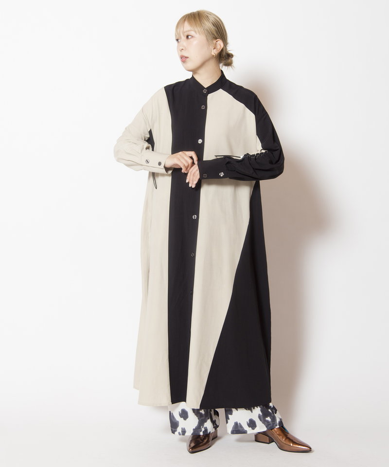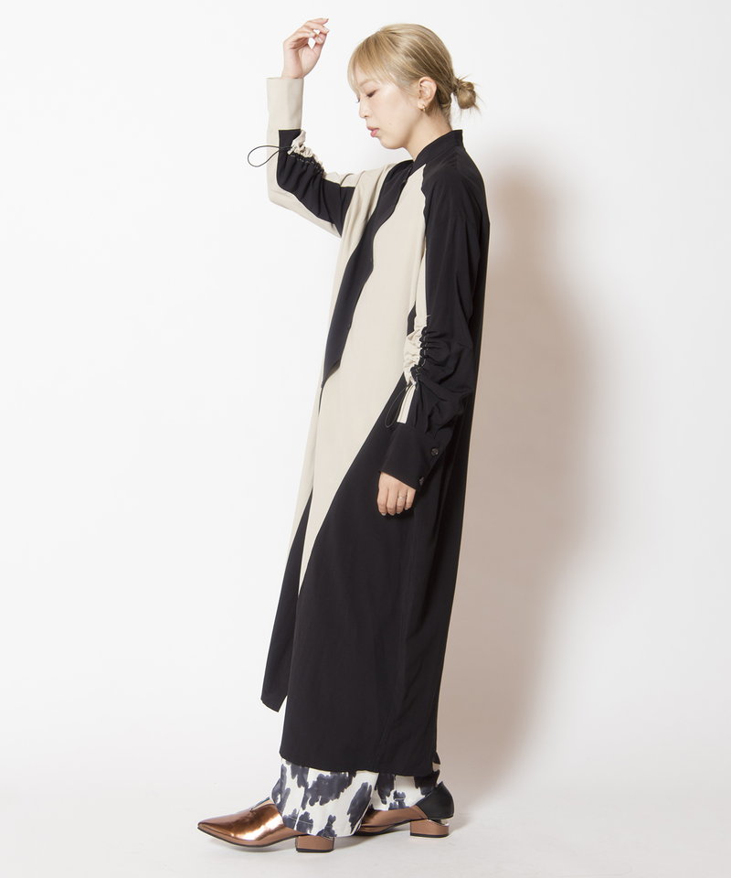 大胆に切替えたカラーやドローコードを効かせたギャザースリーブが、モードを感じるワンピース。