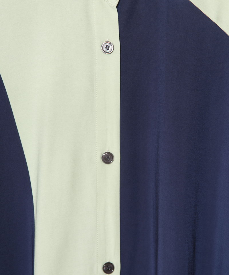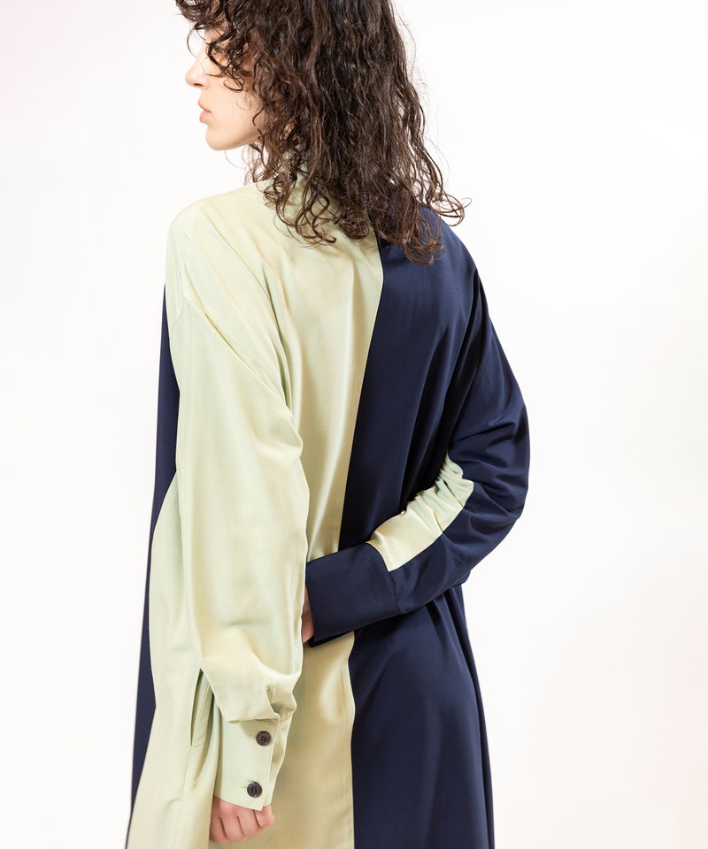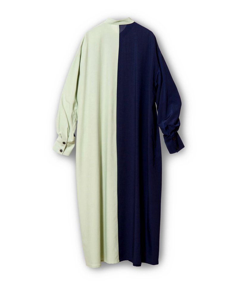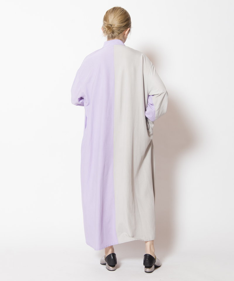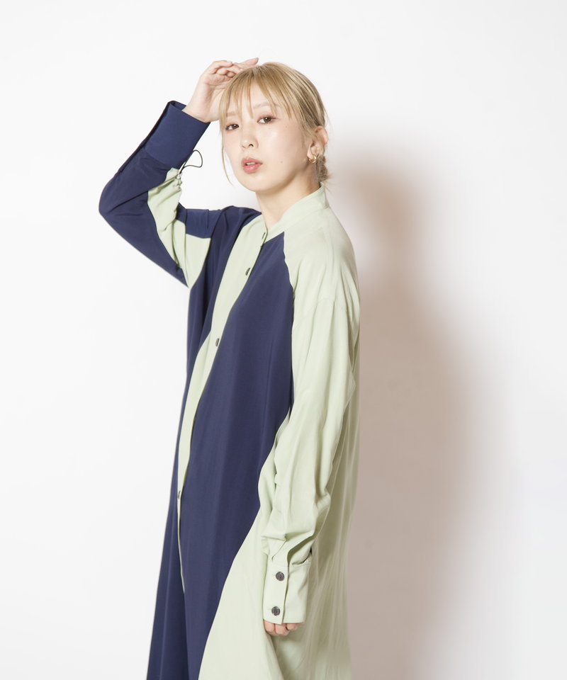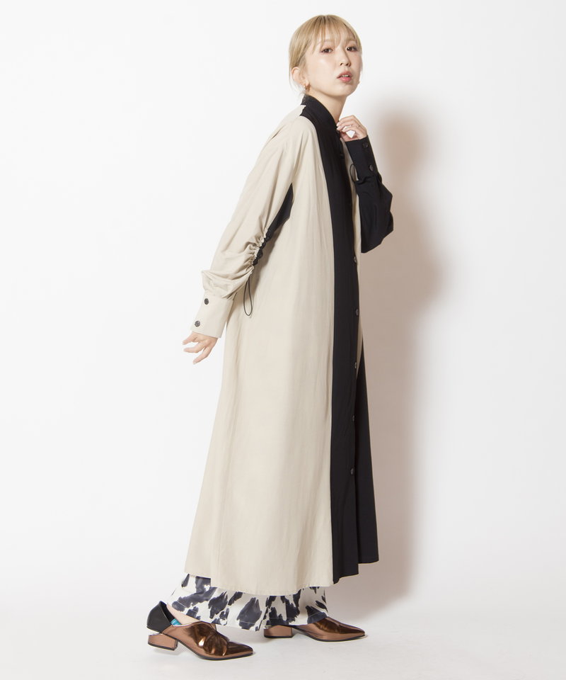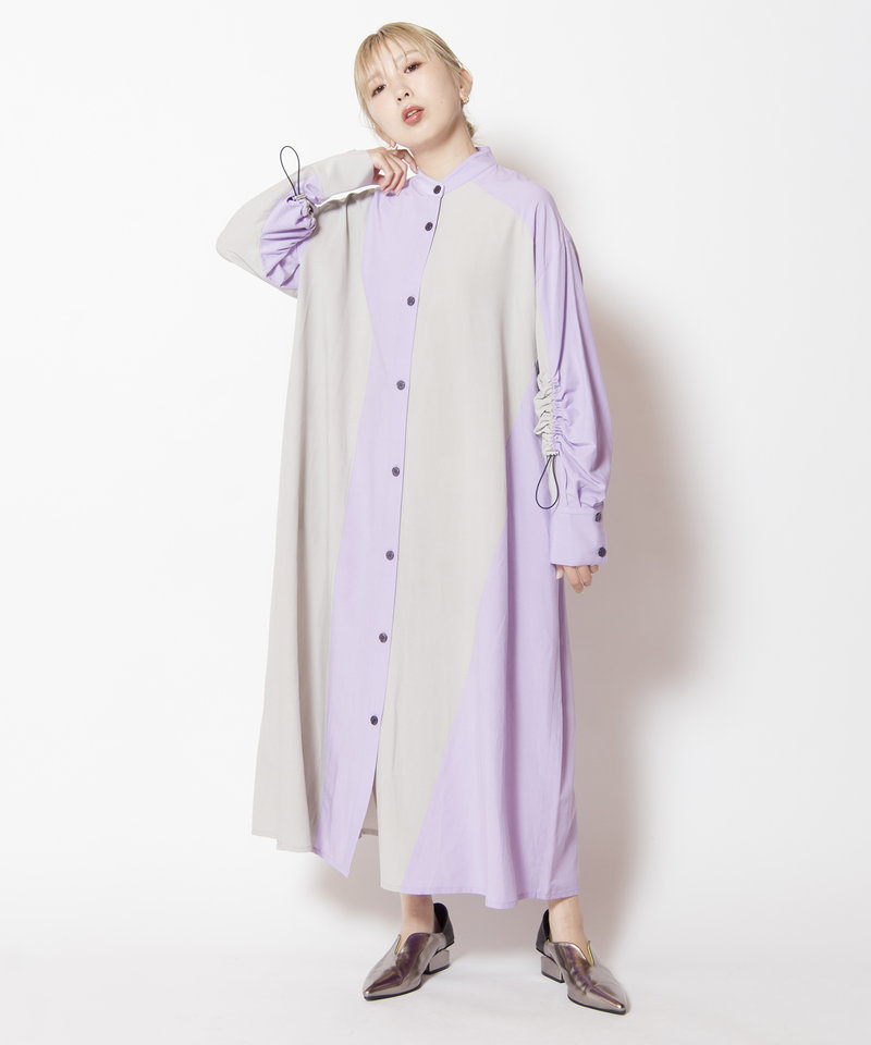 大胆に切替えたカラーやドローコードを効かせたギャザースリーブが、モードを感じるワンピース。