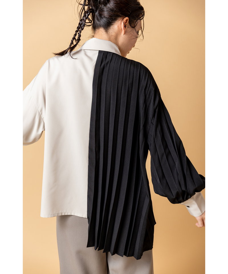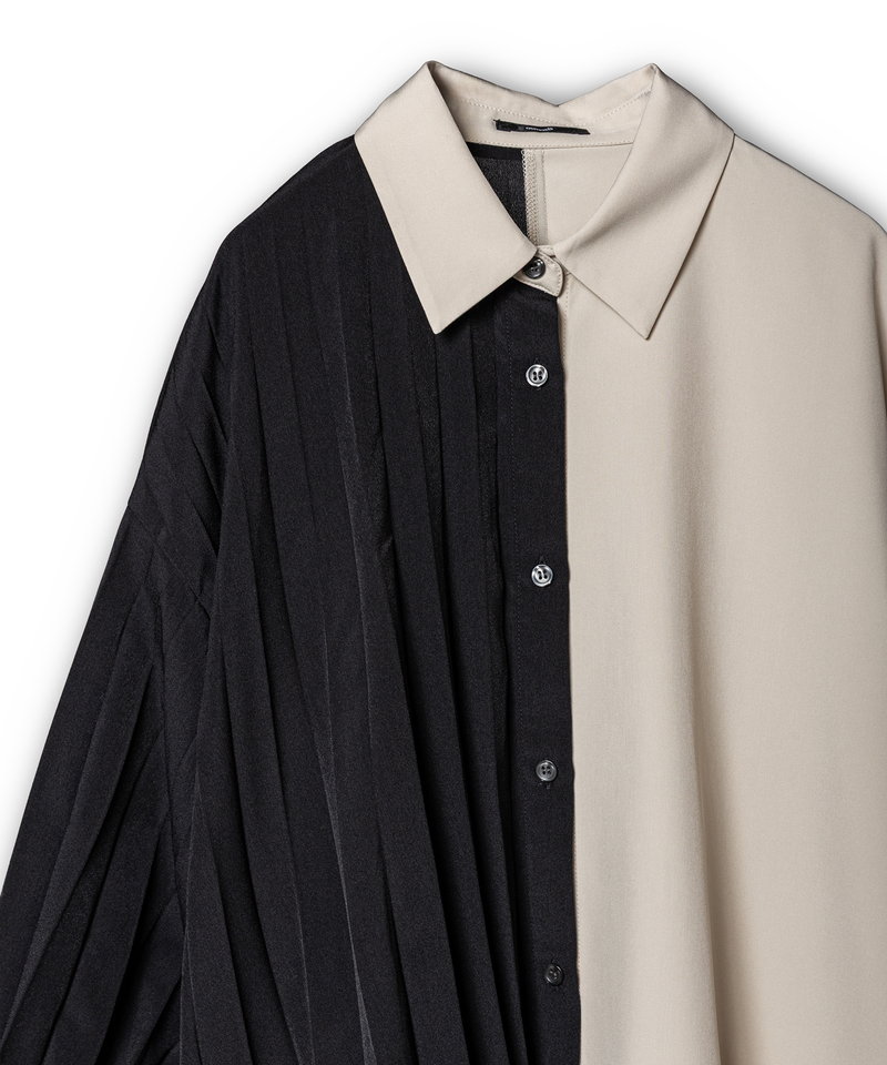 大胆な切替とプリーツで、シックさと華やぎを併せ持つモードなブラウス。