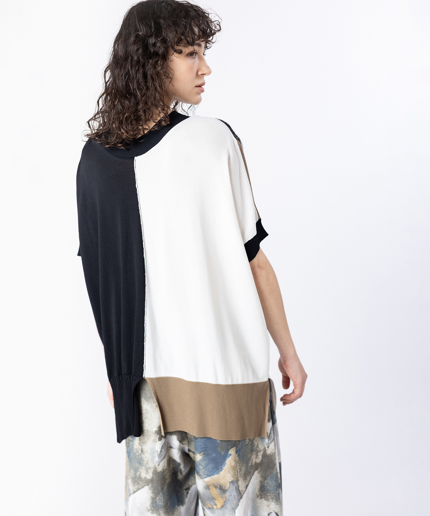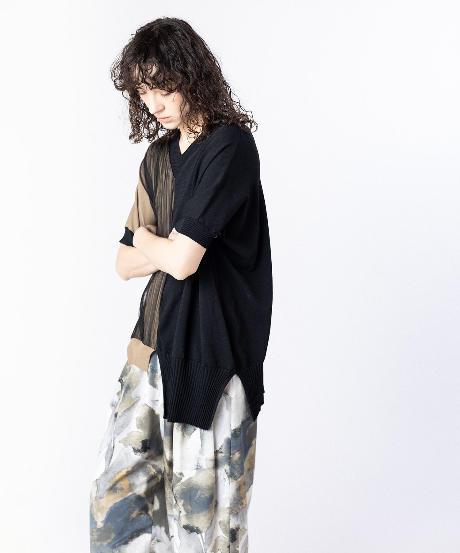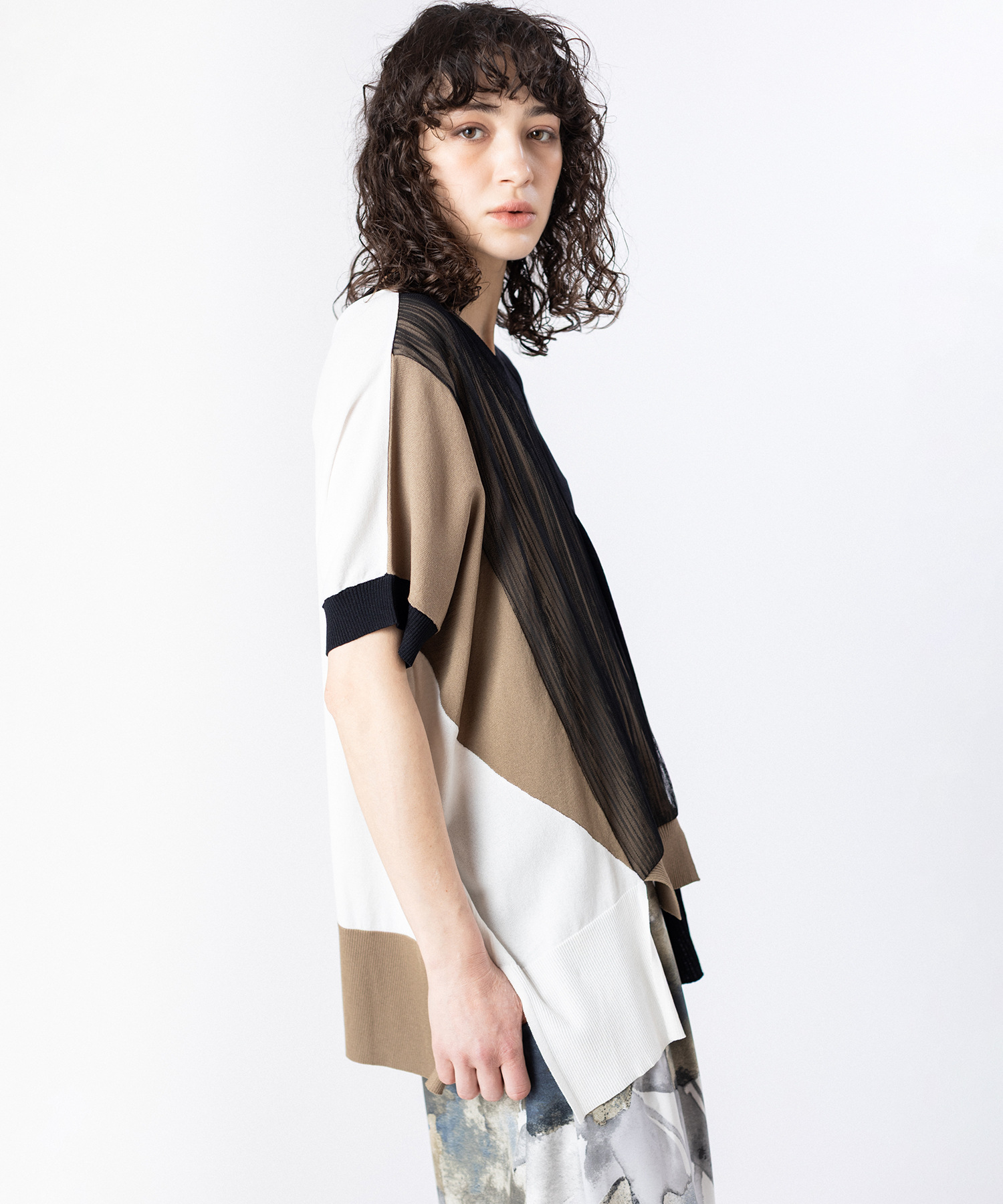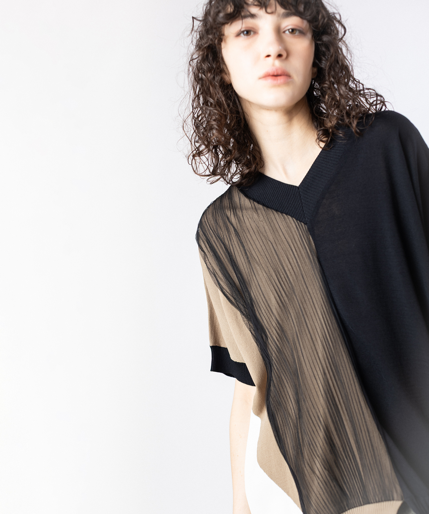 アイコニックな切替ニットに、繊細なチュールをレイヤード。