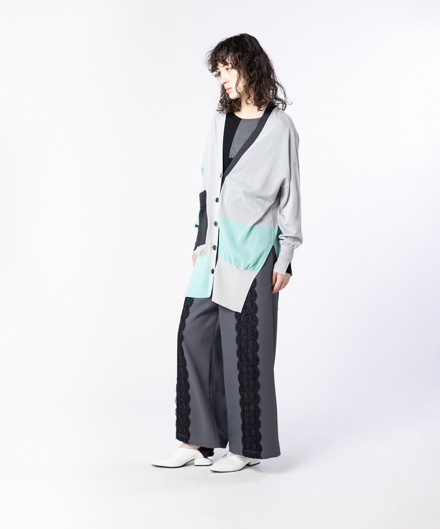 計算されたカラーブロックが視線を引き寄せるカーディガンは、縦ラインを意識したミドル丈でスタイルアップも狙える一枚。