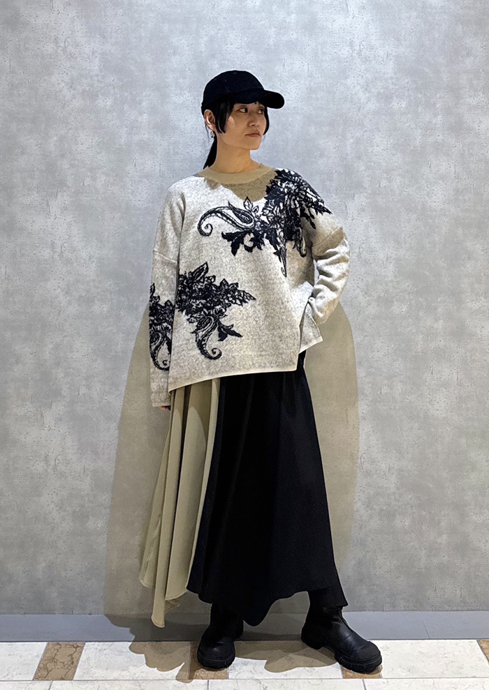 ウェアラブルなオーバーニットに、ヴィクトリアンムードが香るジャガード刺繍がポイント。