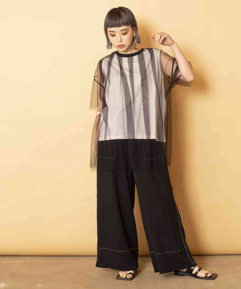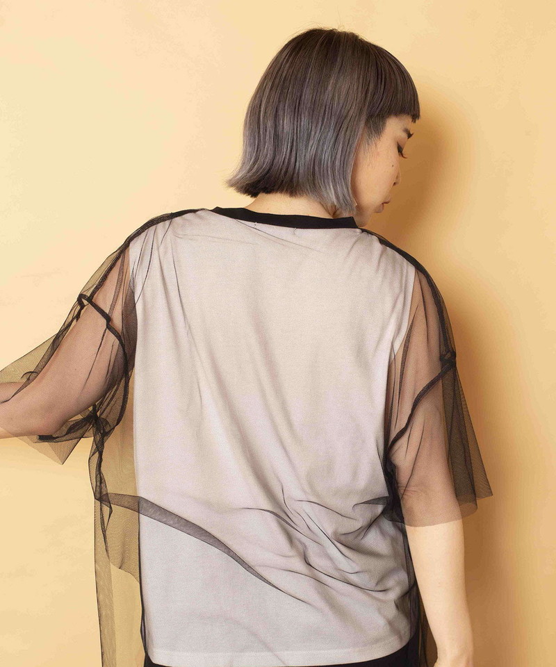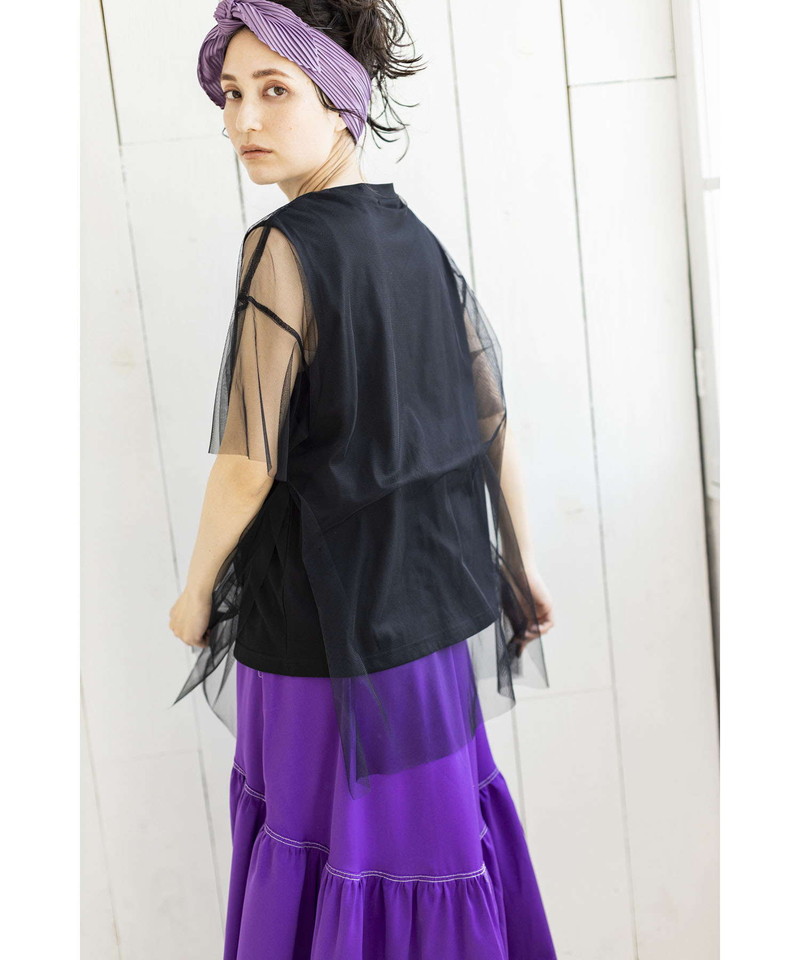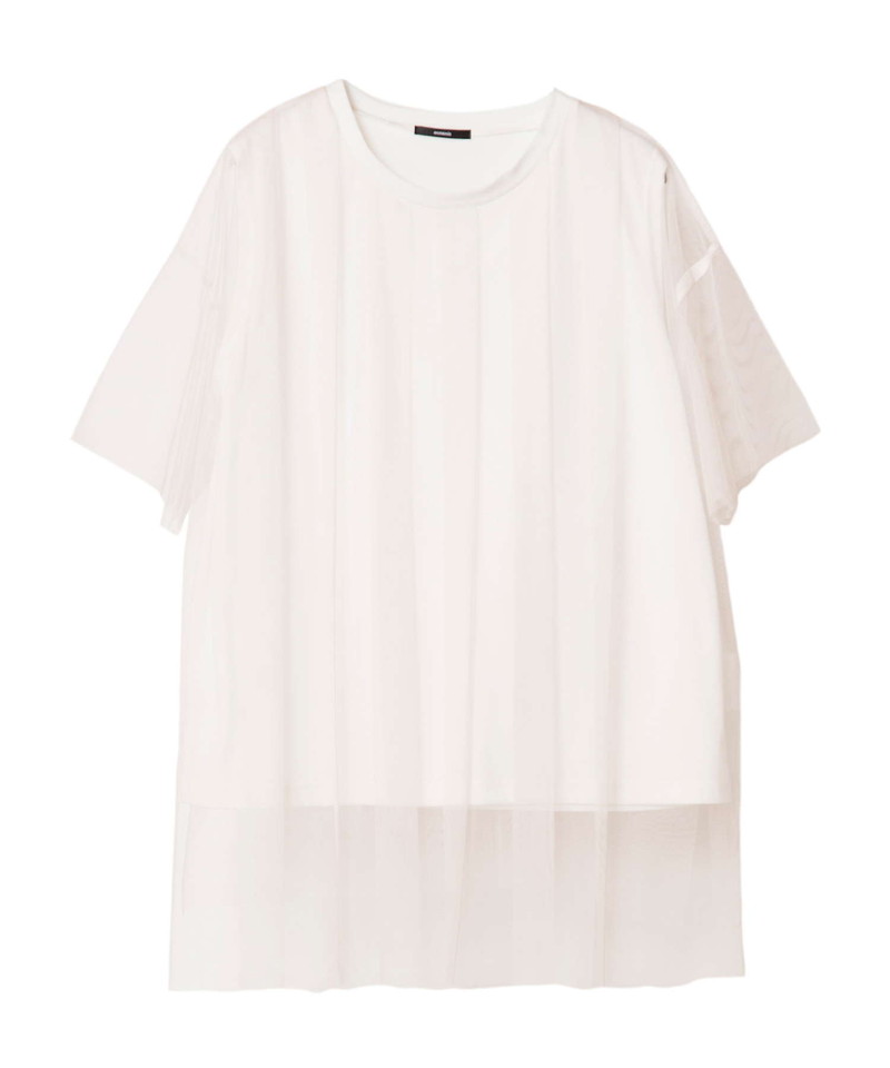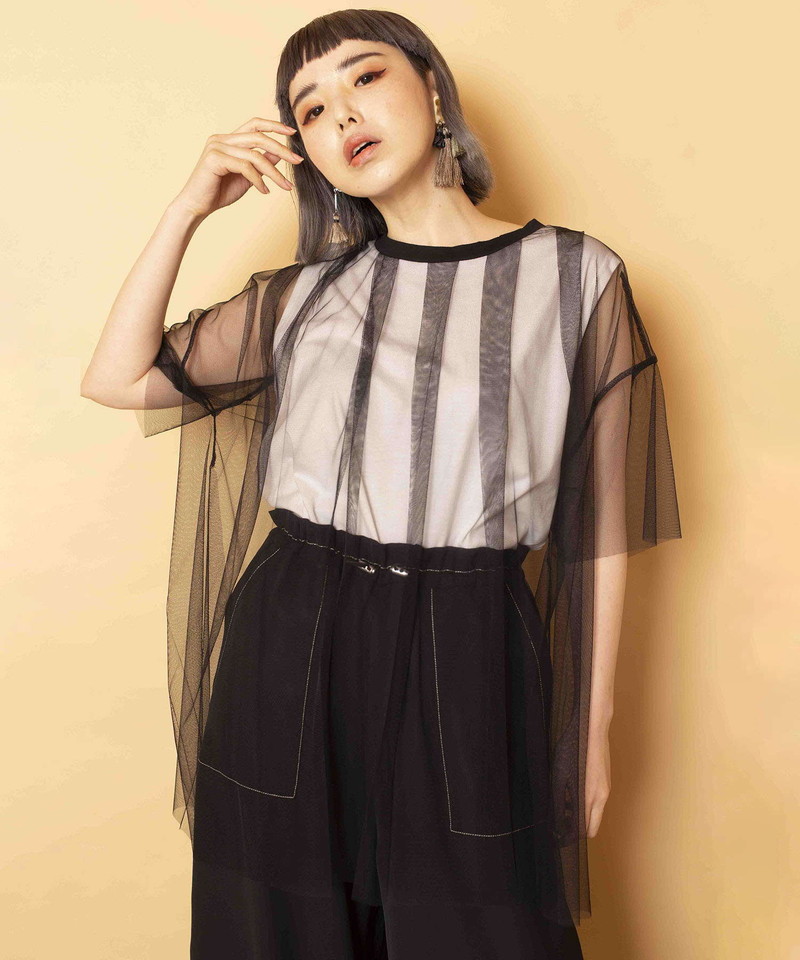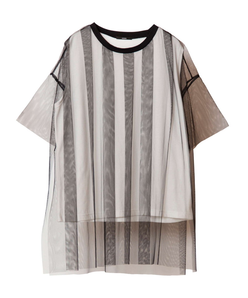 タンクトップにチュールをレイヤードしたエッジーな透け感が、旬のムード漂うオーバーチュールTシャツ。