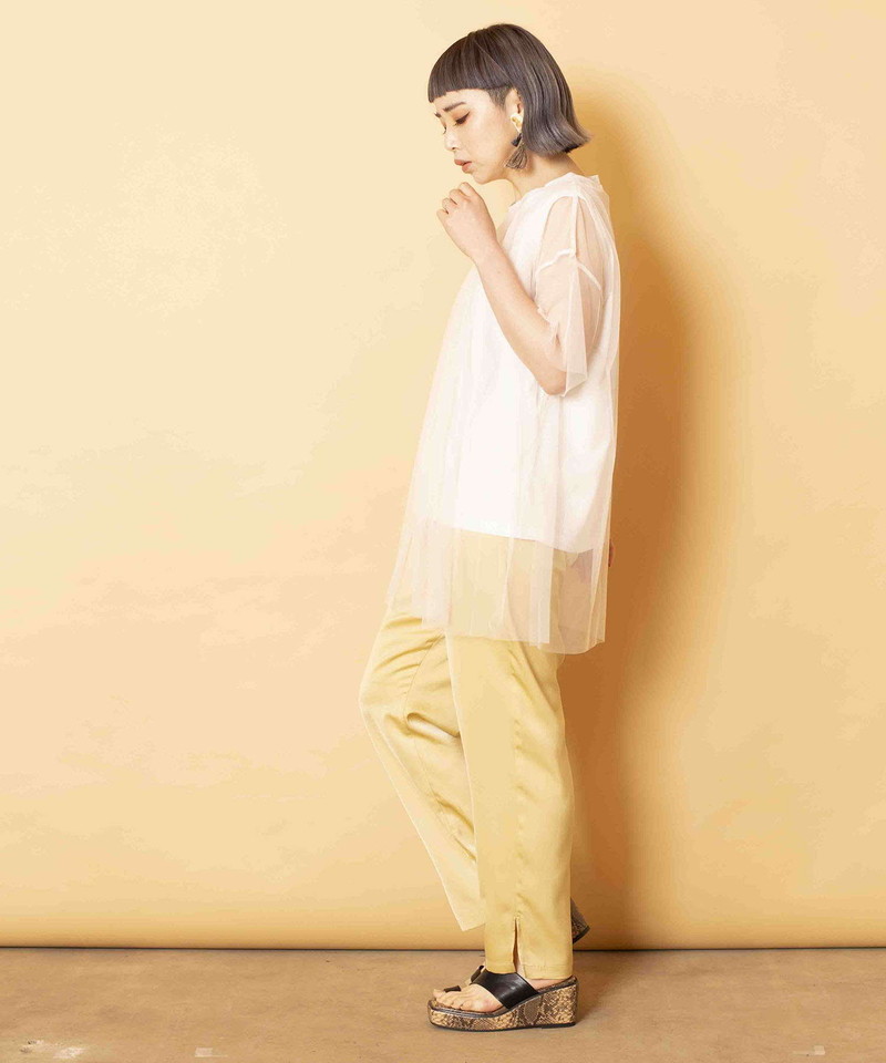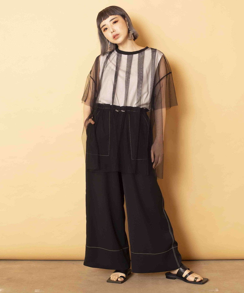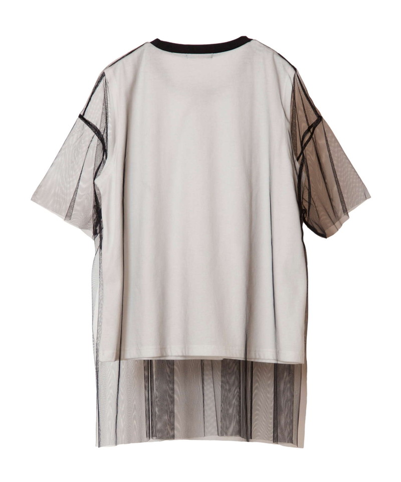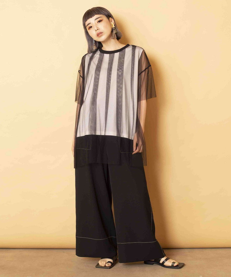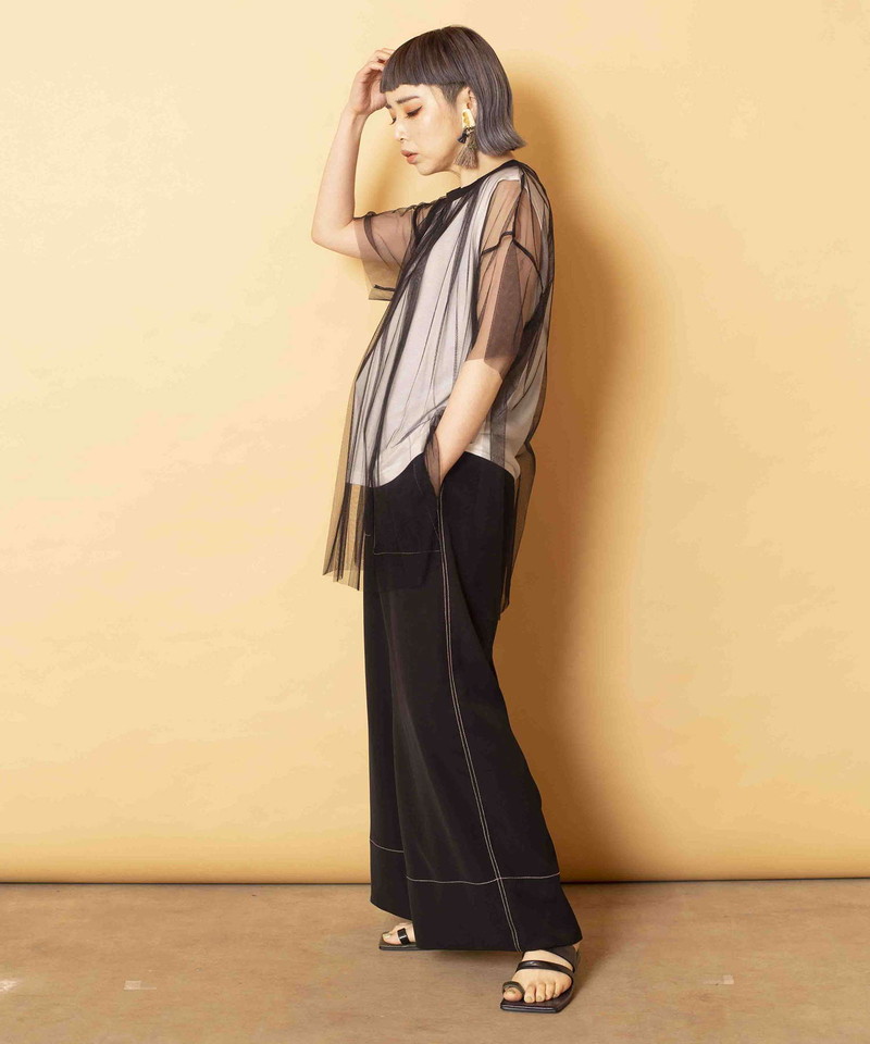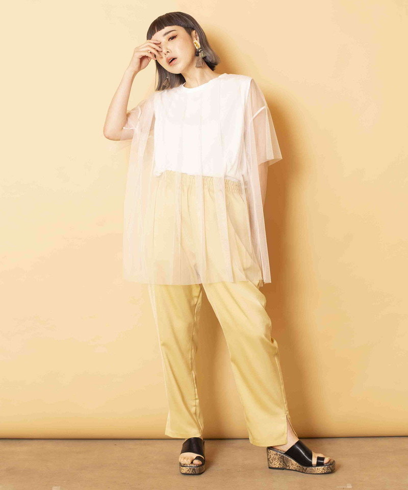 タンクトップにチュールをレイヤードしたエッジーな透け感が、旬のムード漂うオーバーチュールTシャツ。