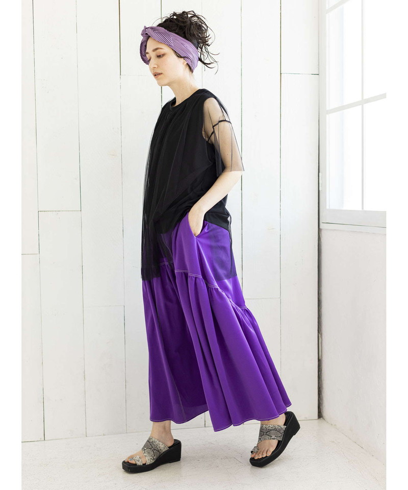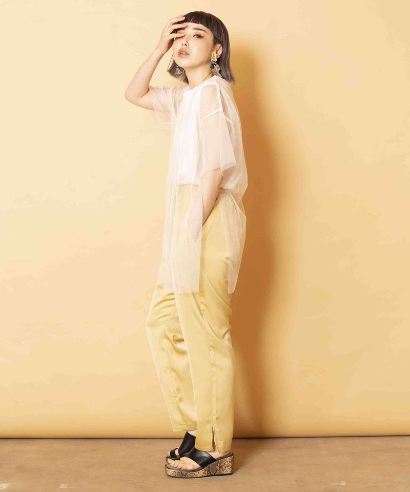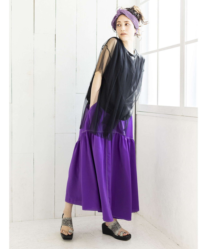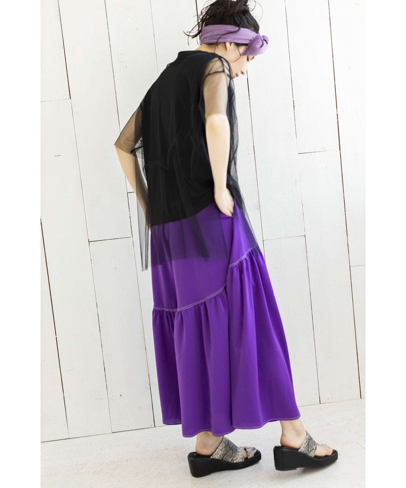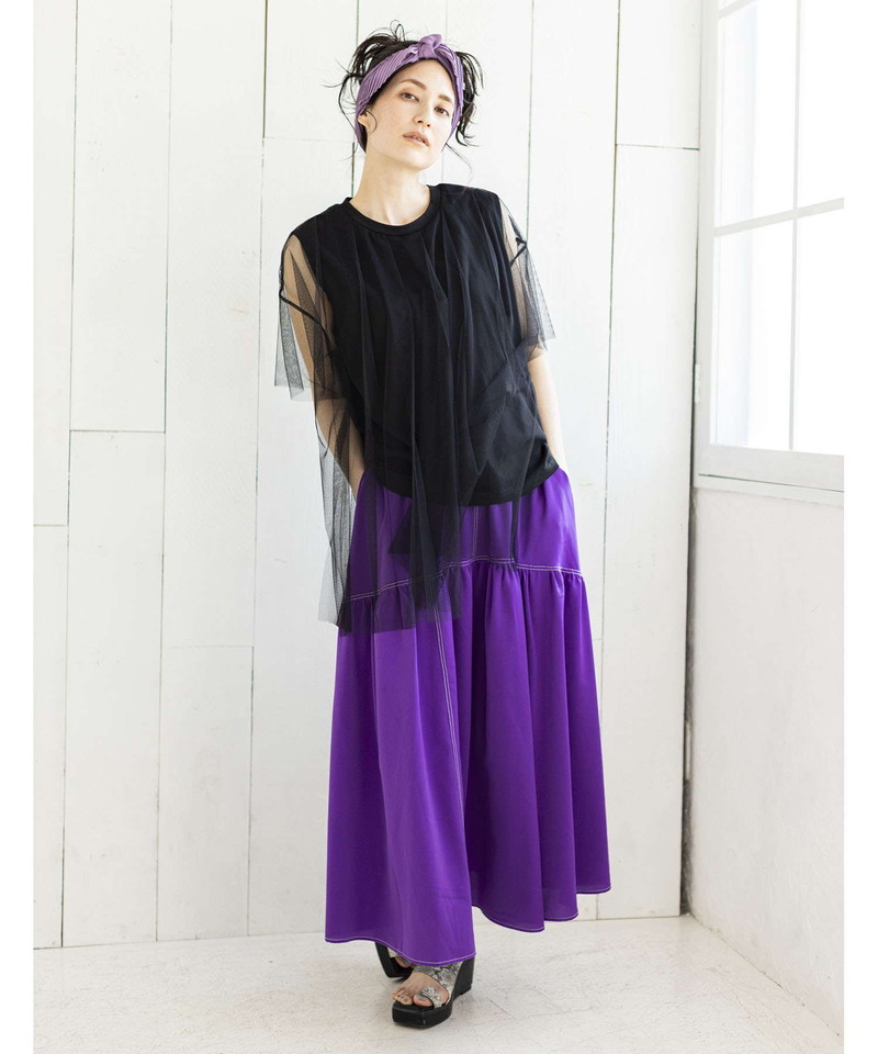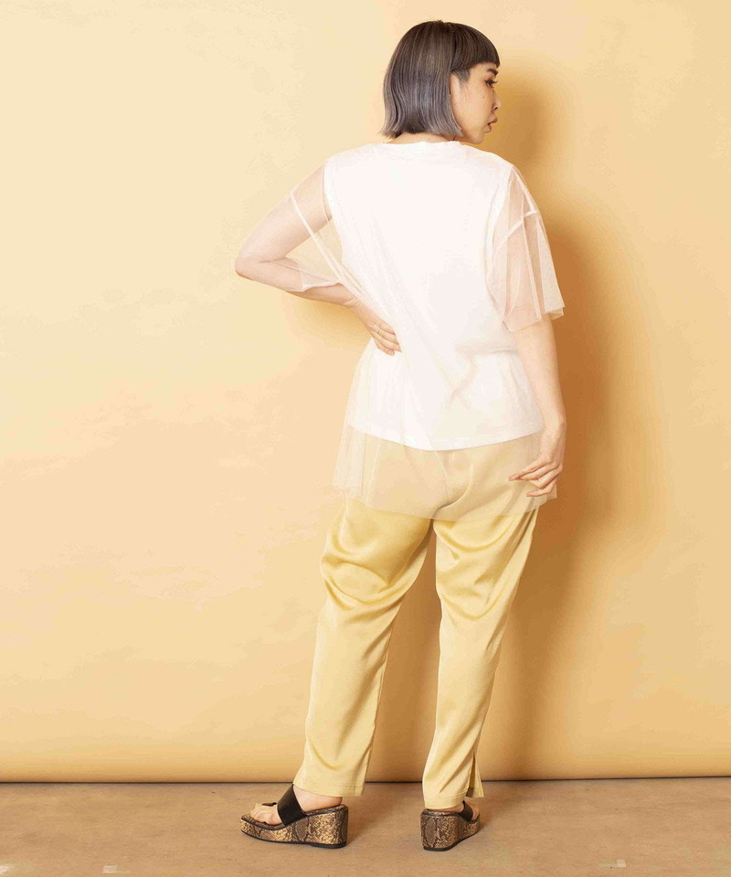 タンクトップにチュールをレイヤードしたエッジーな透け感が、旬のムード漂うオーバーチュールTシャツ。