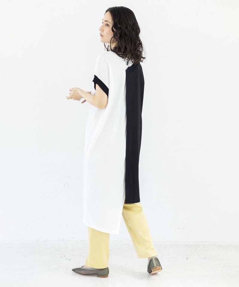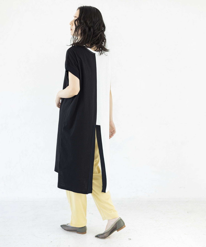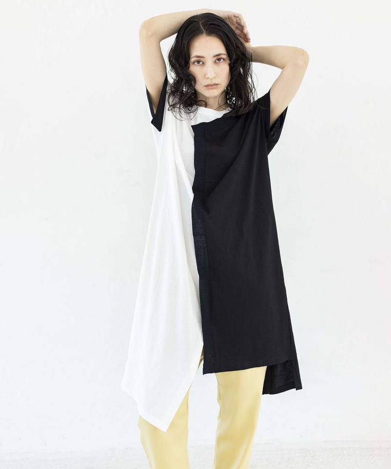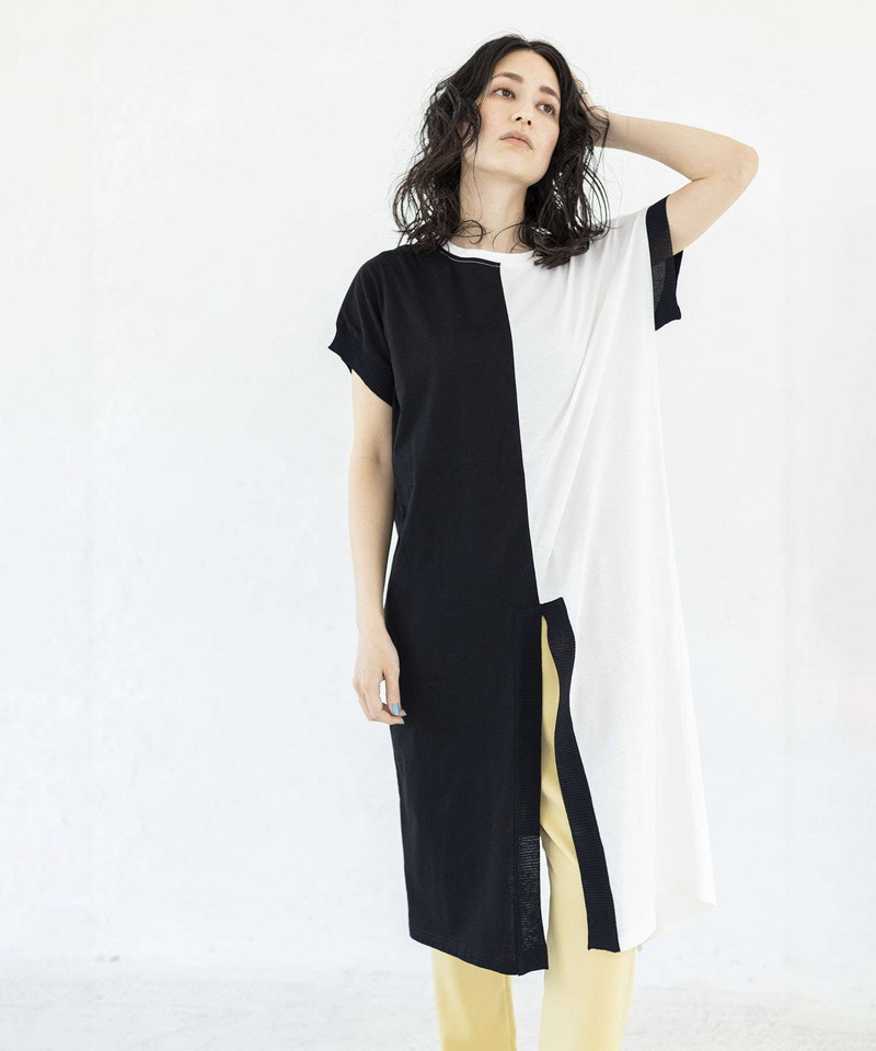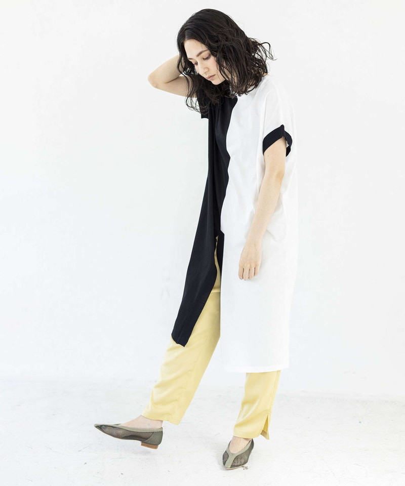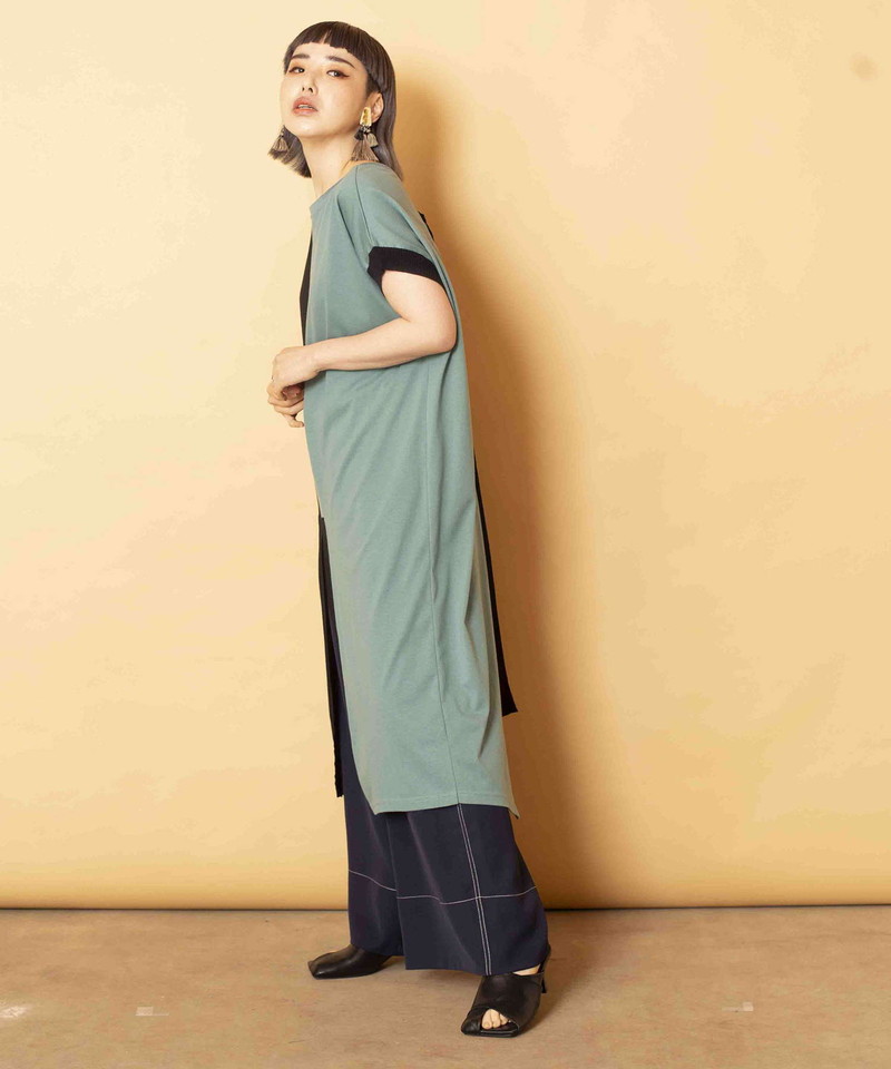 細長シルエットを強調し、異素材コンビのRIBがアクセントになったロングプルオーバー。