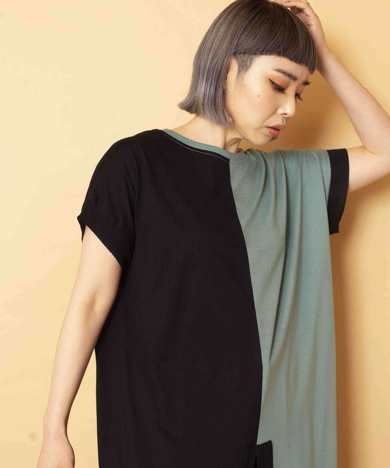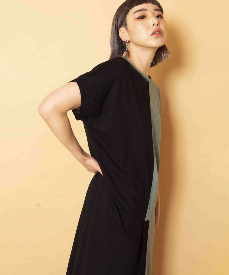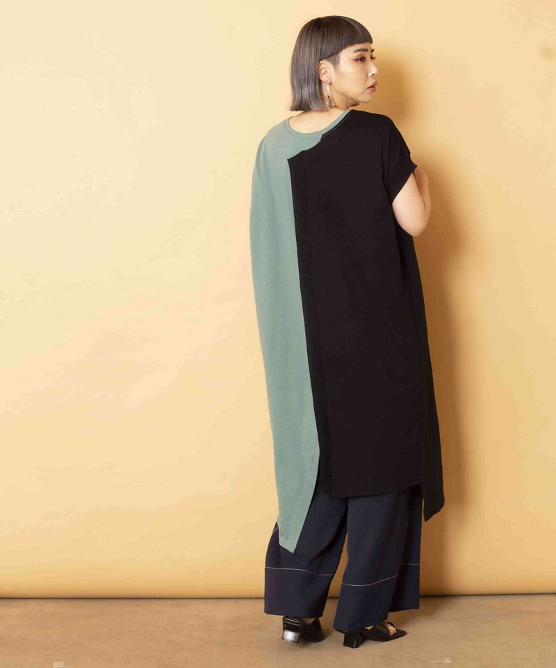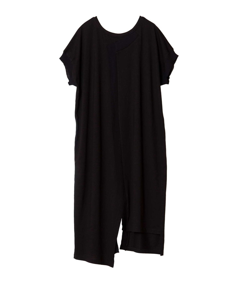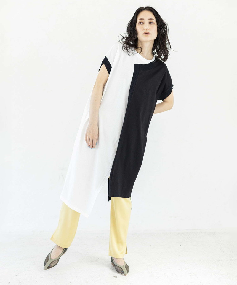 細長シルエットを強調し、異素材コンビのRIBがアクセントになったロングプルオーバー。