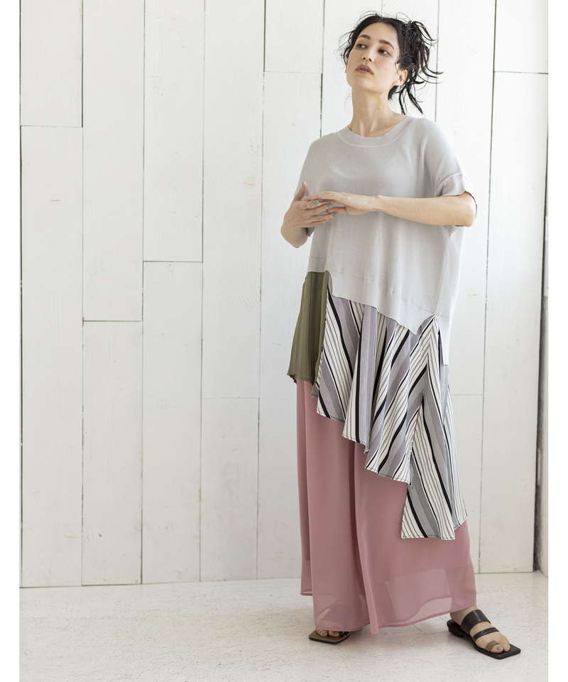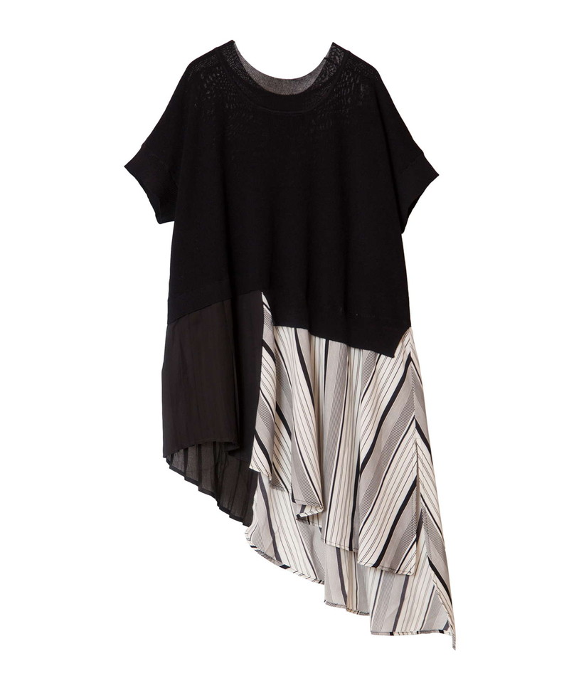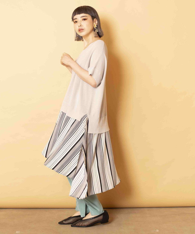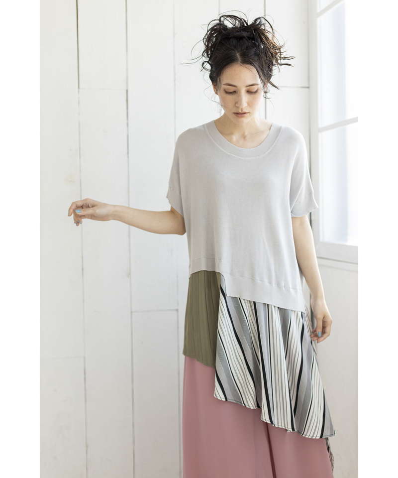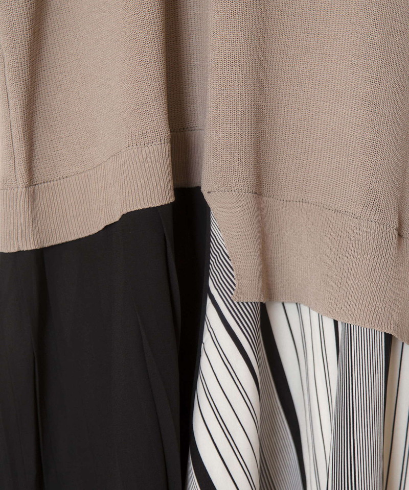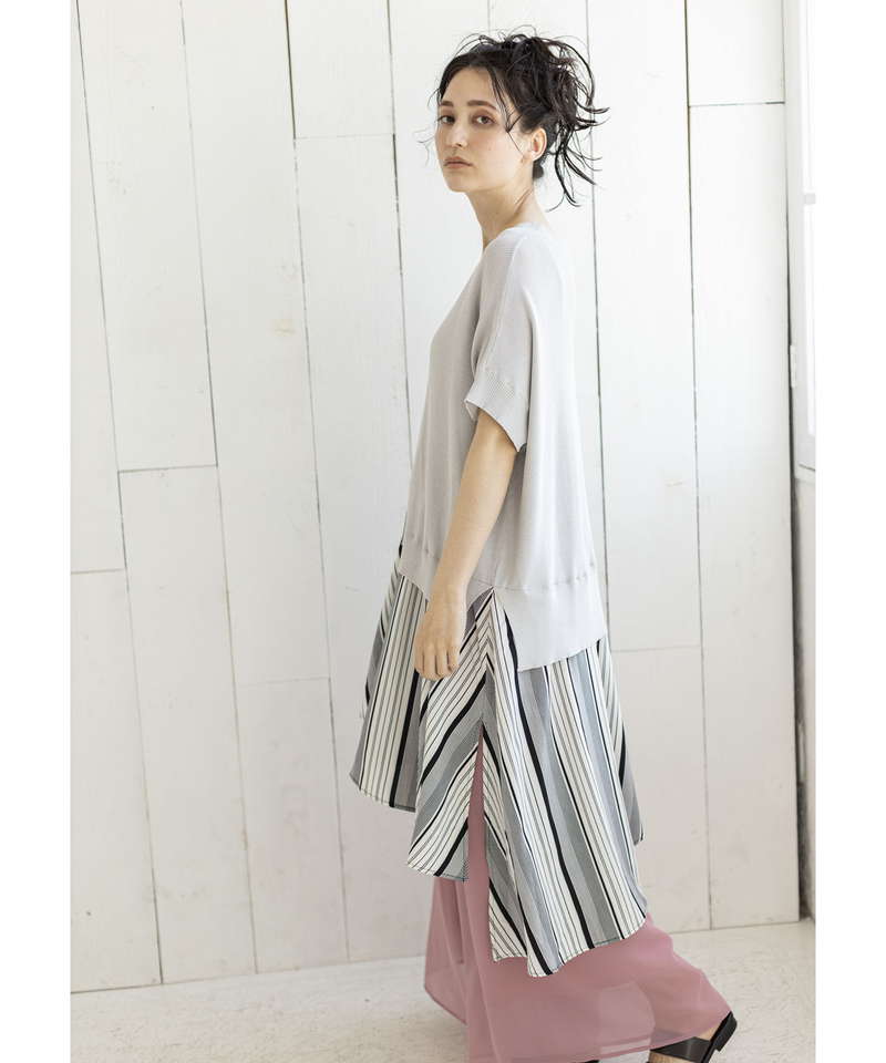 裾のストライプが印象的な異素材切替のニットプルオーバー。