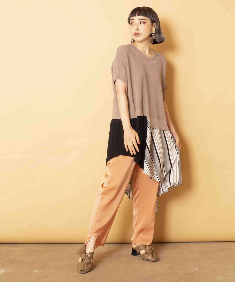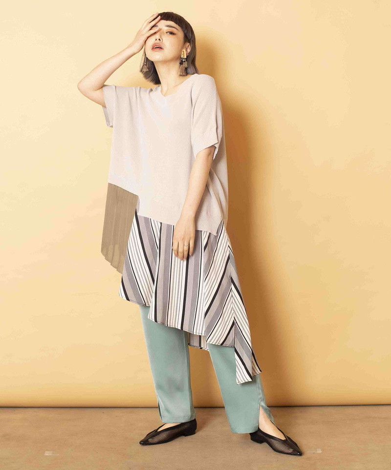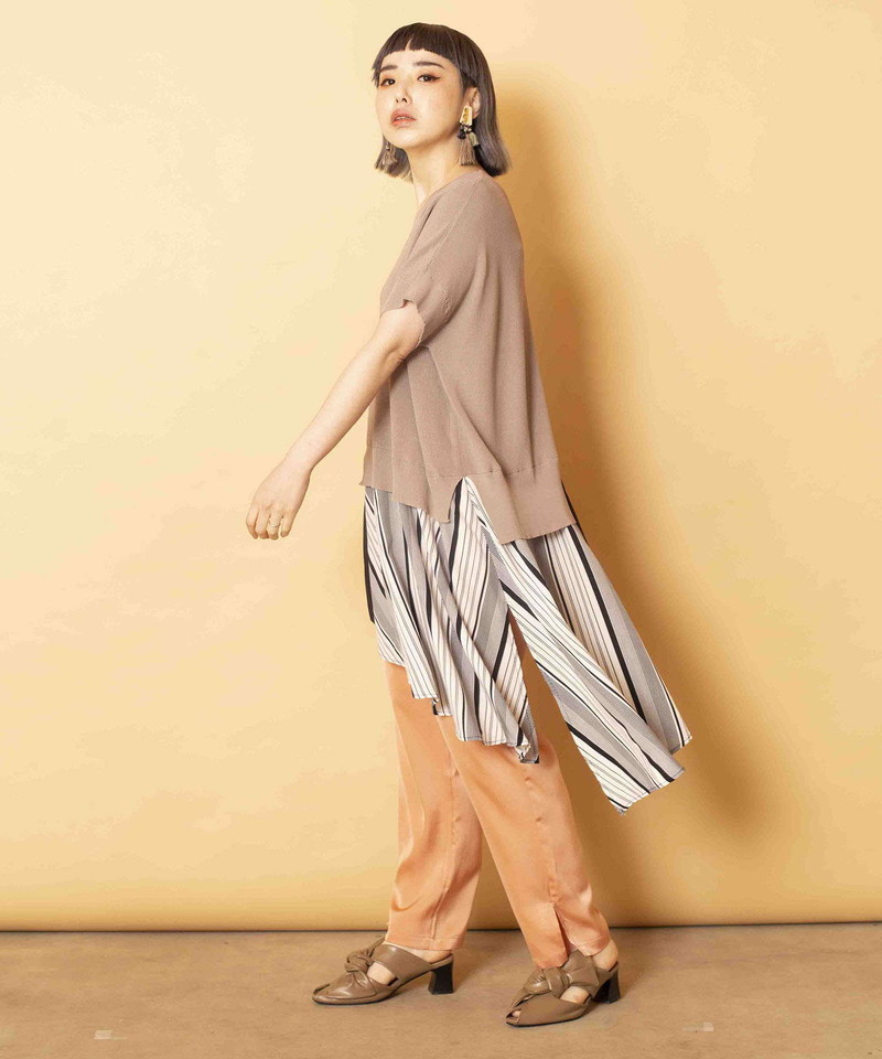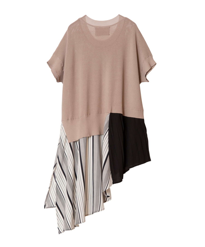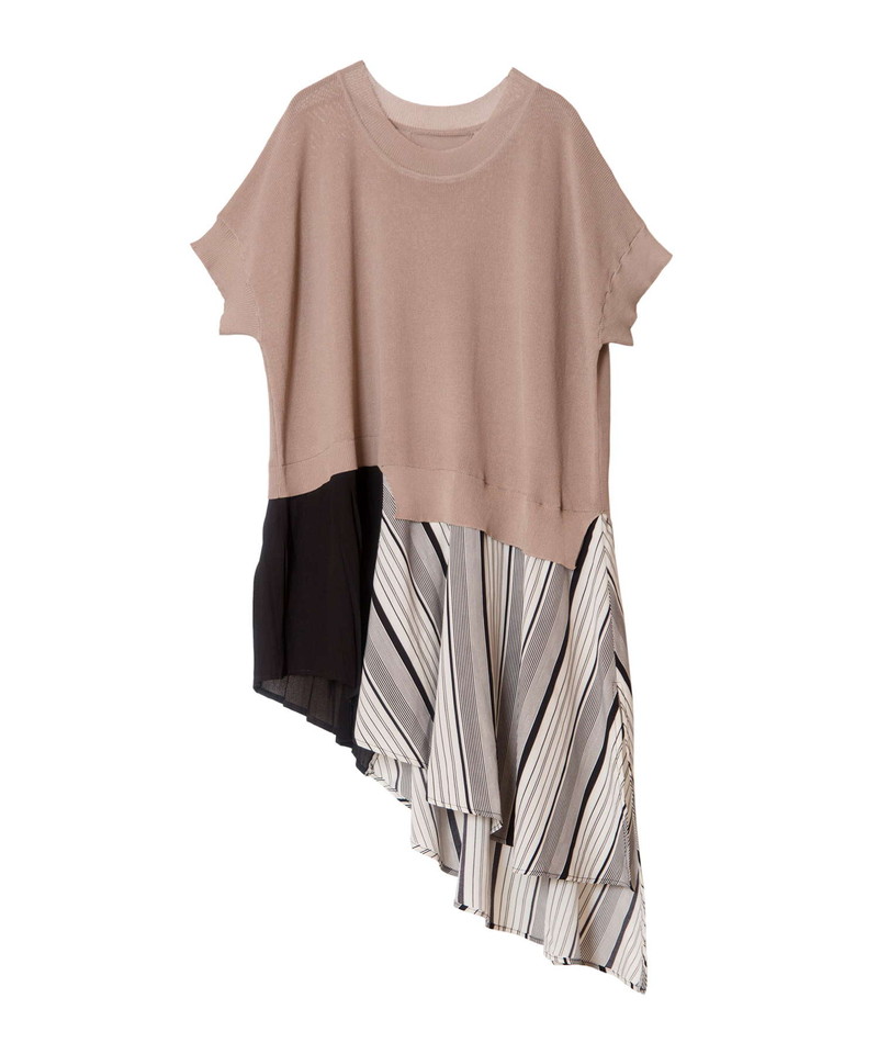 裾のストライプが印象的な異素材切替のニットプルオーバー。