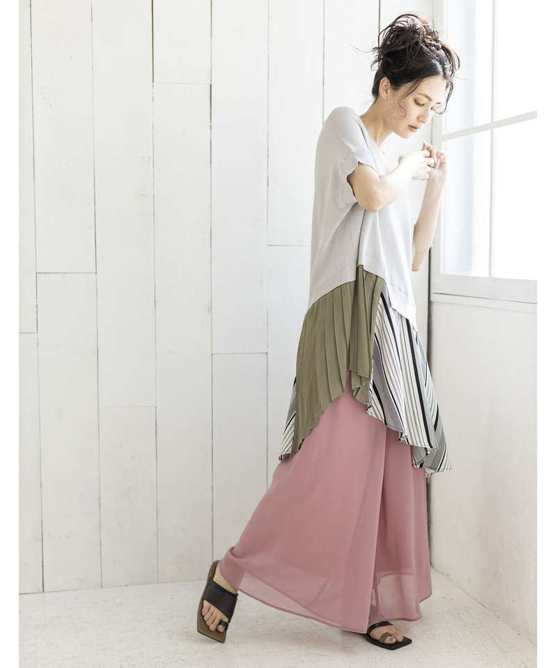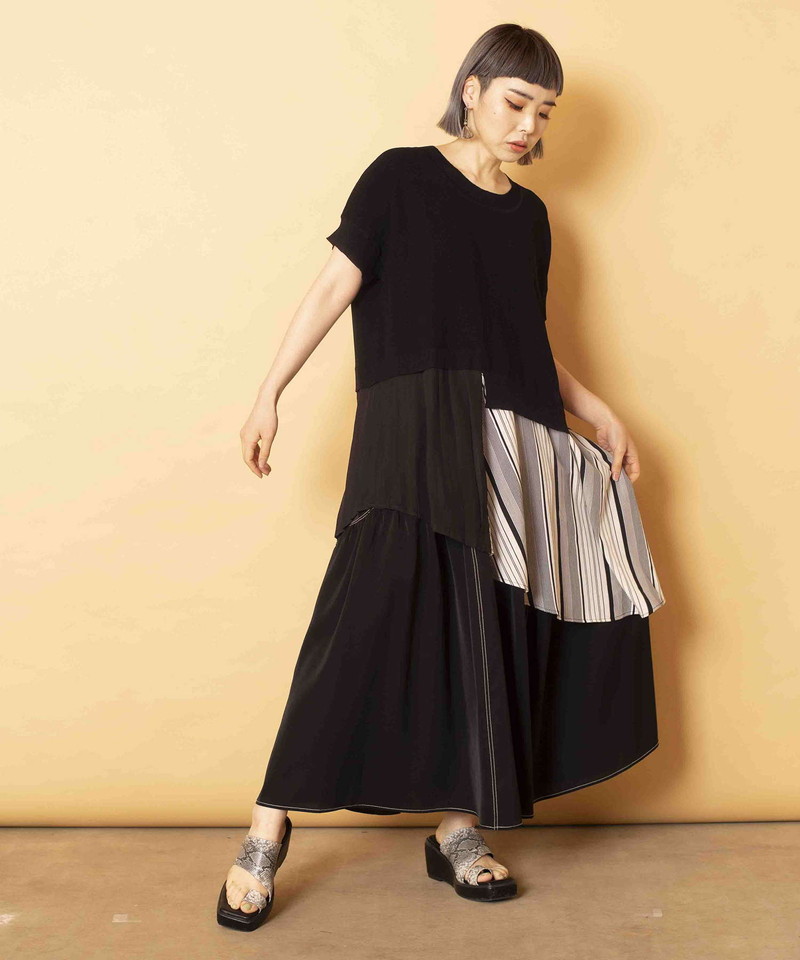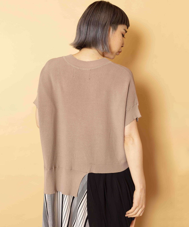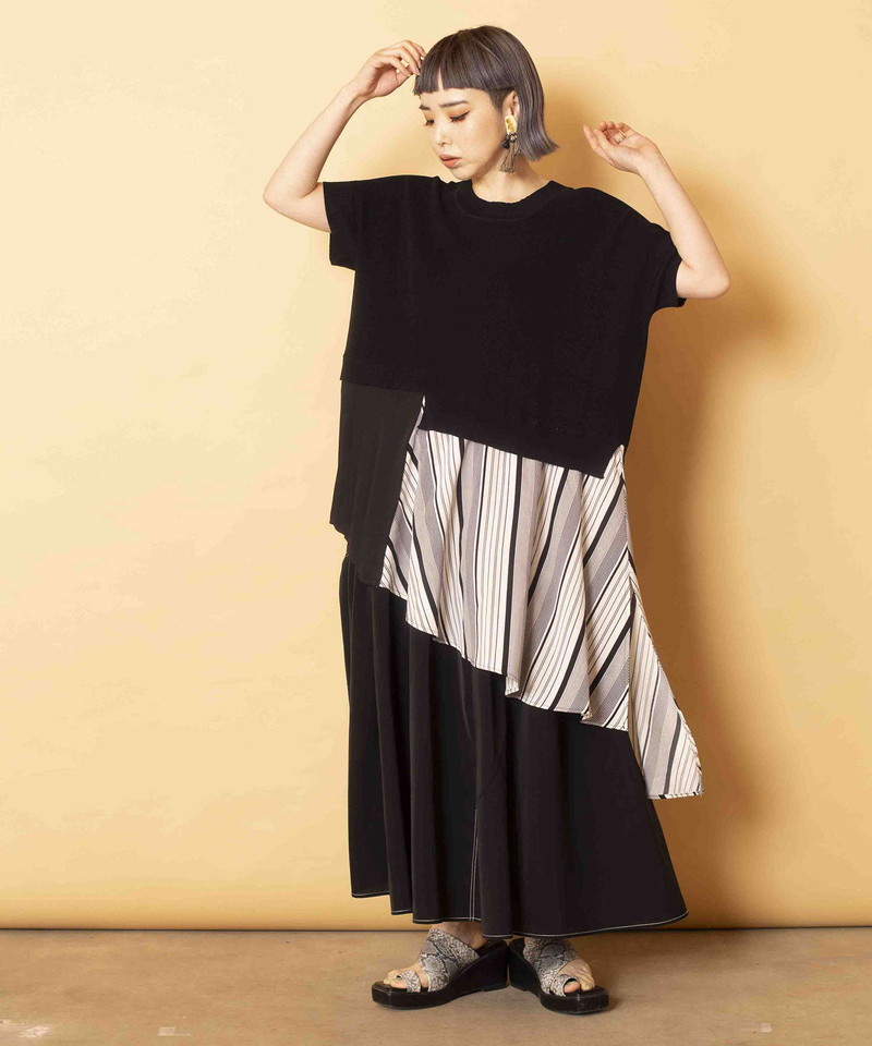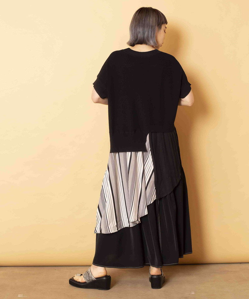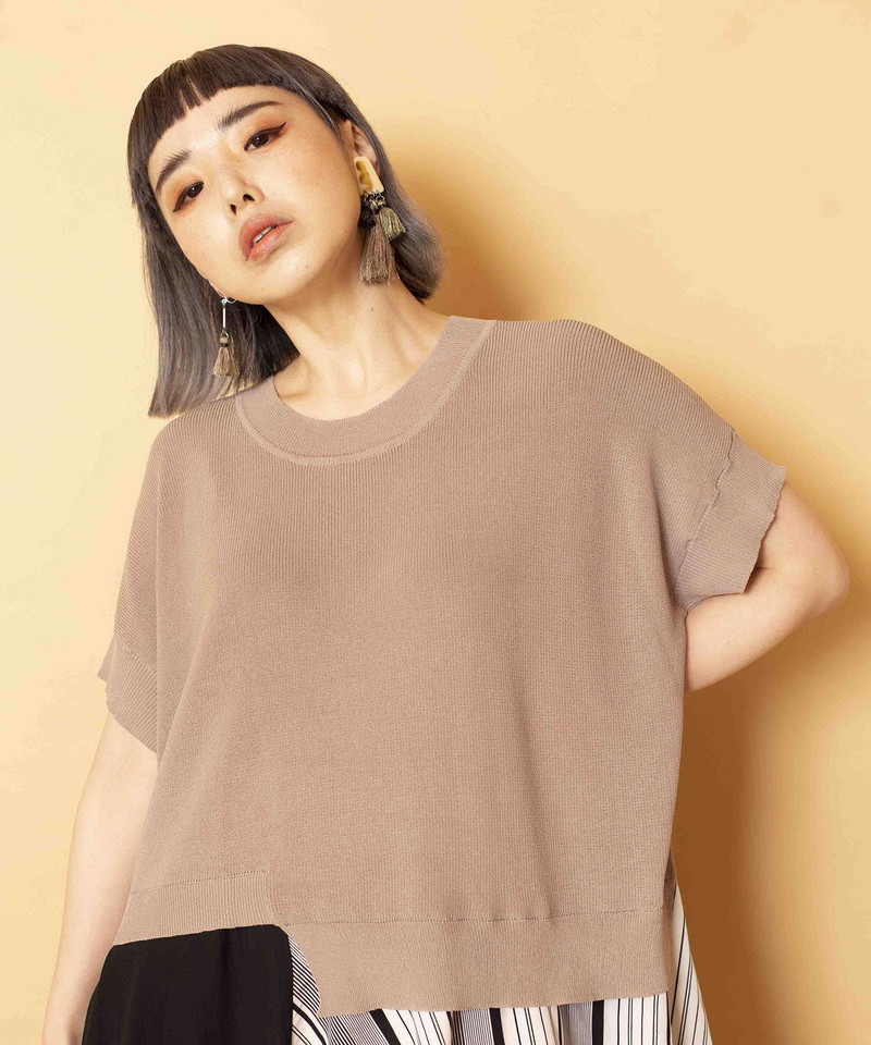 裾のストライプが印象的な異素材切替のニットプルオーバー。
