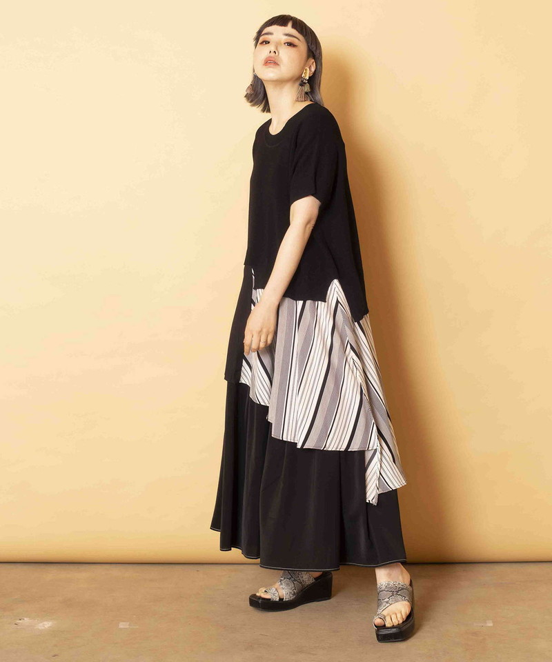 お腹周りを隠してくれる体系カバーと、インパクトのあるデザイン映えのバランスを両立した1枚。