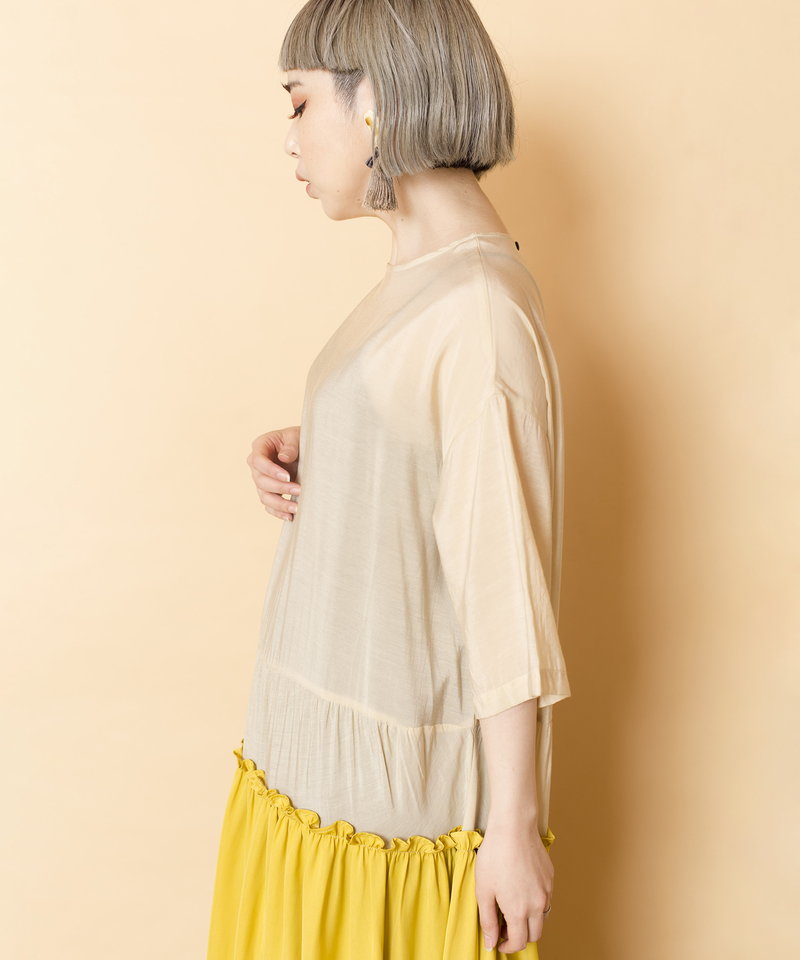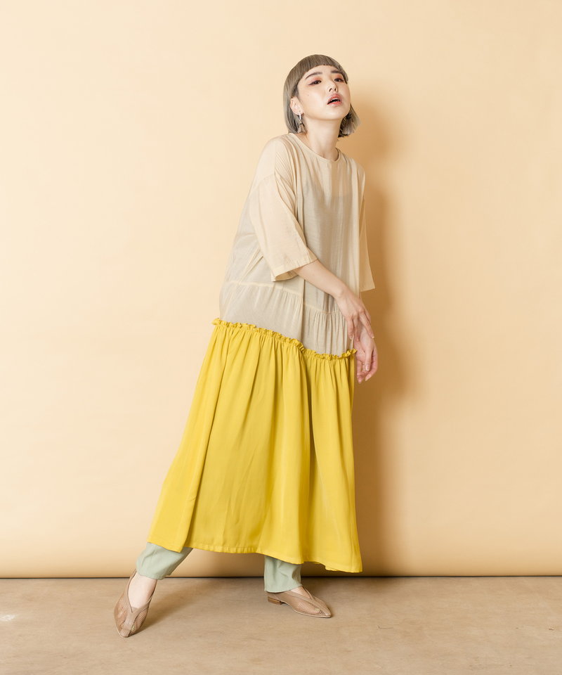 ボリュームのあるギャザー切替で、程よい甘さをだしつつも、すっきりと大人フェミニンに着られる立体シルエットが好バランス。