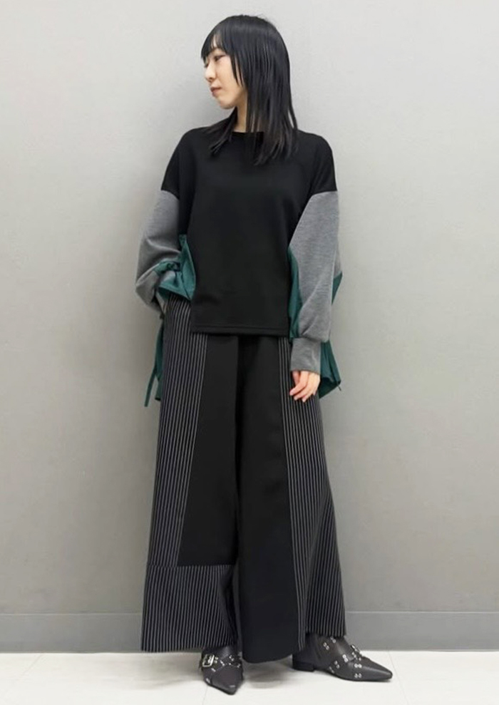 脚のラインが響きにくいワイドシルエットに、ストライプの切替で?Tラインを強調。