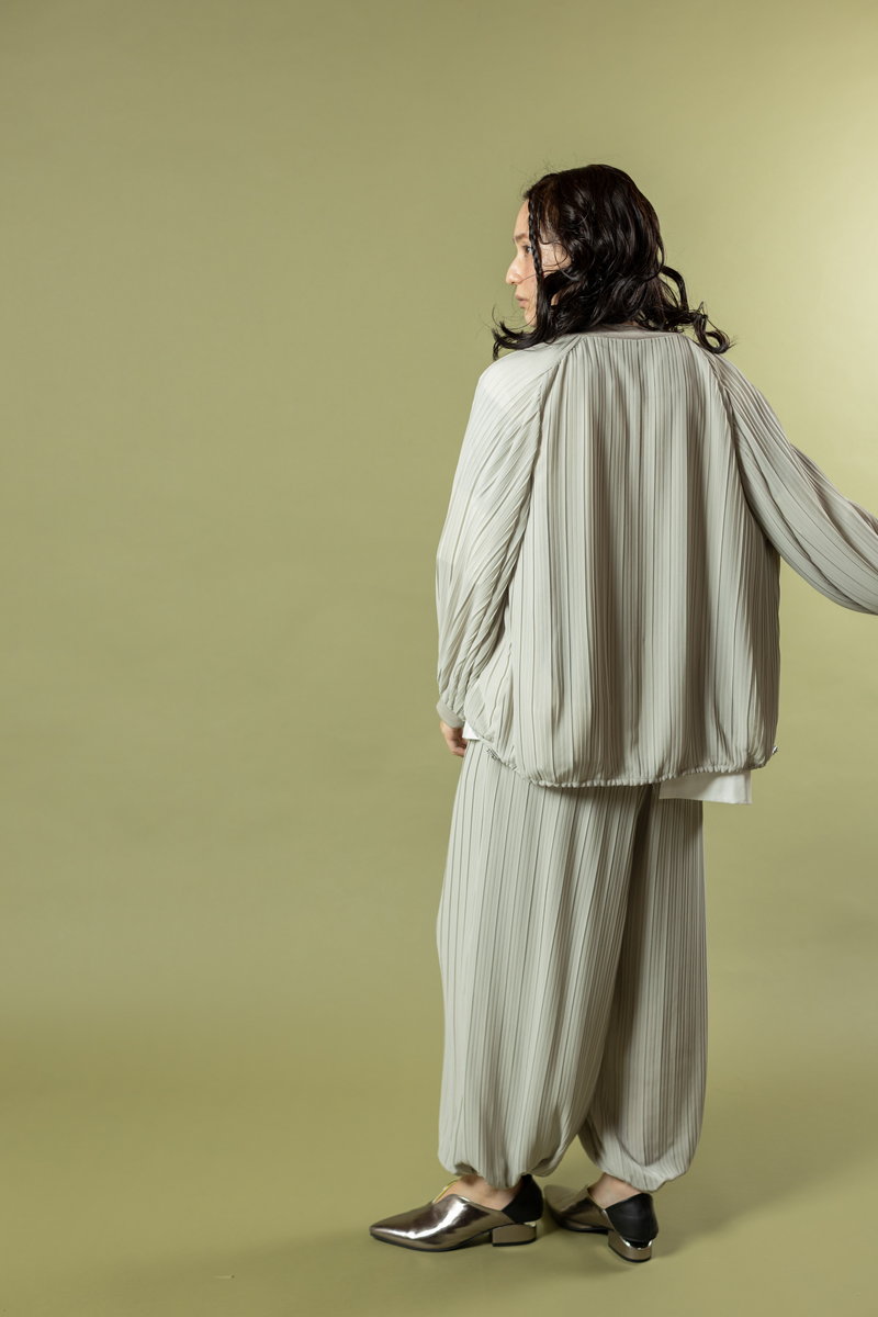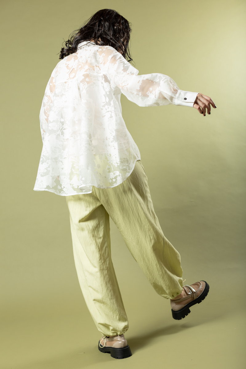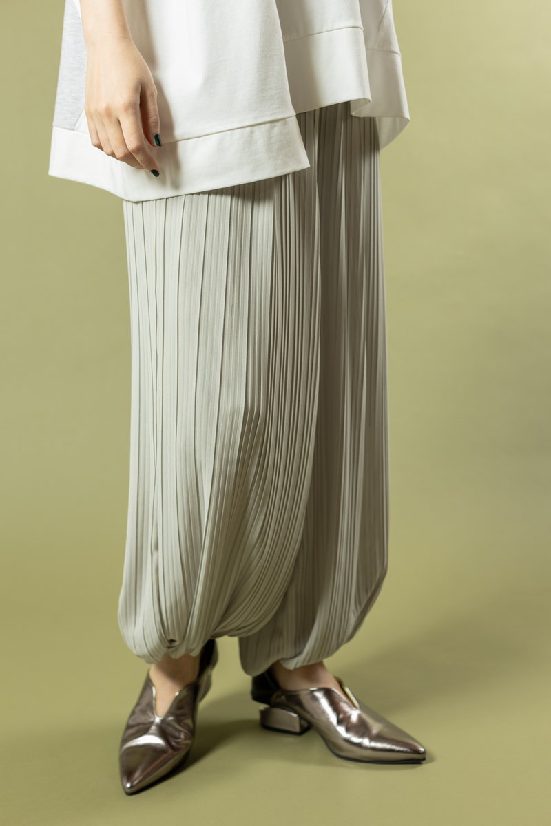 adding rhythm to the outfit with relaxed harem pants.
