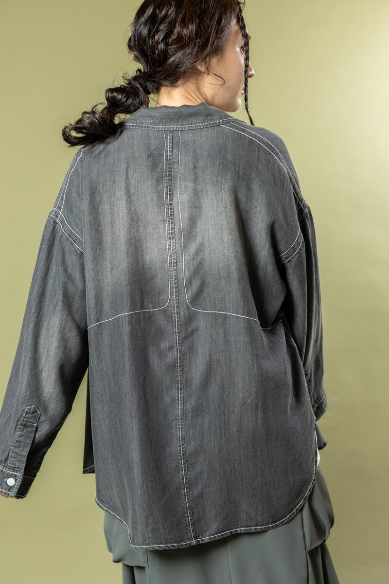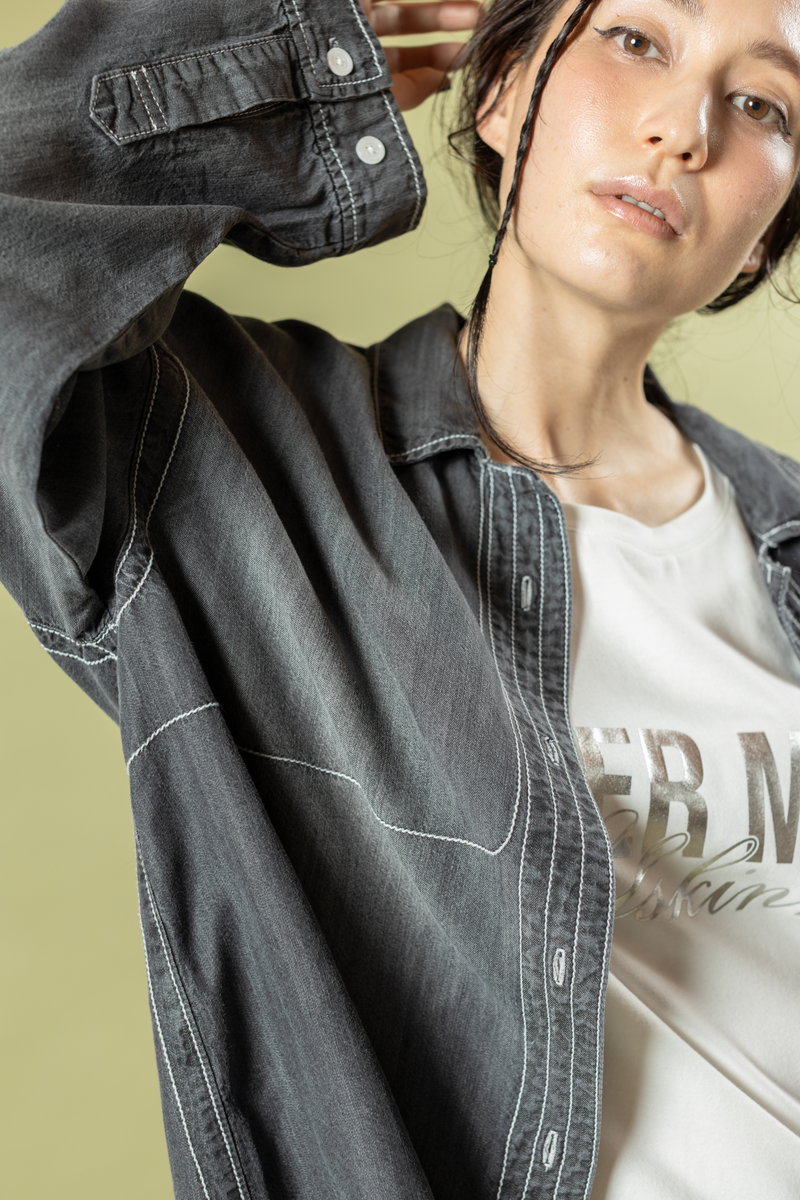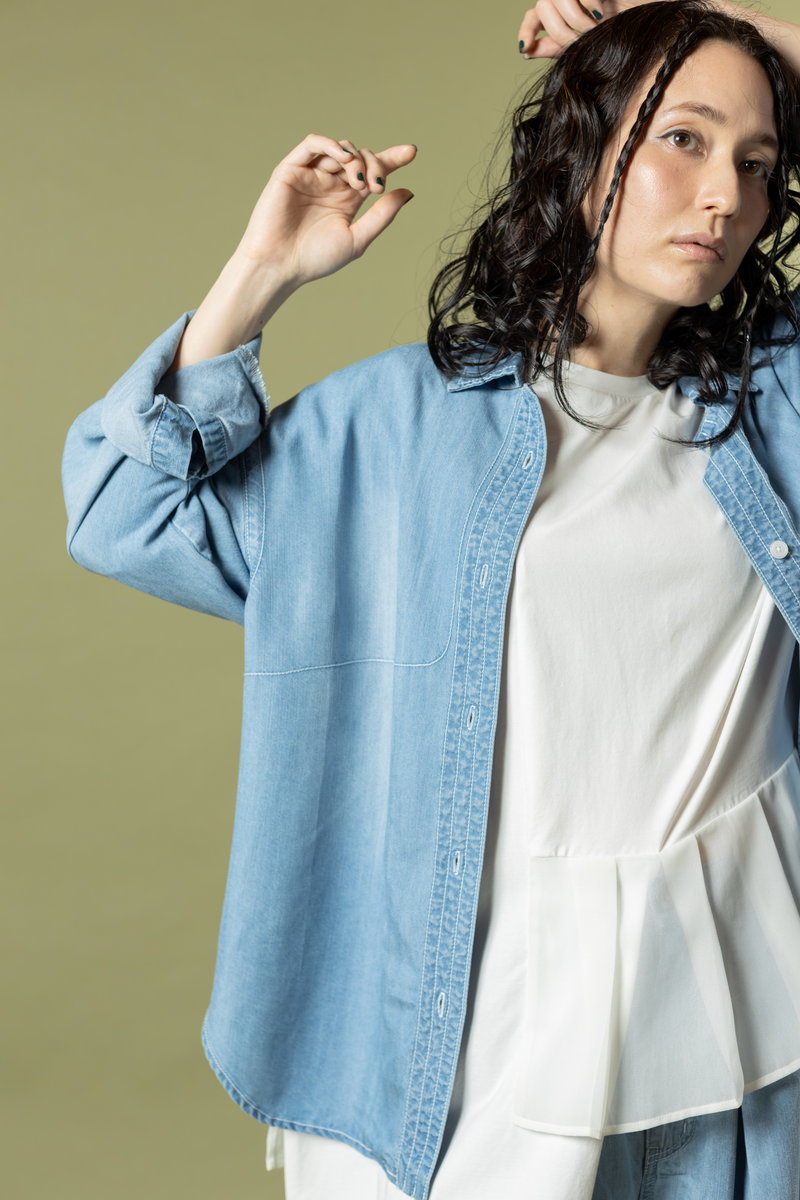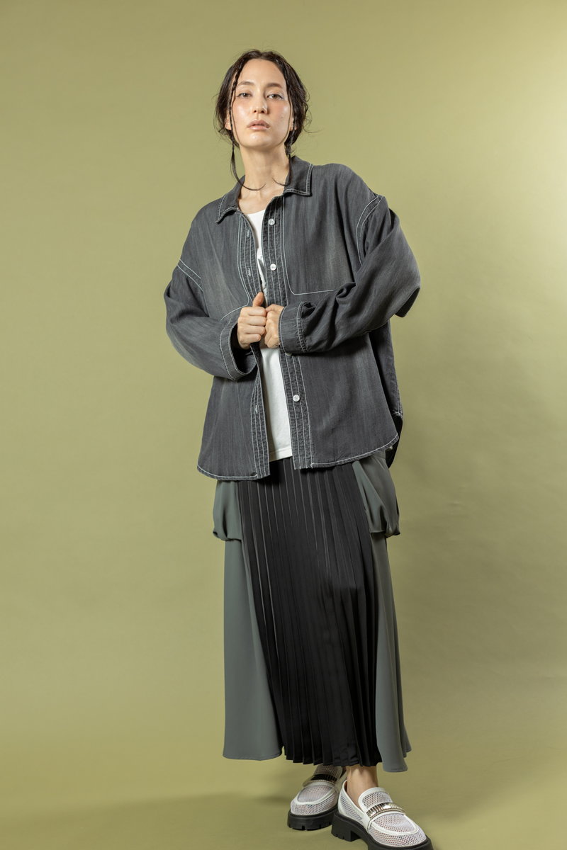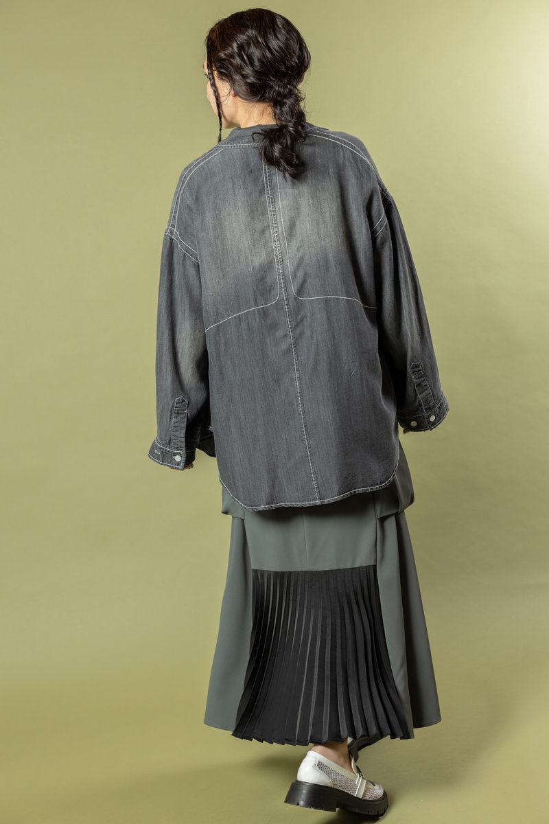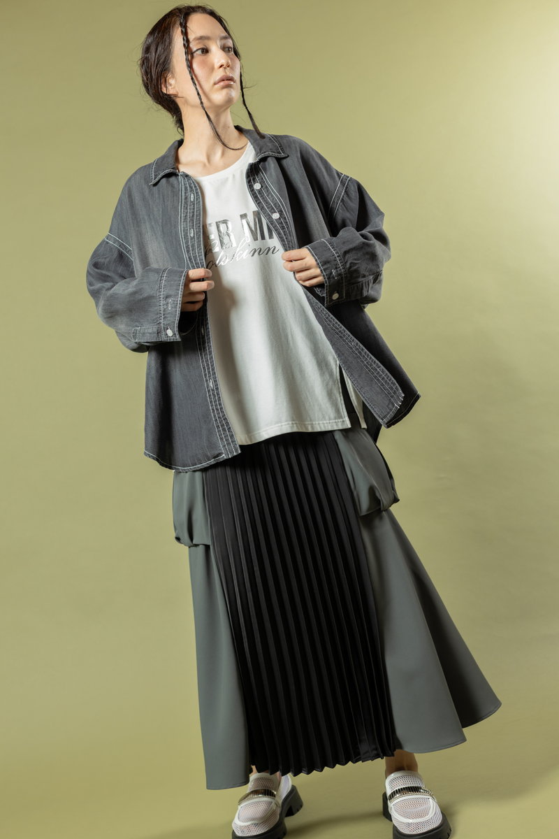 A denim shirt styled casually over a geeky skirt,