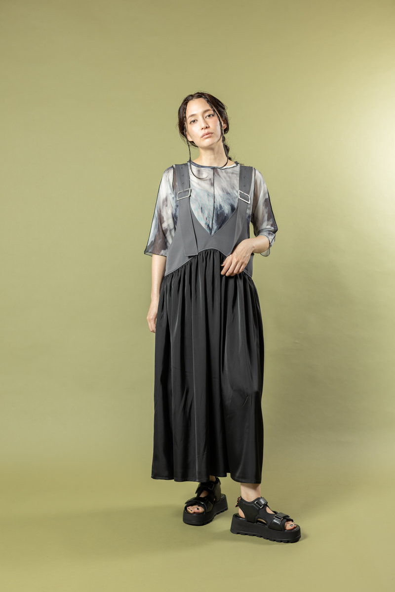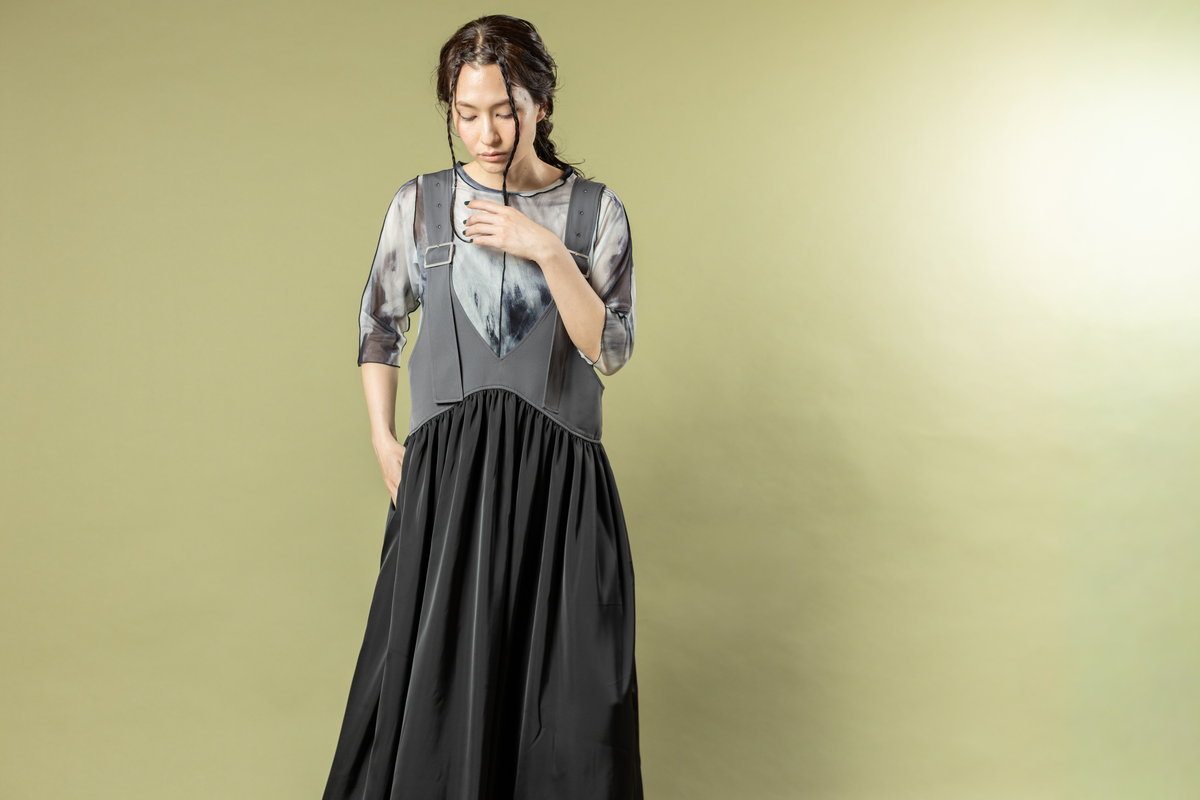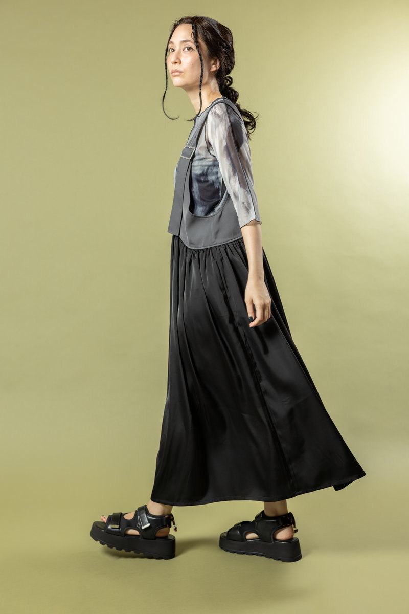 A salopette dress with a matte sheen and softly swaying flared sections,