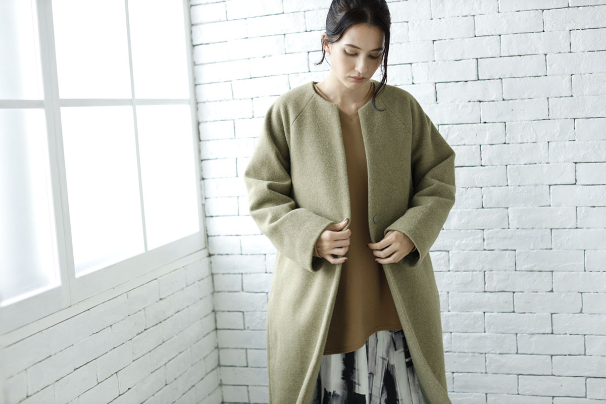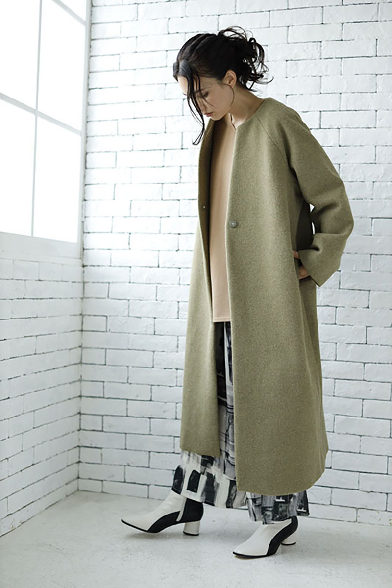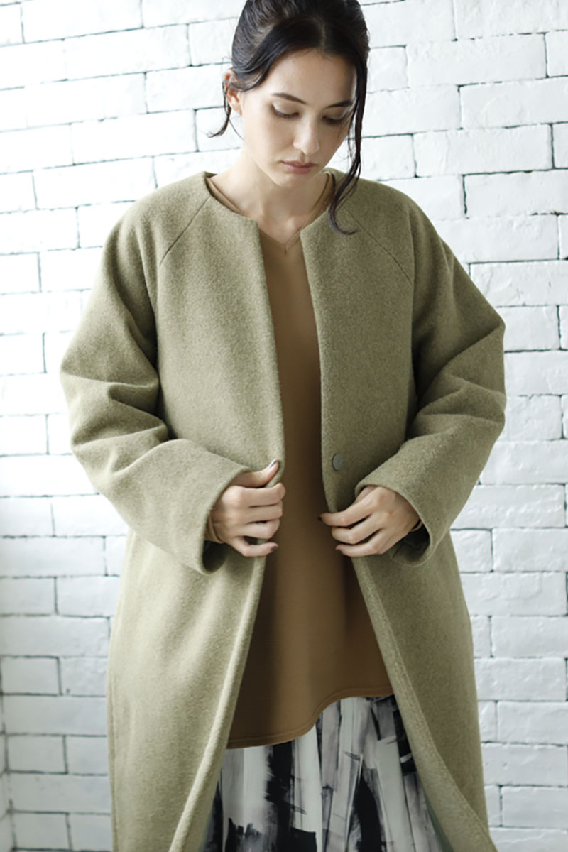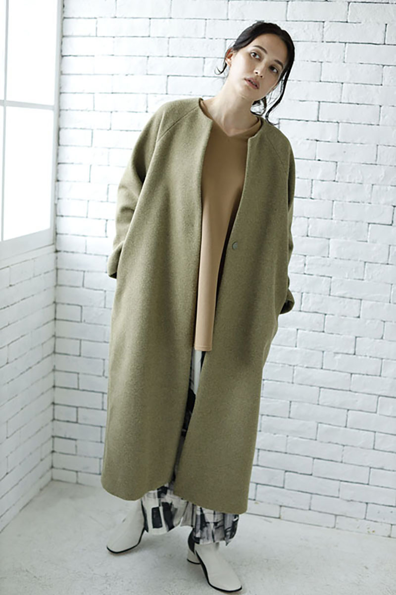 スタンダードなノーカラーコートは、