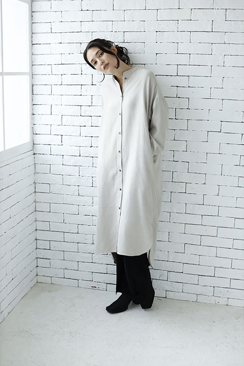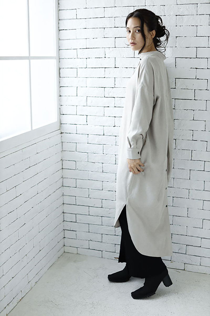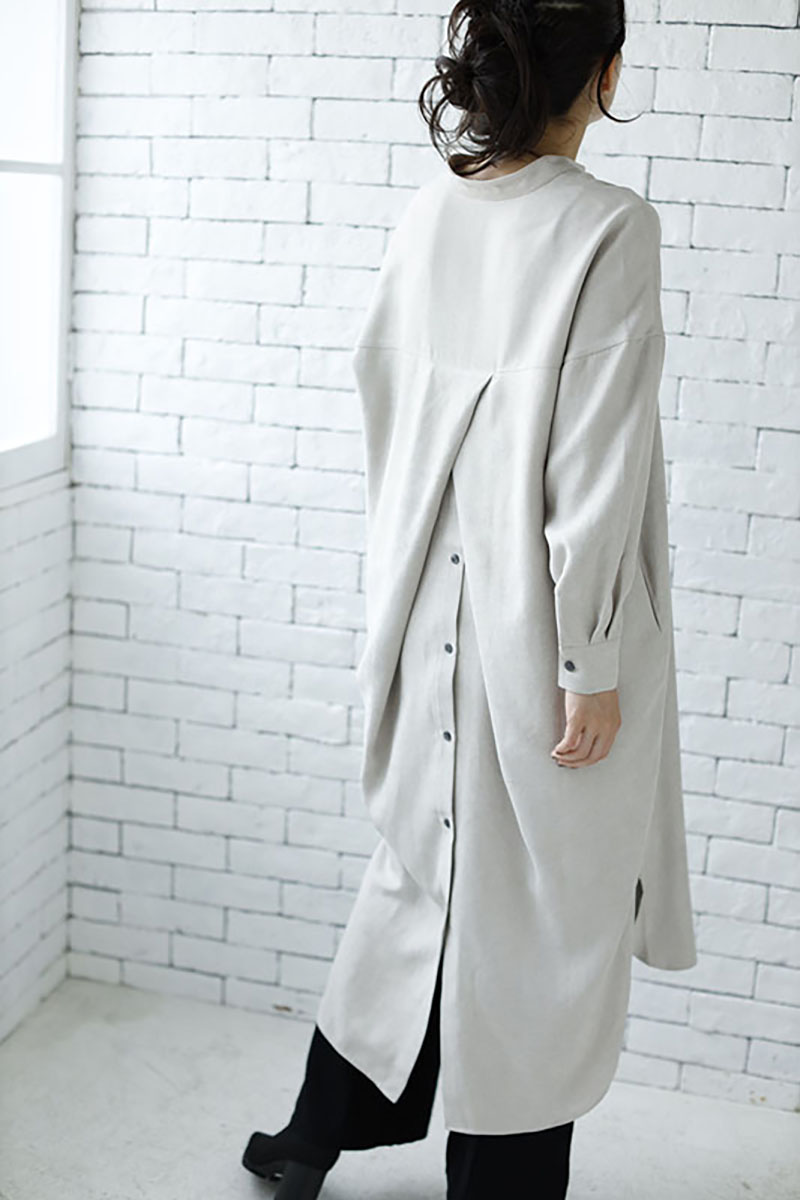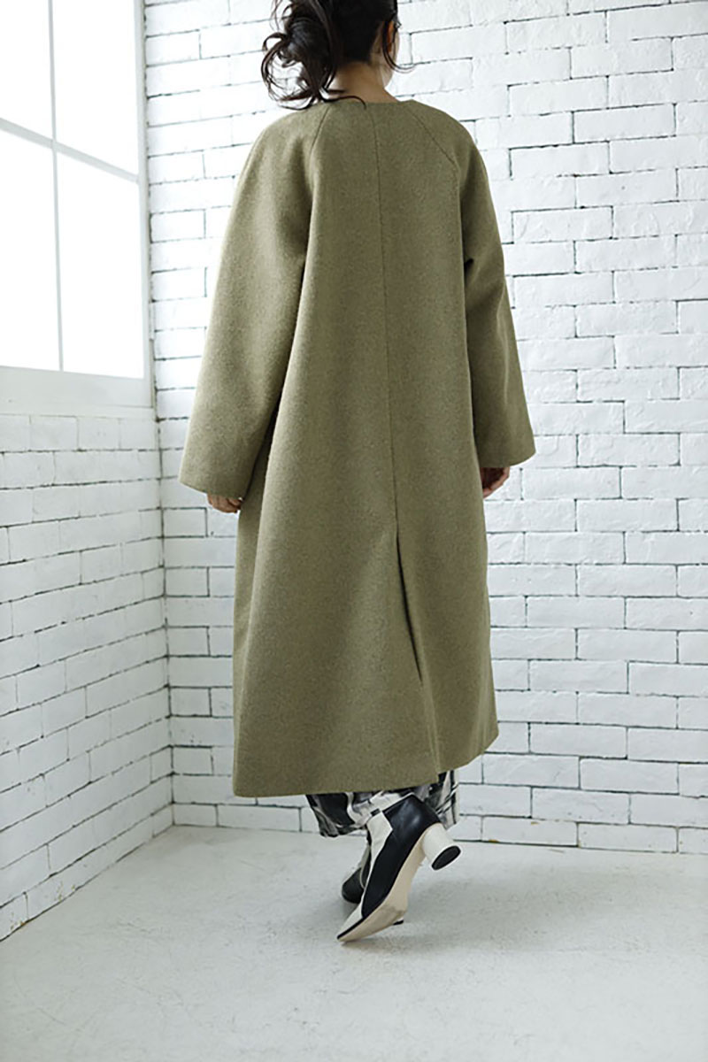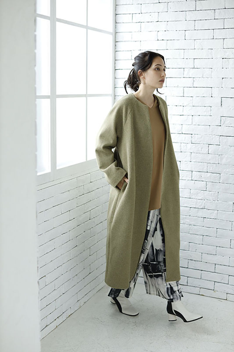 スタンダードなノーカラーコートは、