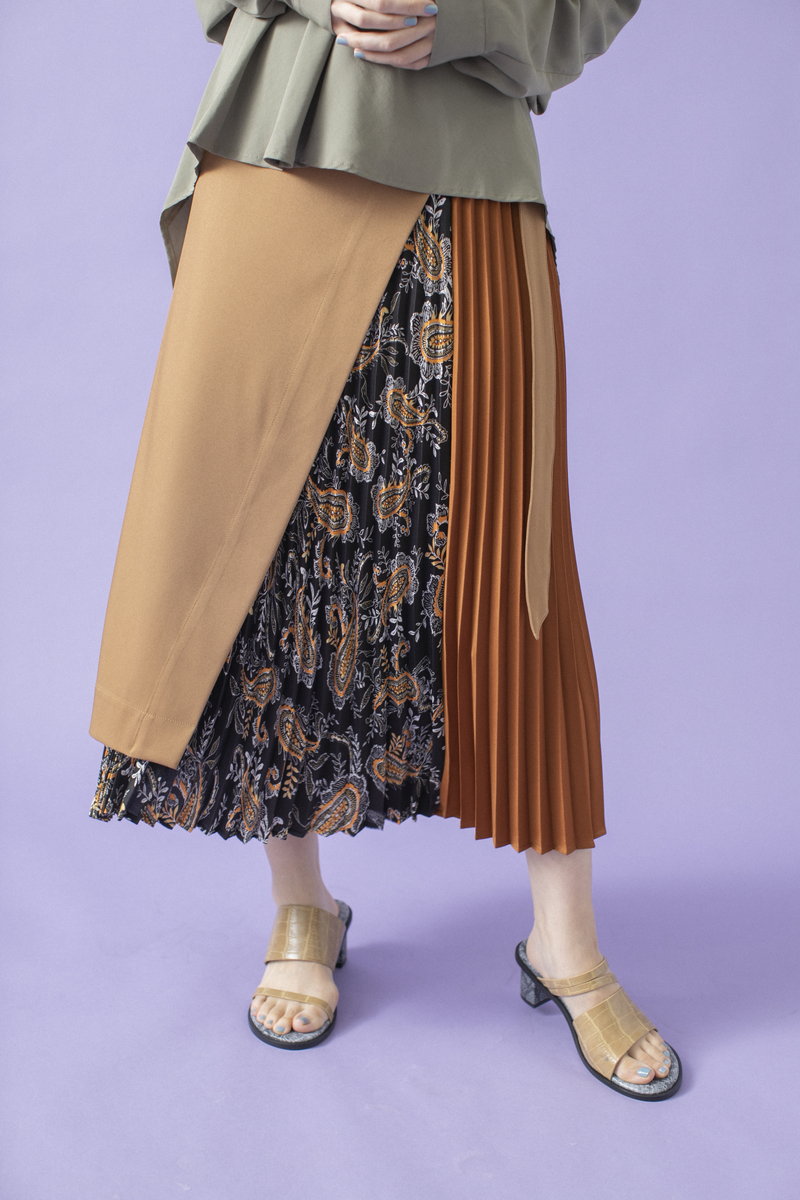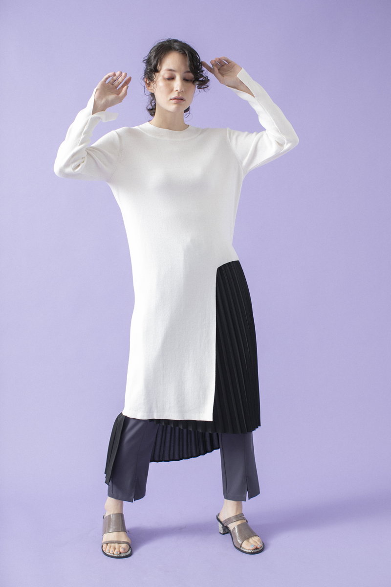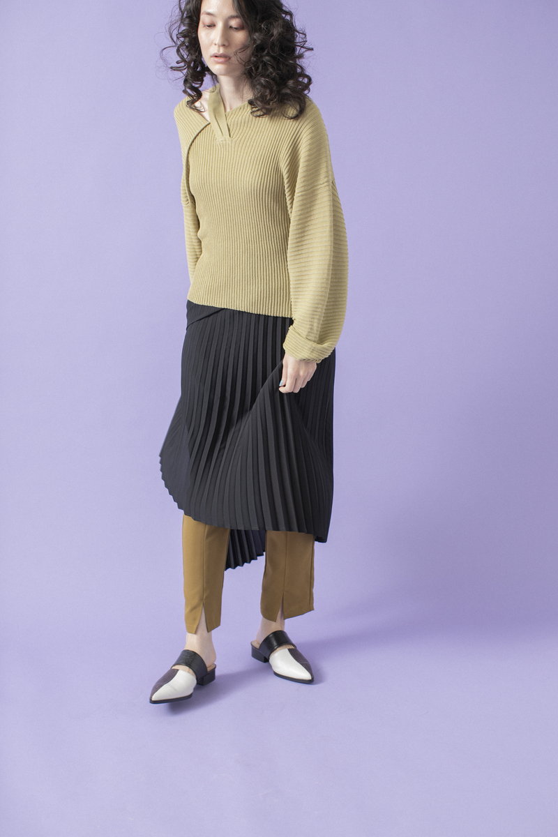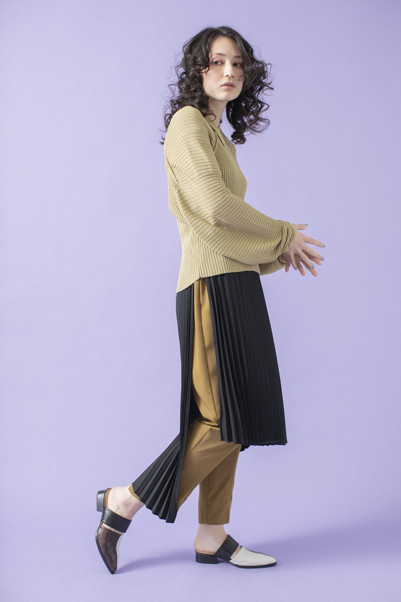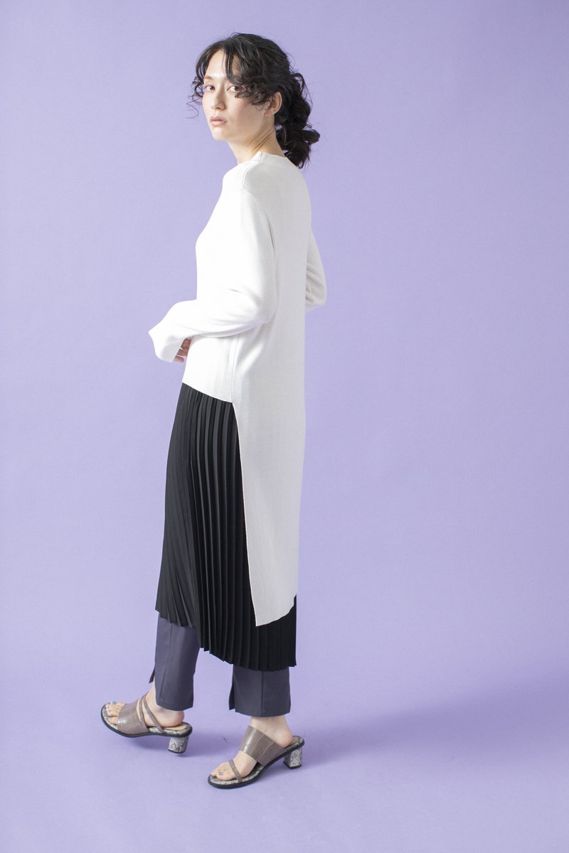 プリーツスカートで緊張感とリズムを与えて。