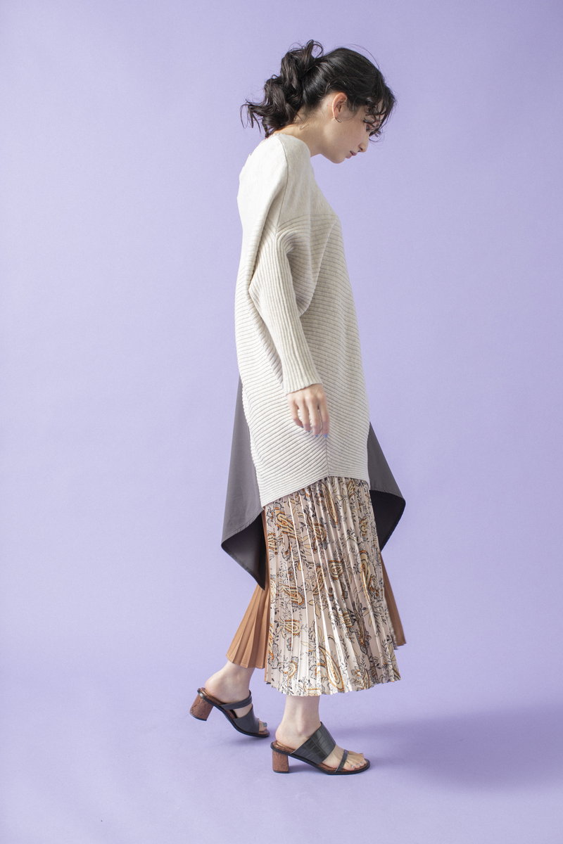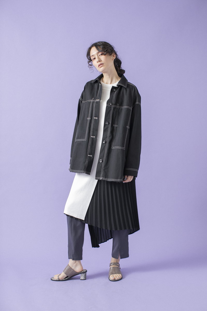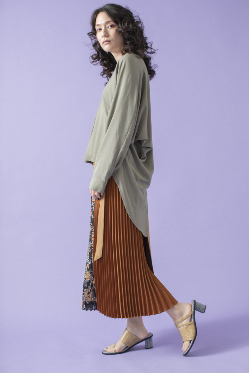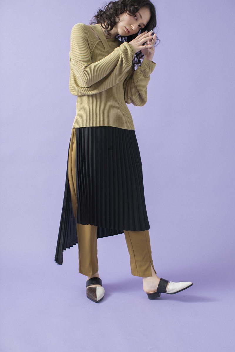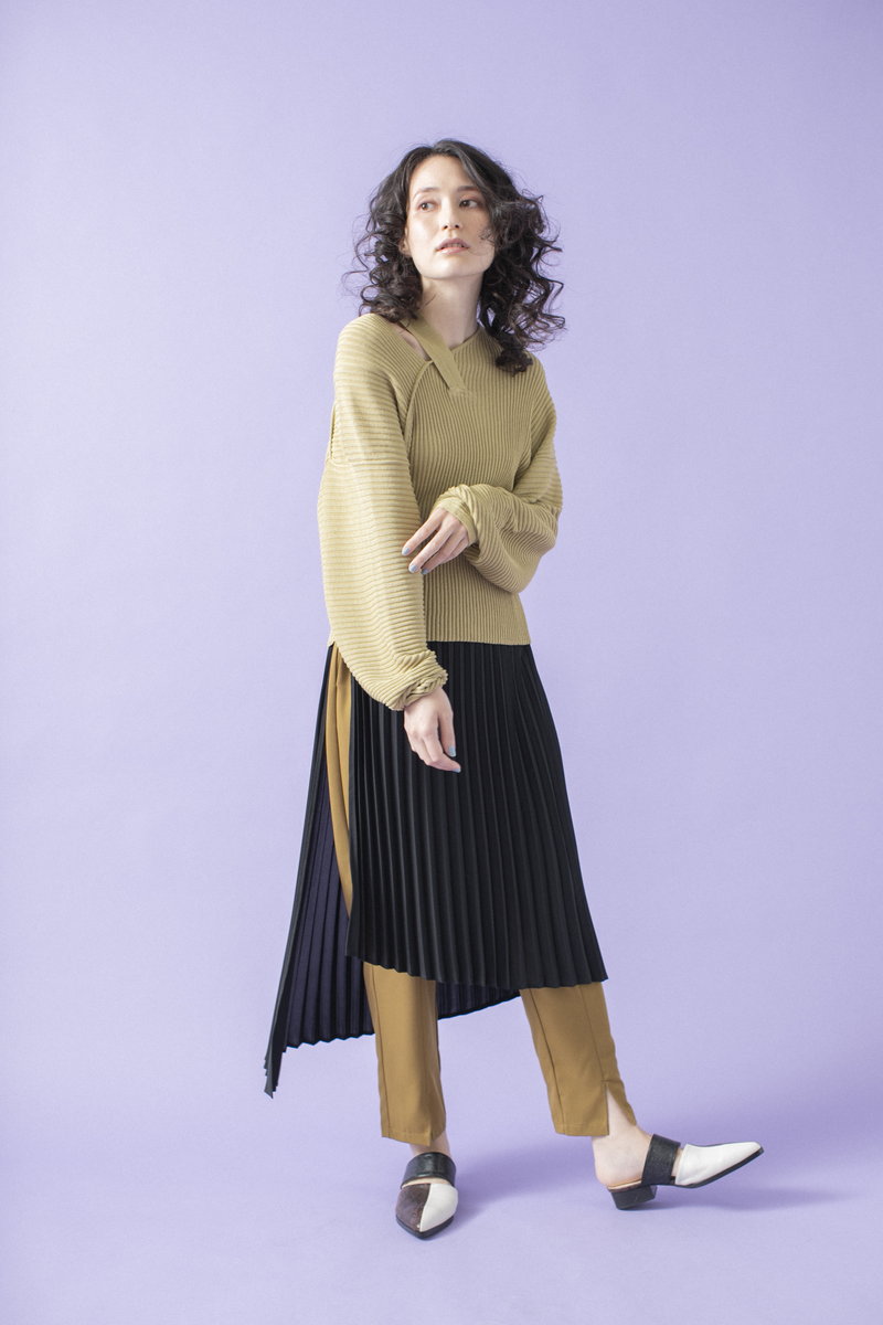 プリーツスカートで緊張感とリズムを与えて。