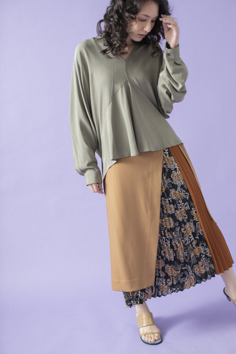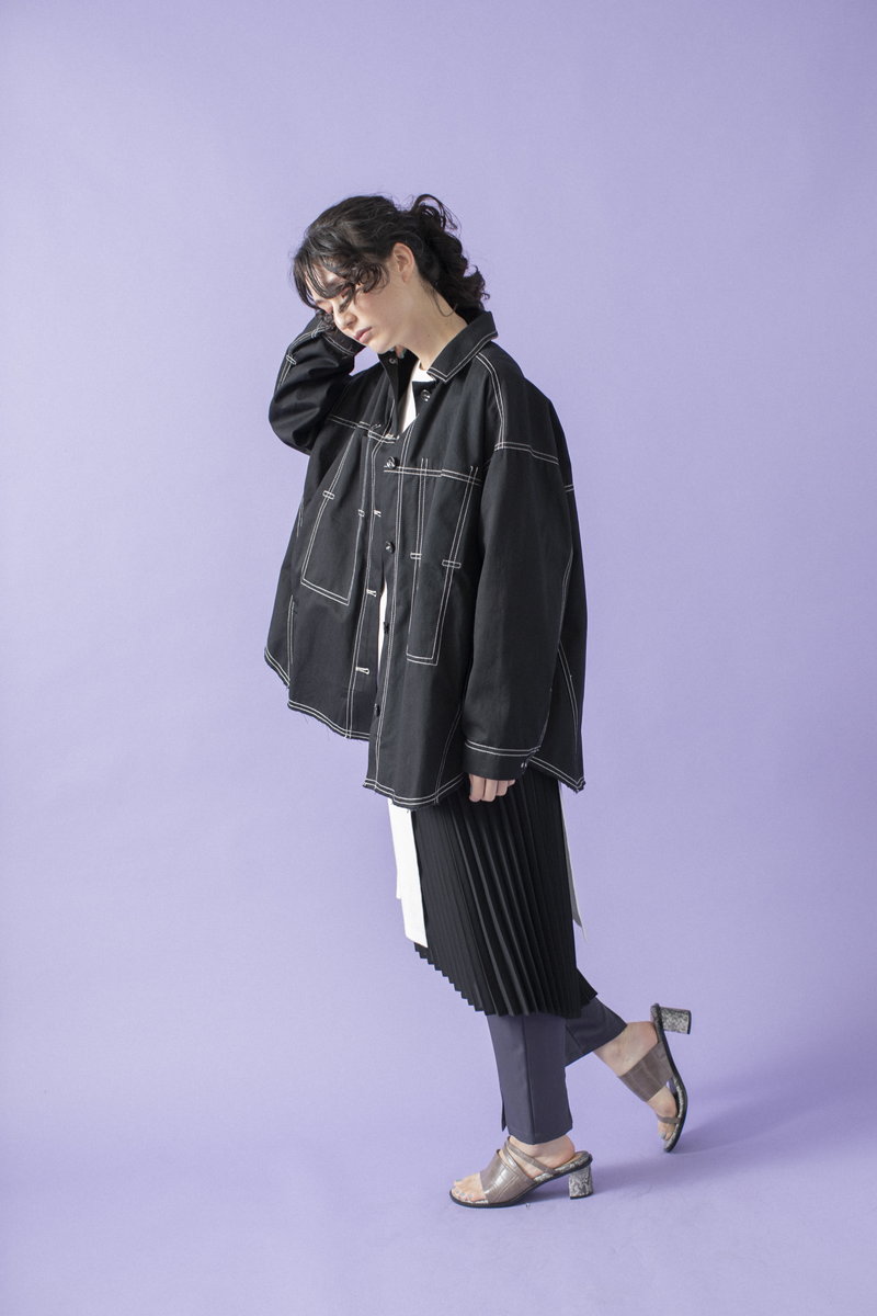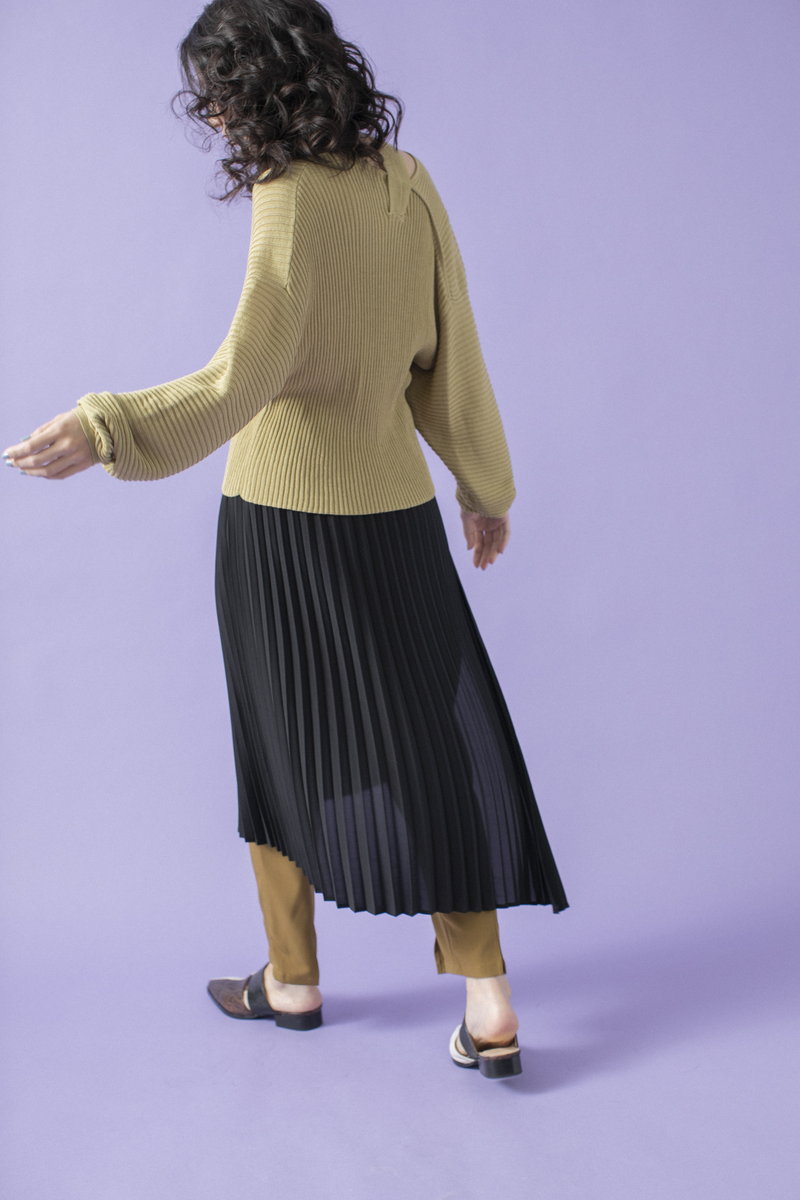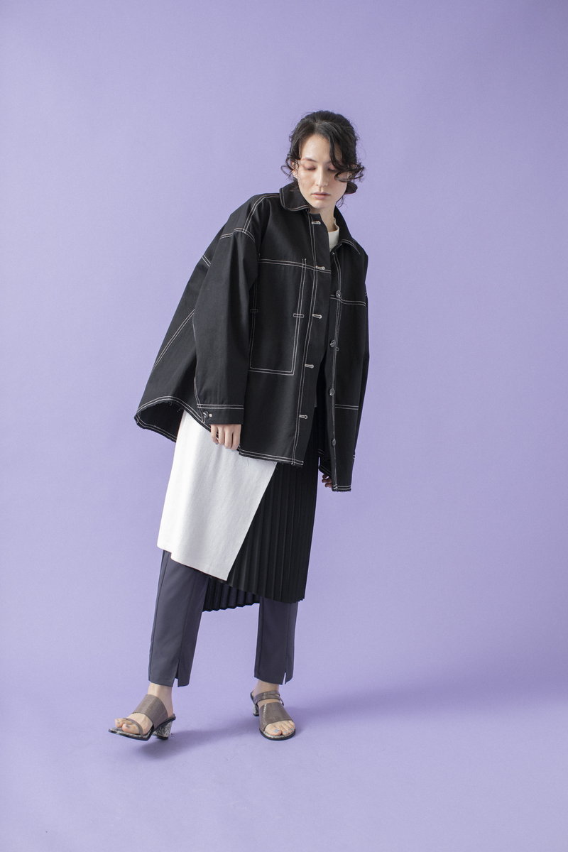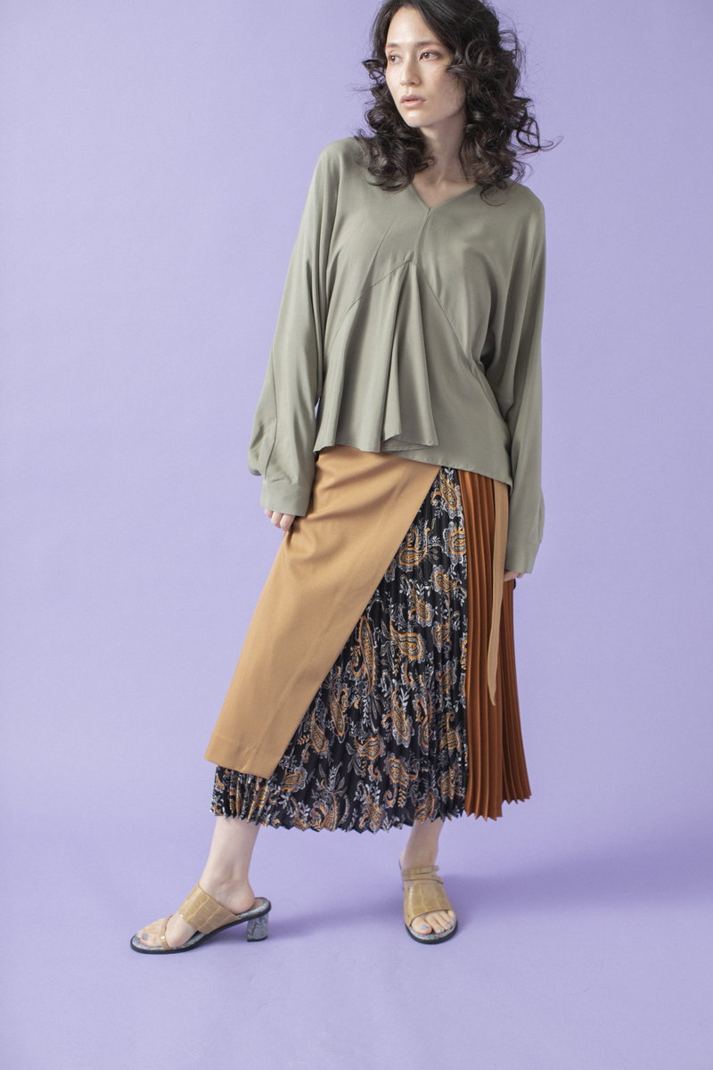 プリーツスカートで緊張感とリズムを与えて。