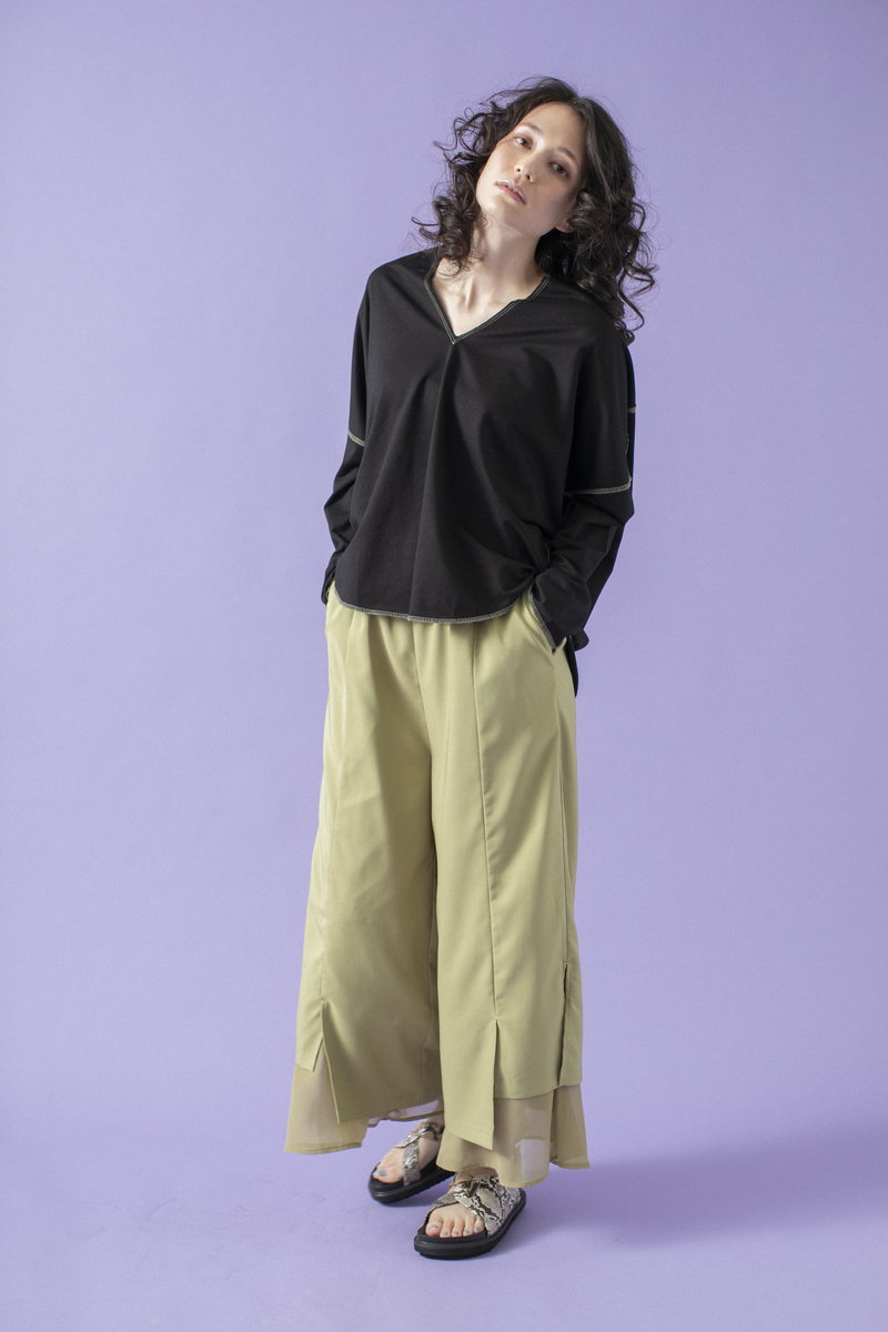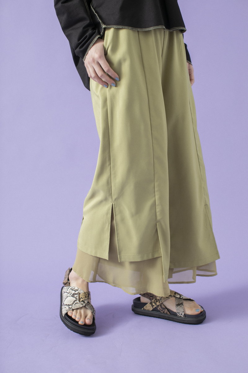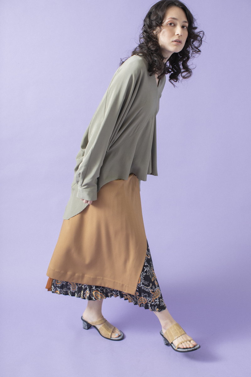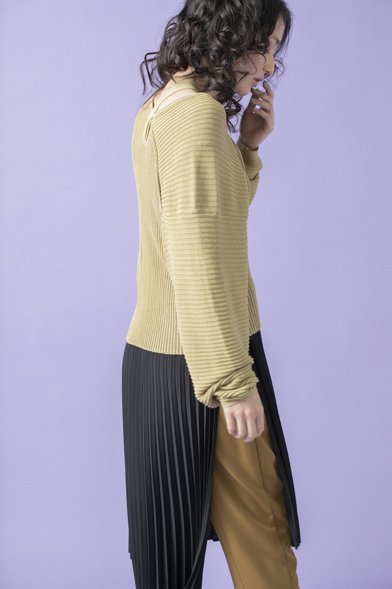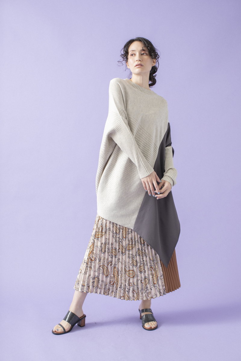 プリーツスカートで緊張感とリズムを与えて。