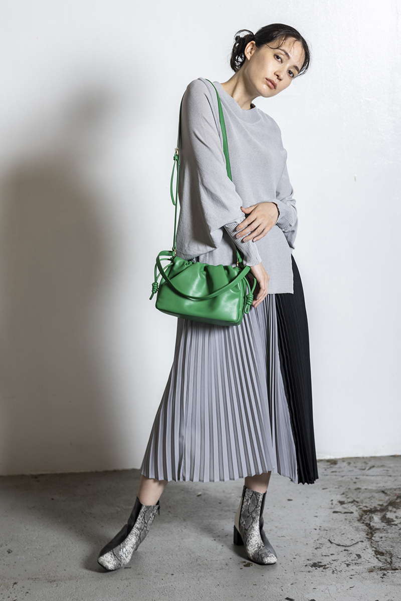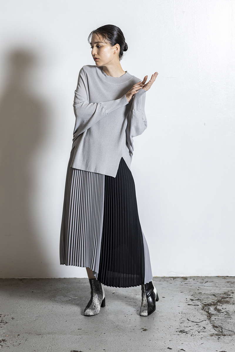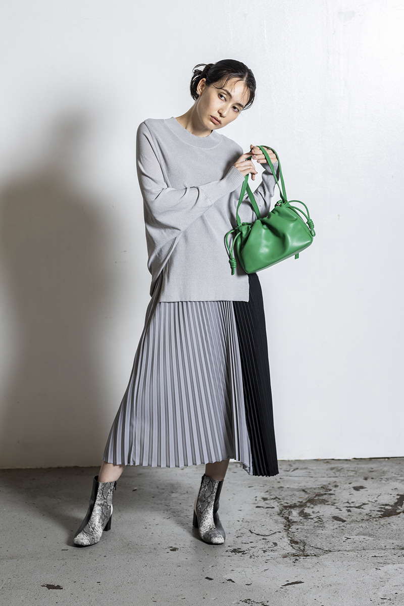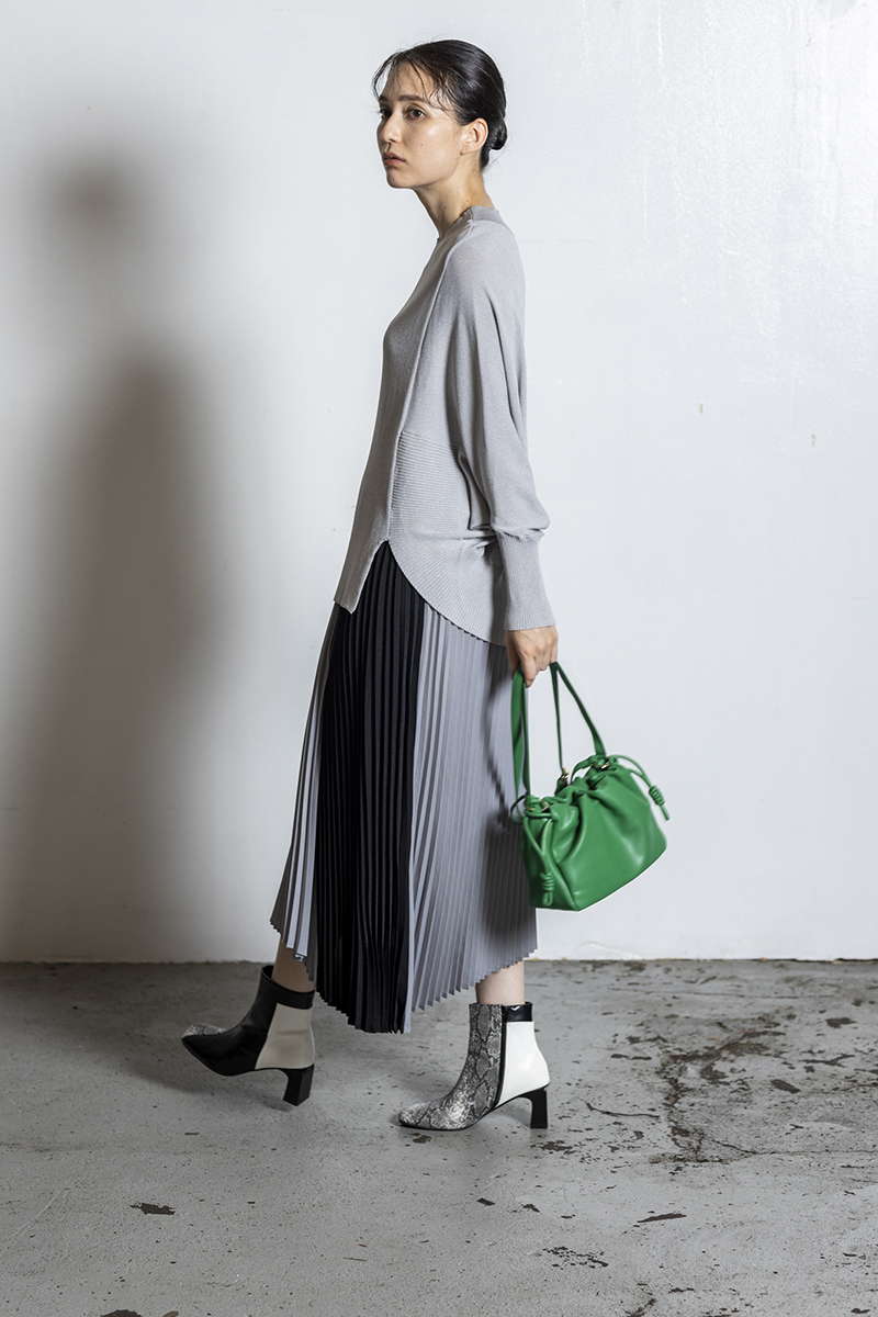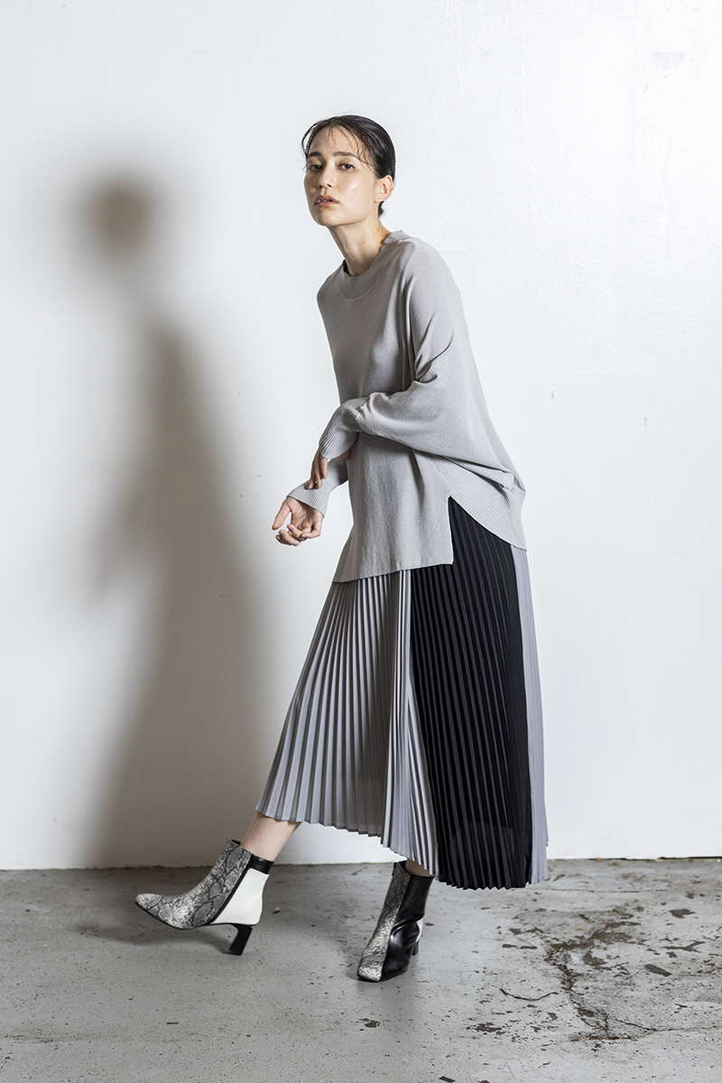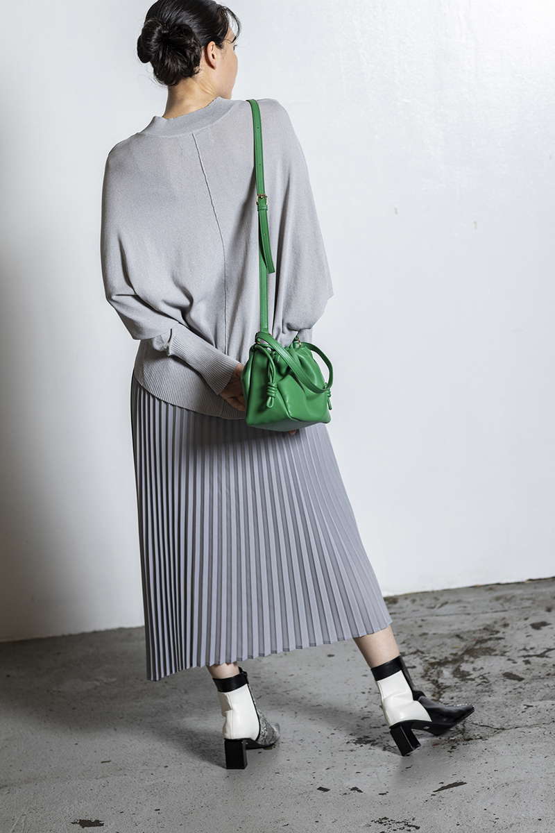 プリーツスカートを忍ばせて上品さを確保。