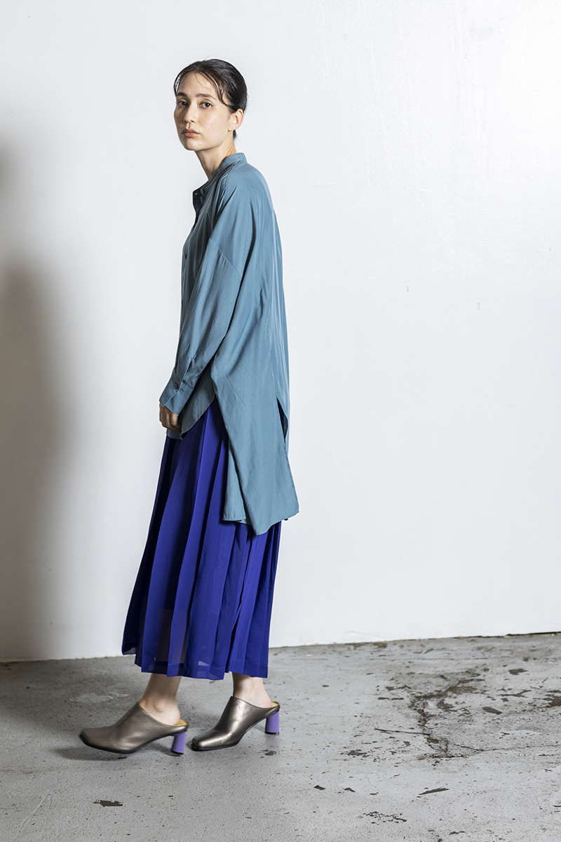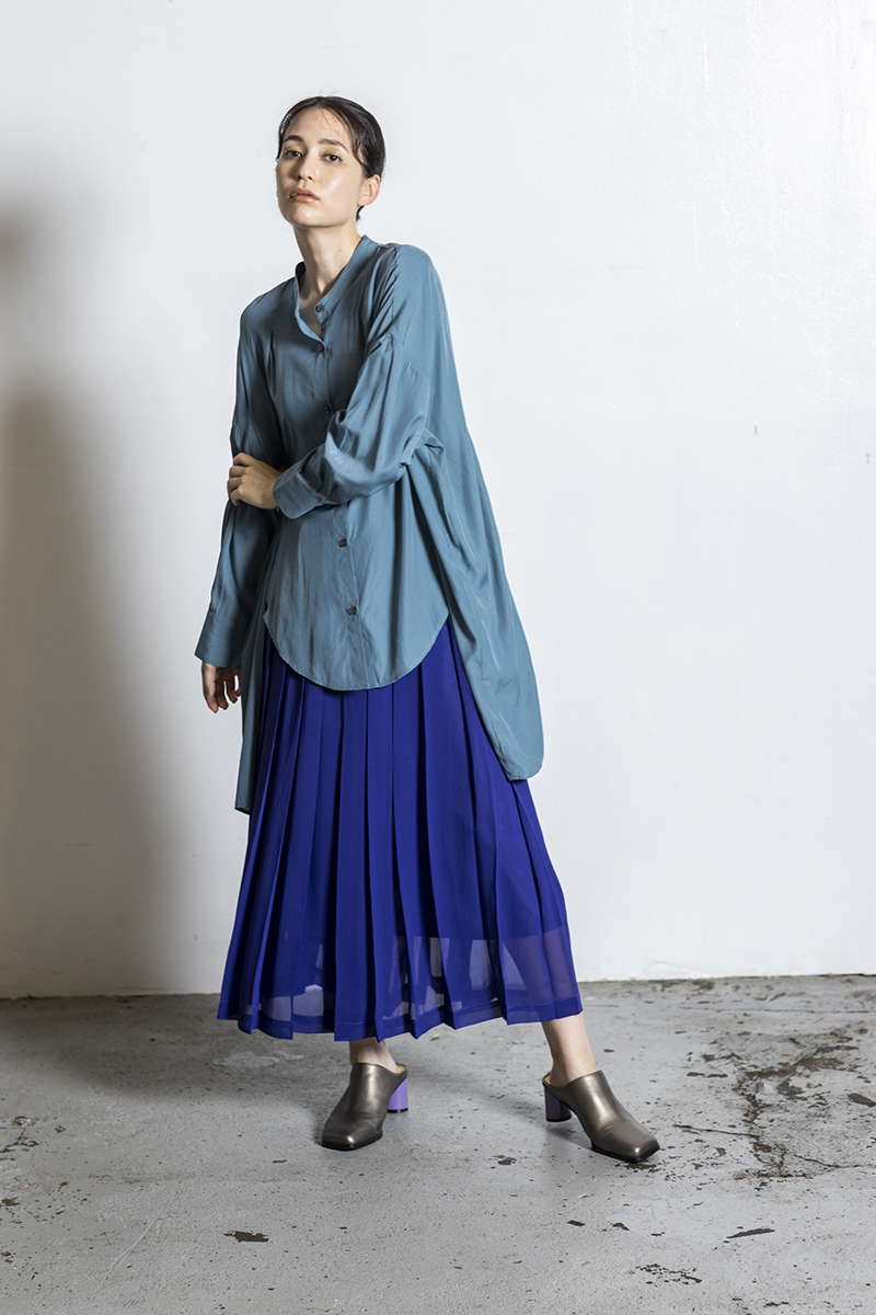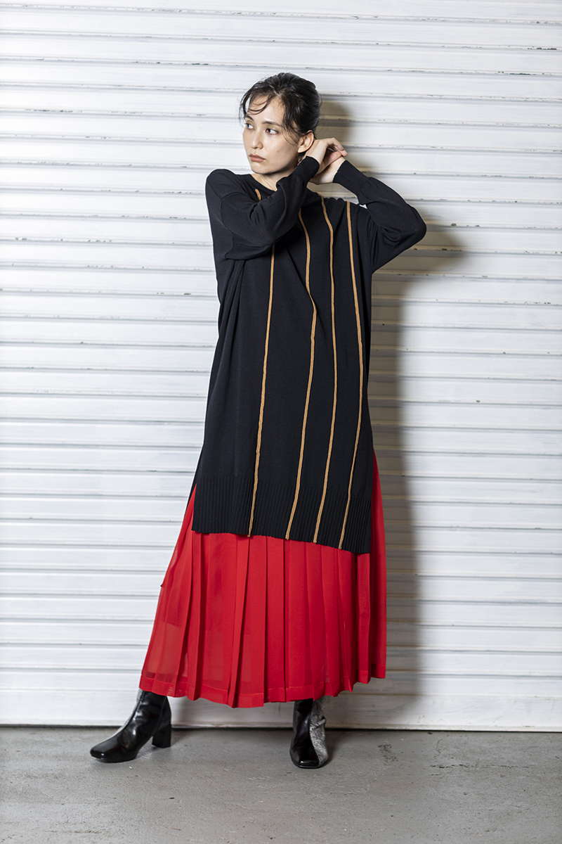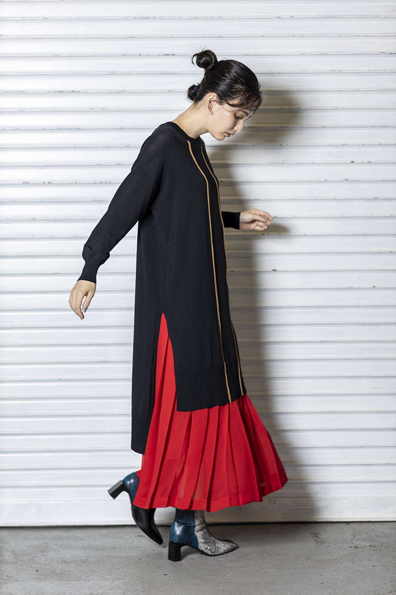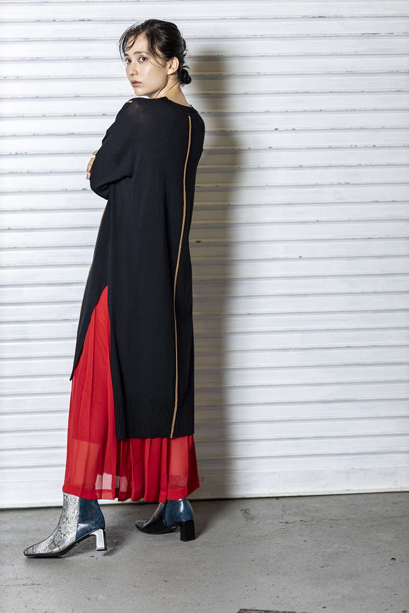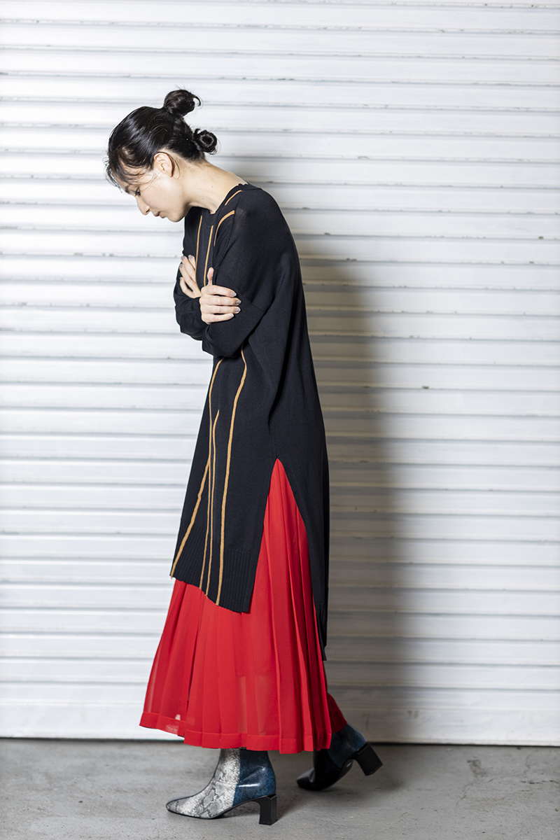 プリーツスカートを忍ばせて上品さを確保。