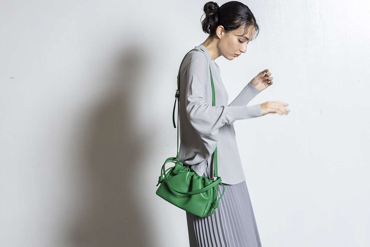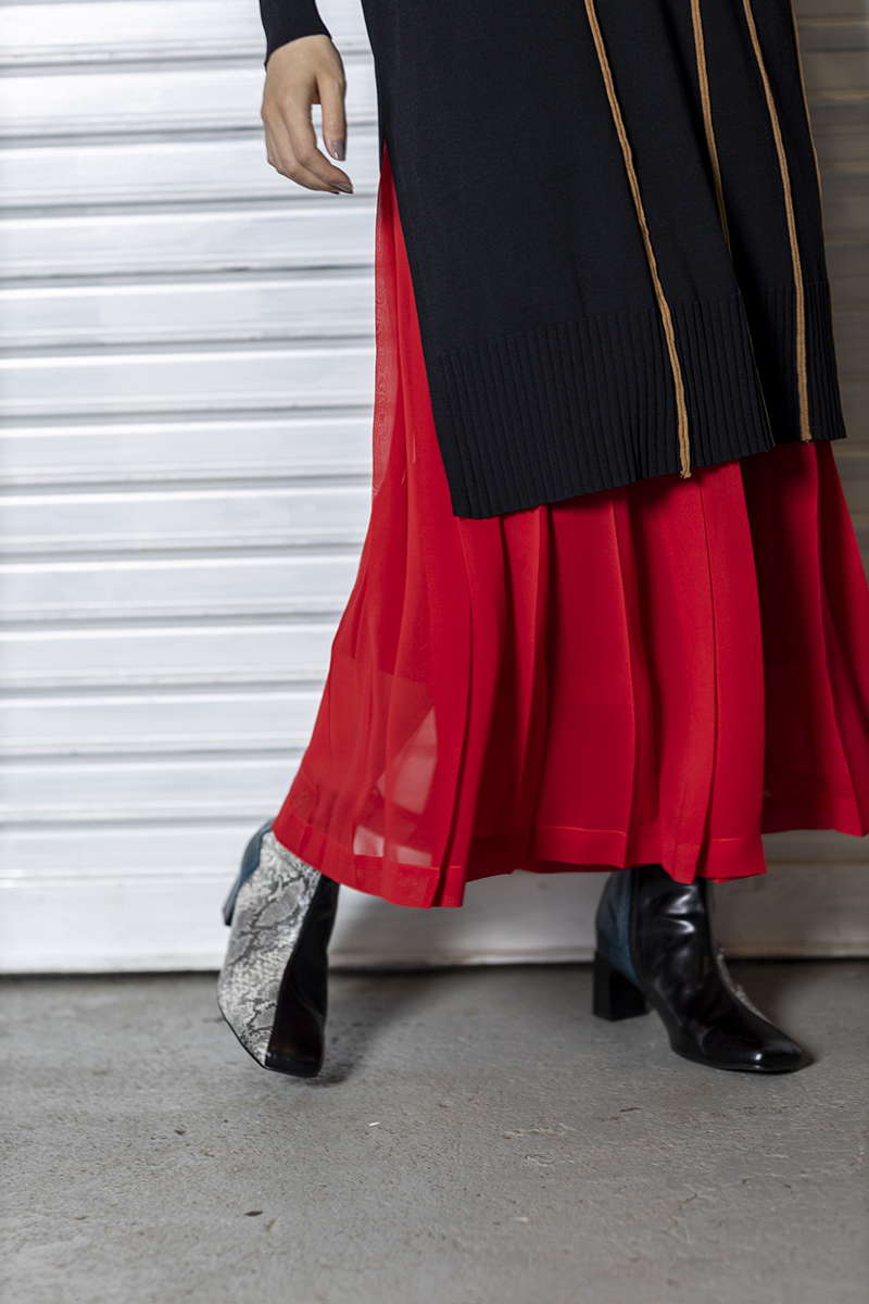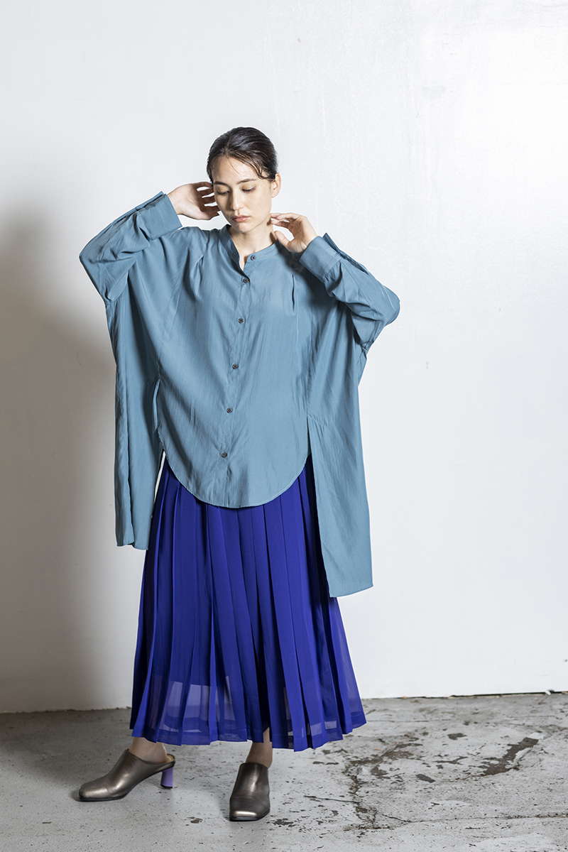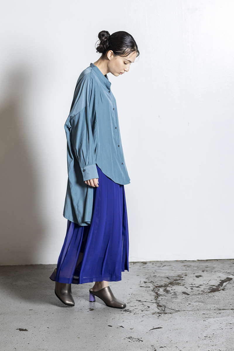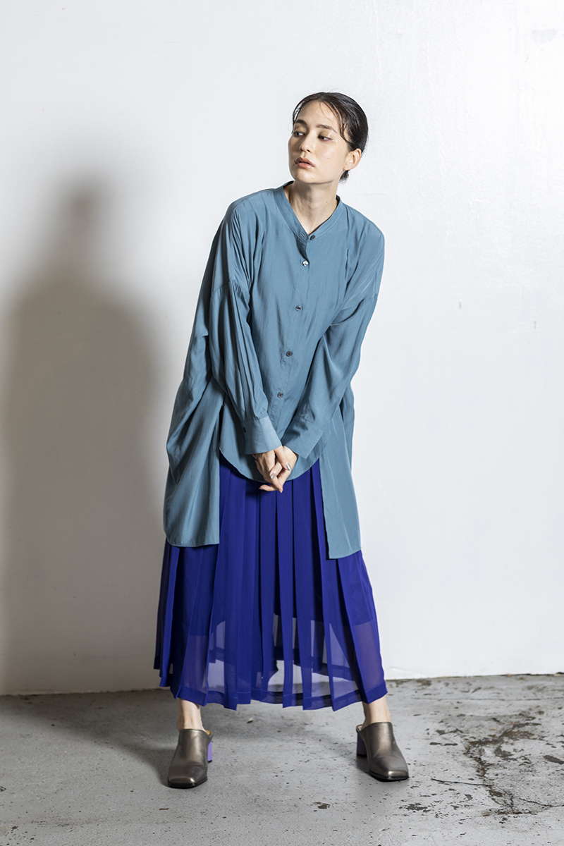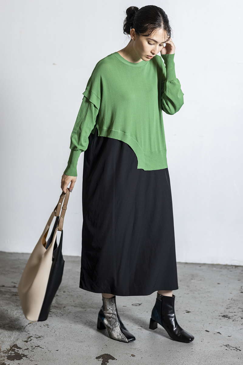 プリーツスカートを忍ばせて上品さを確保。