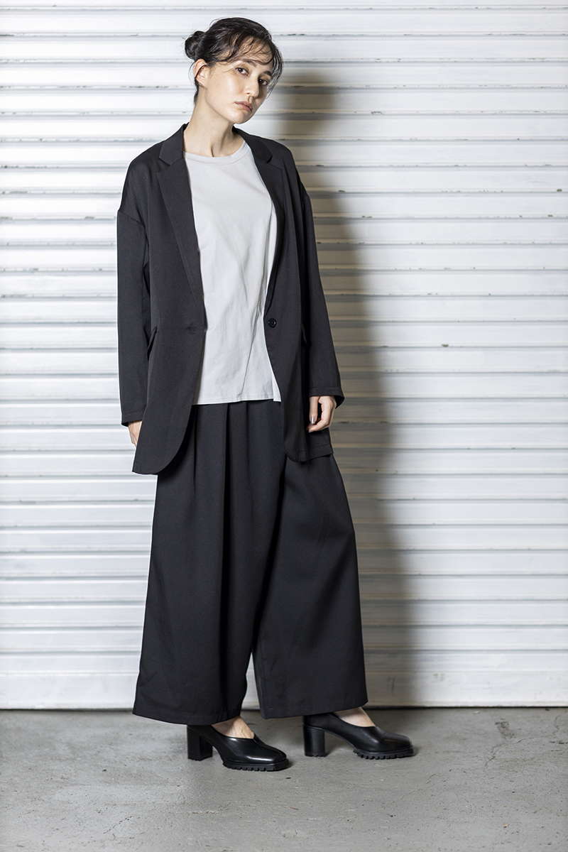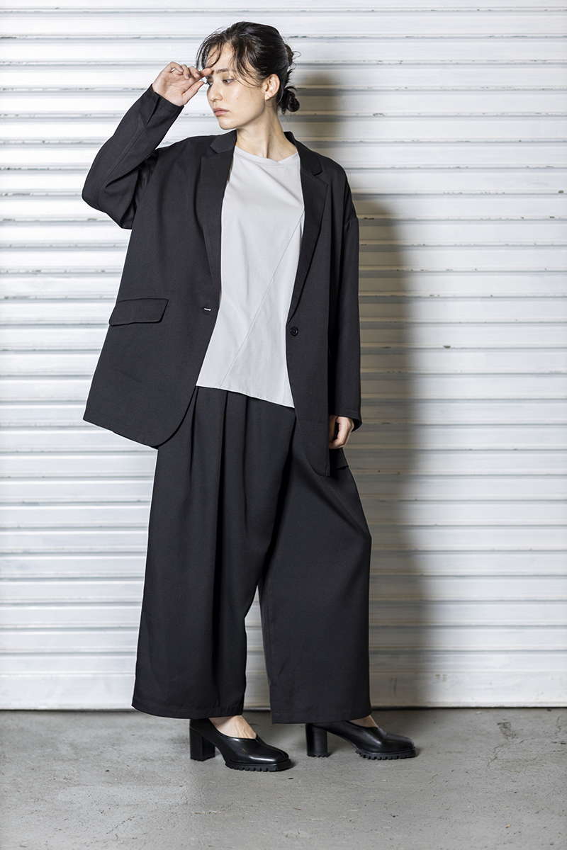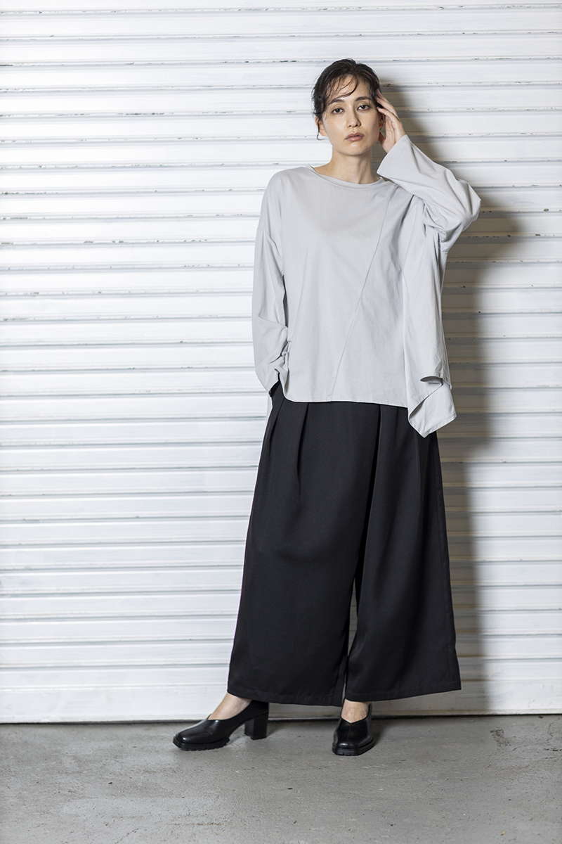 シアーなプリーツパンツで、異素材MIX。