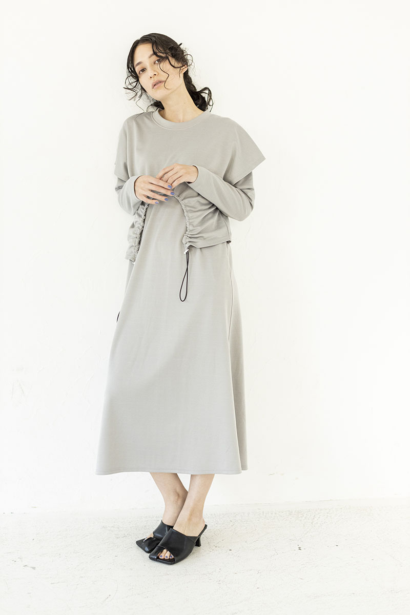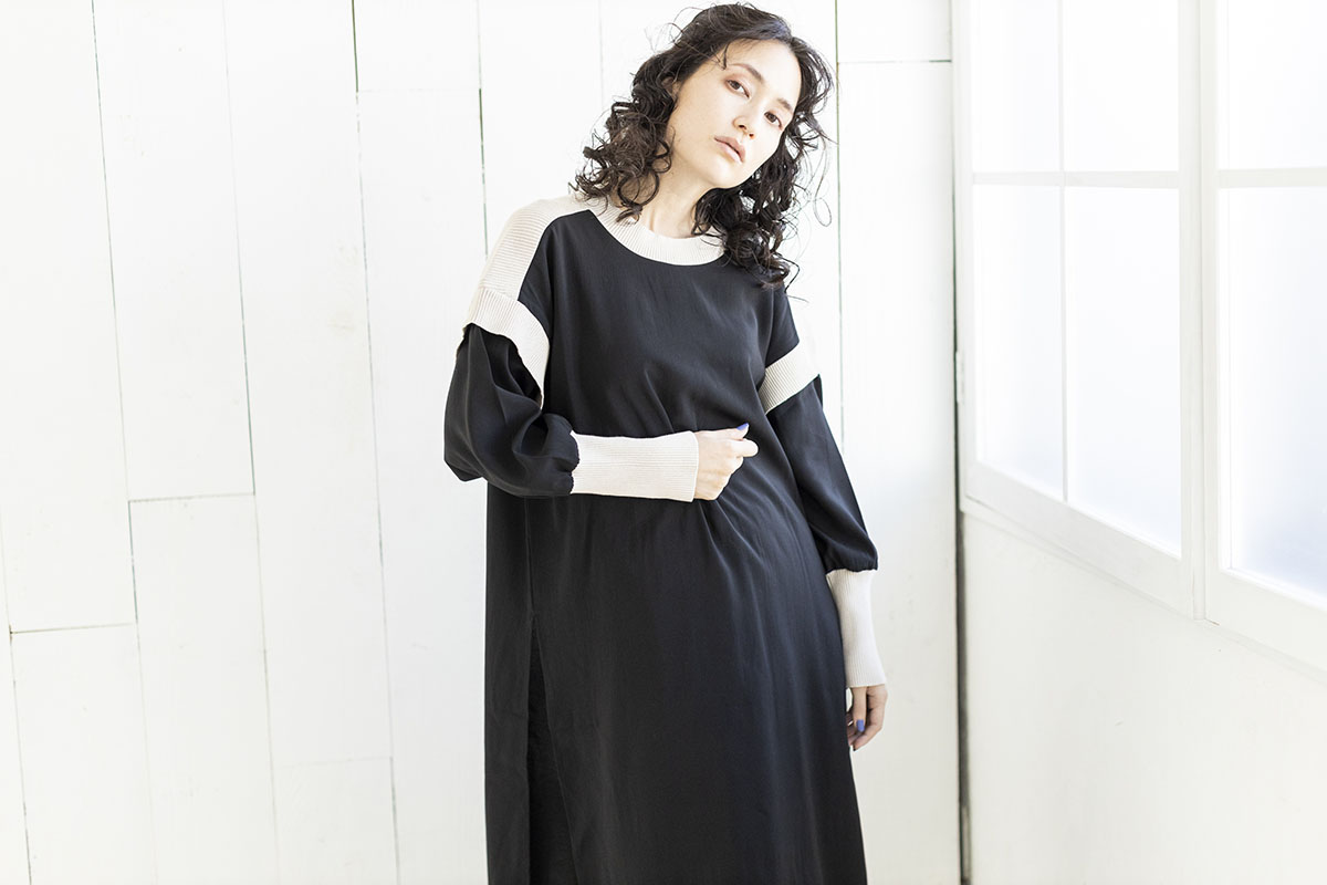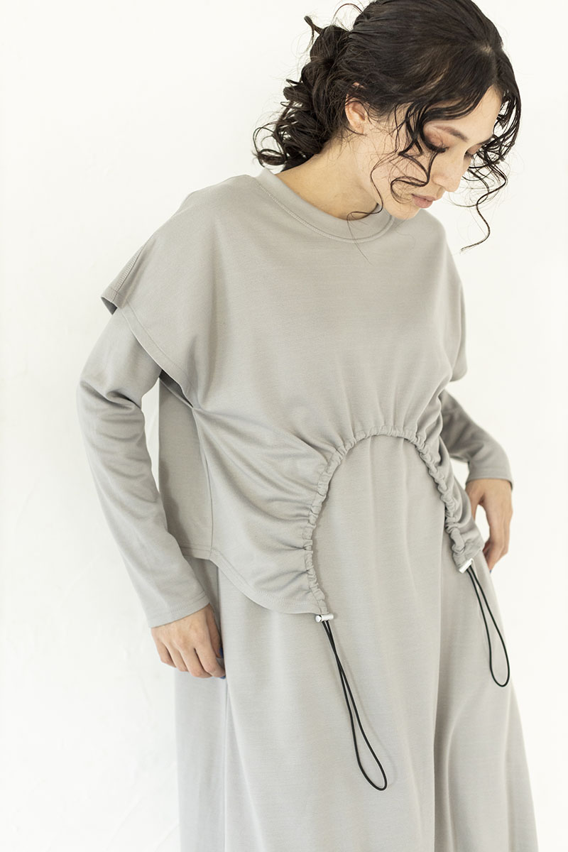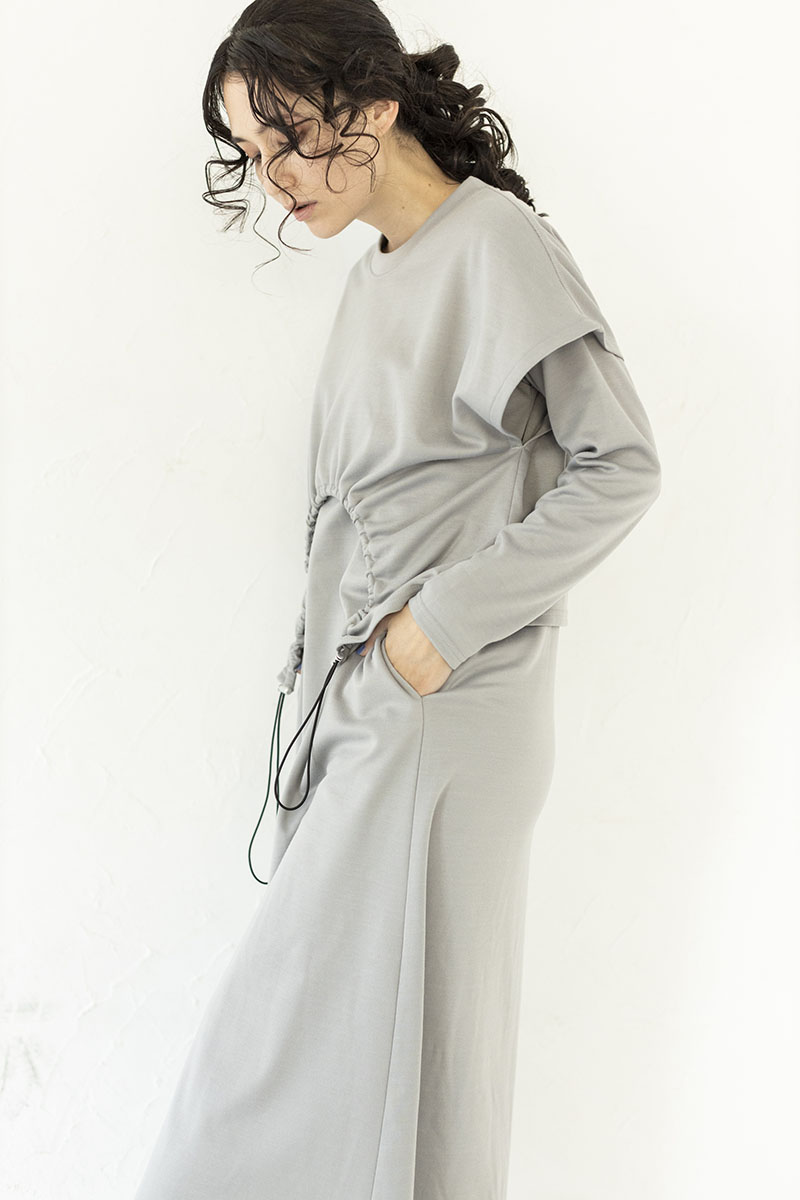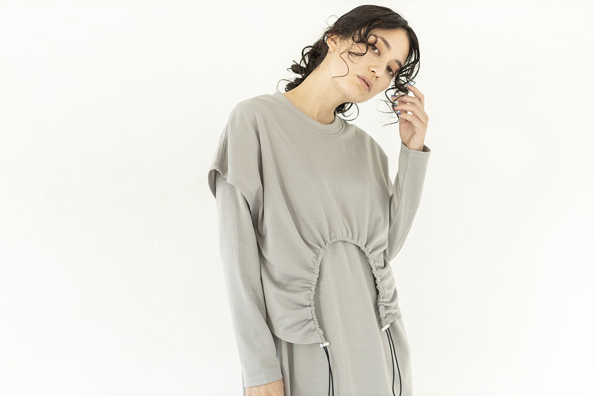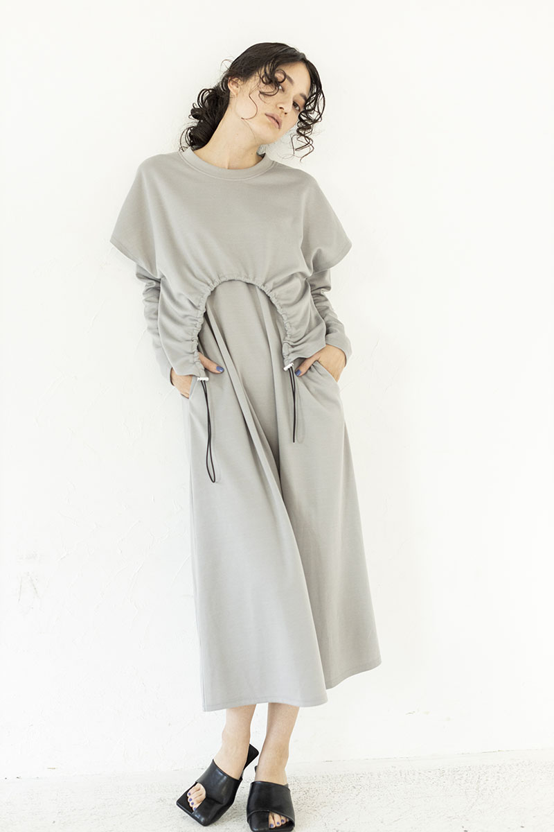 ドローコードで変化をつけたワンピースは、リラクシーなシルエットがら、しなやかな品の良い素材で凛とした表情に。