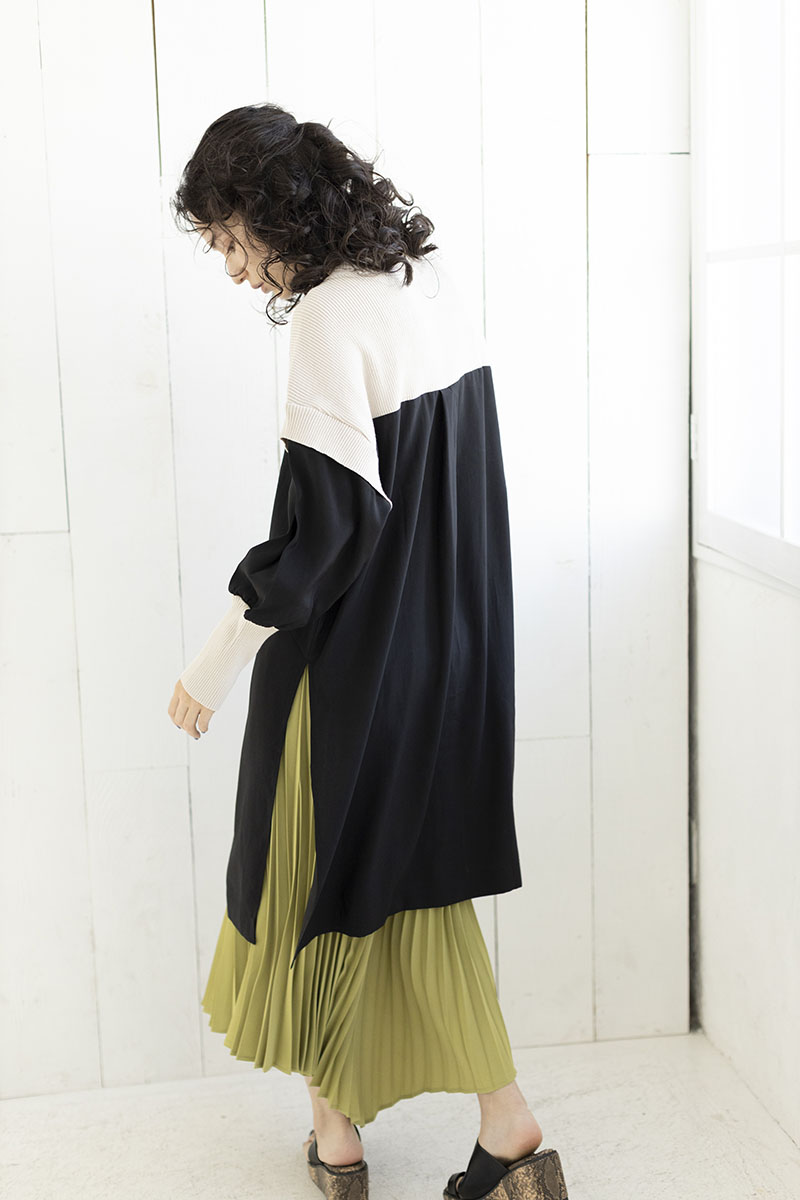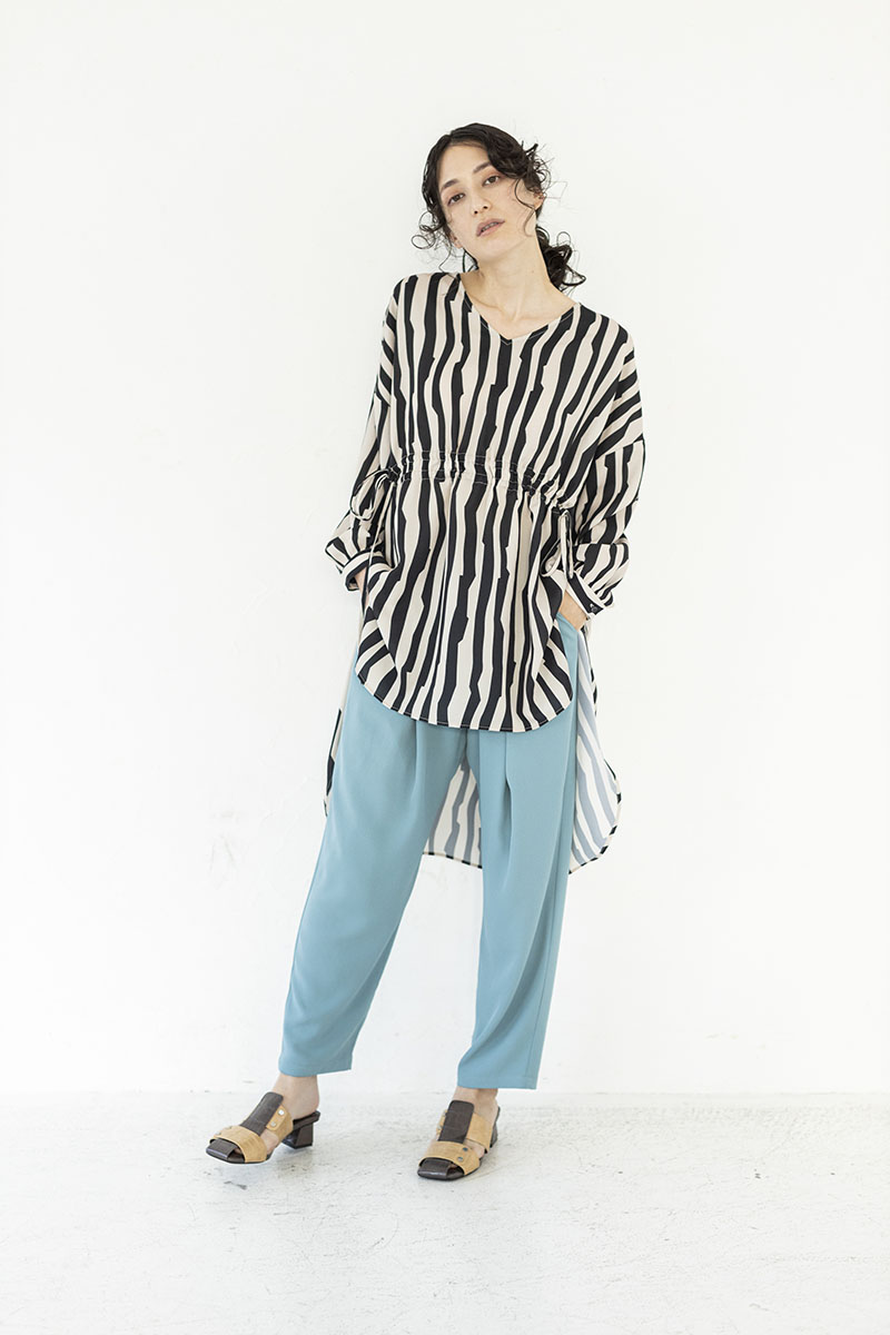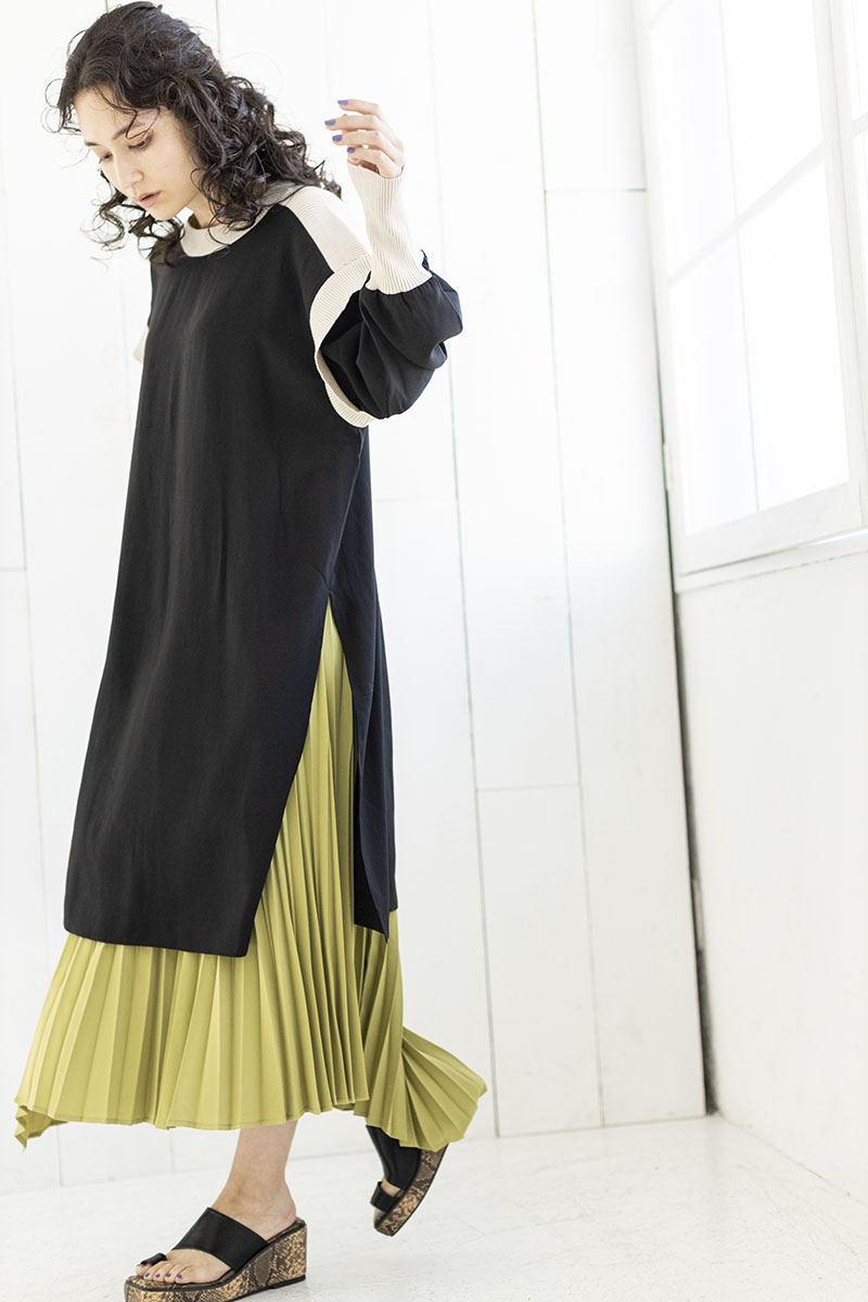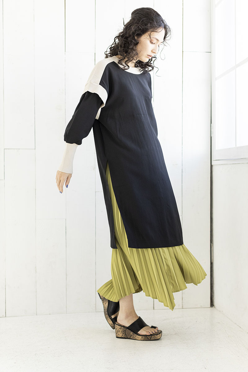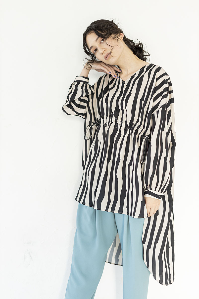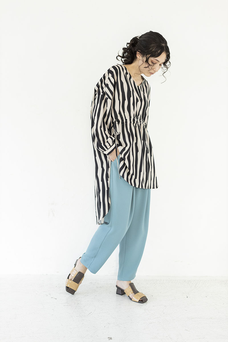 ドローコードで変化をつけたワンピースは、リラクシーなシルエットがら、しなやかな品の良い素材で凛とした表情に。