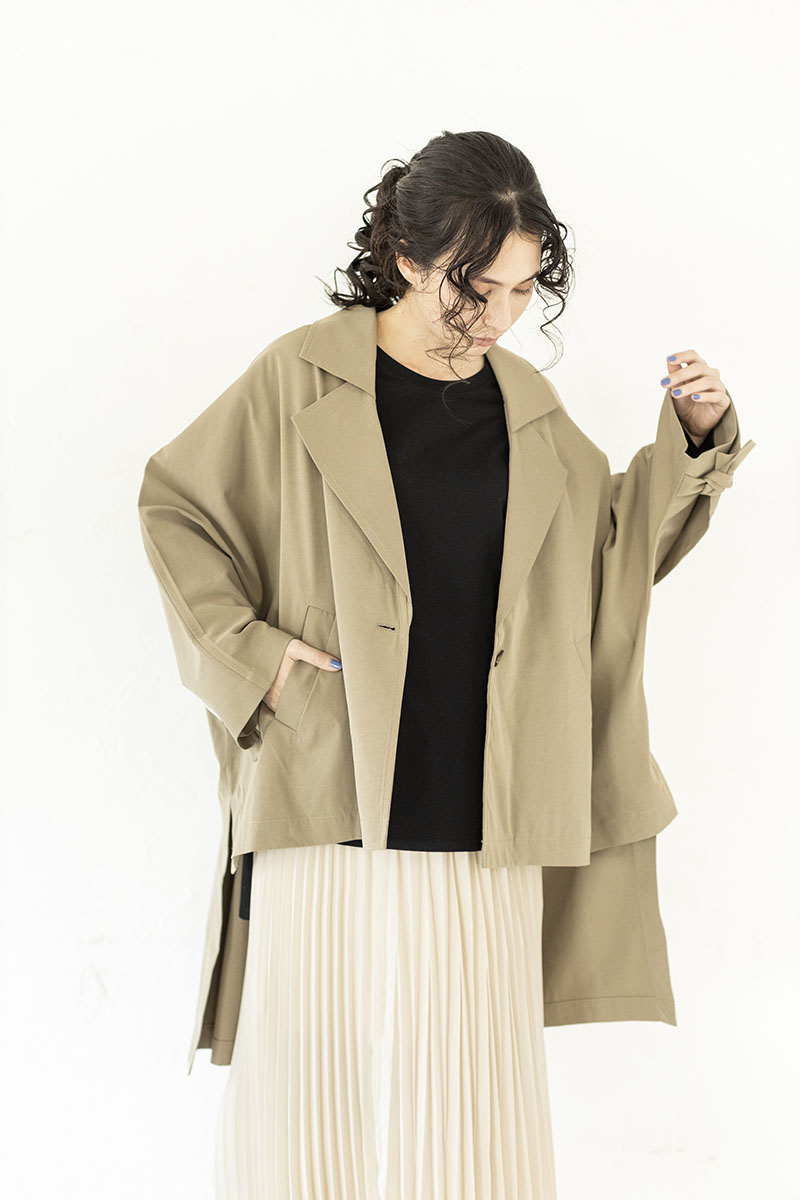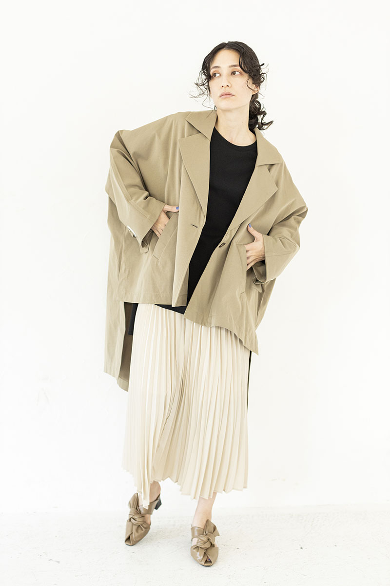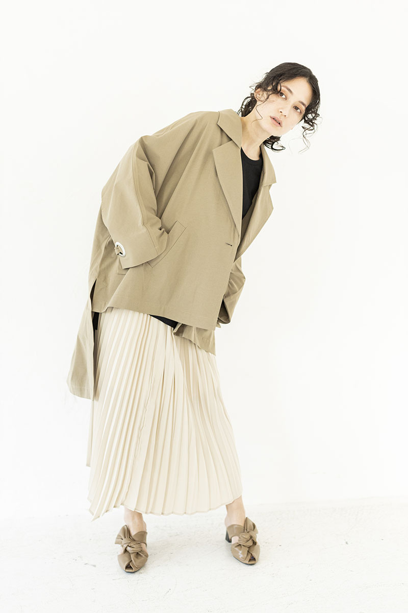 バックシャンなアウターは、アイレット使いとビッグサイズで、ほんのりアウトドアムードに。プリーツスカートで、きれい目にまとめるのが今季らしい。