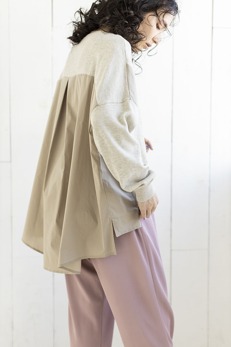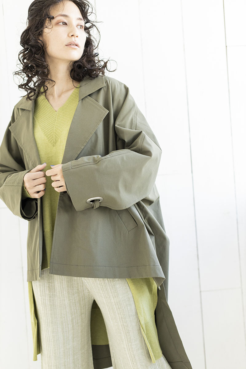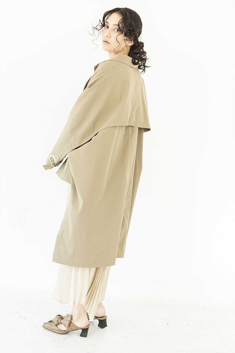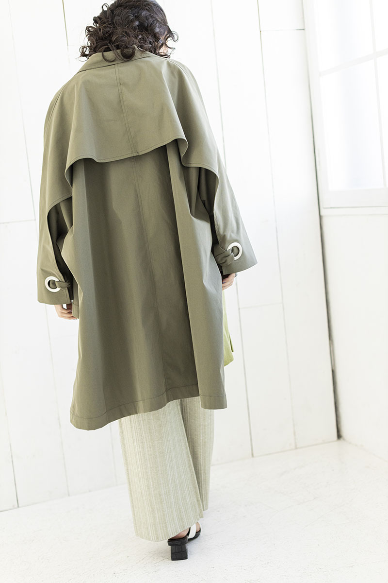 バックシャンなアウターは、アイレット使いとビッグサイズで、ほんのりアウトドアムードに。プリーツスカートで、きれい目にまとめるのが今季らしい。
