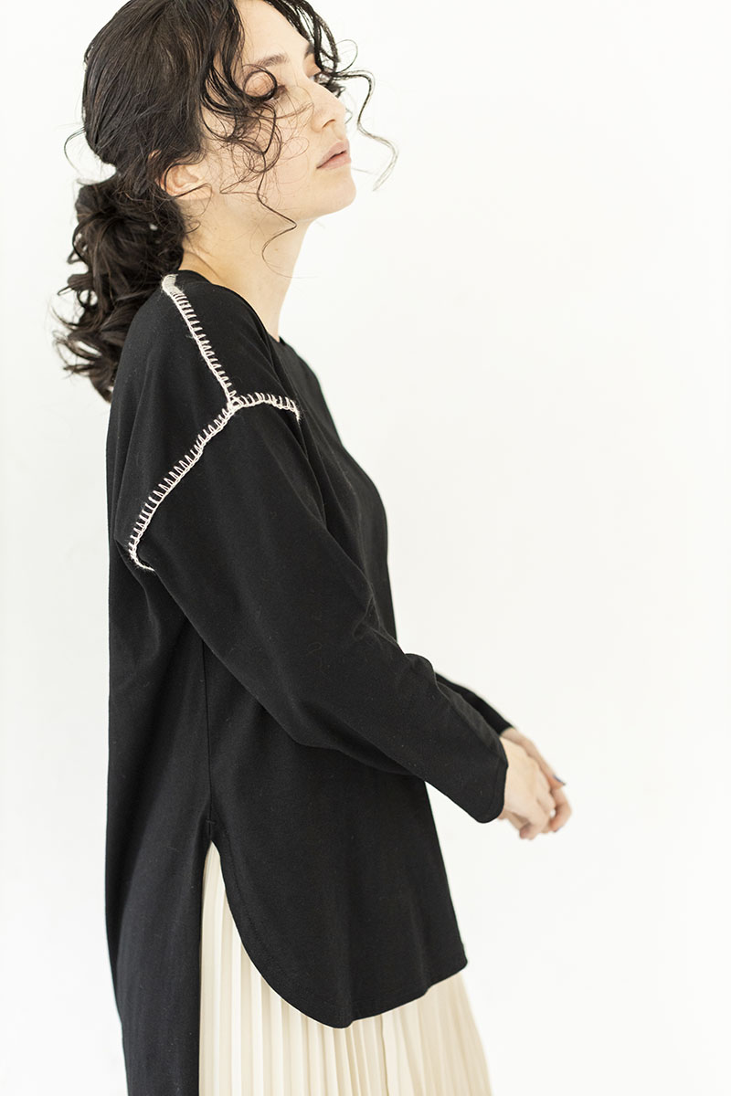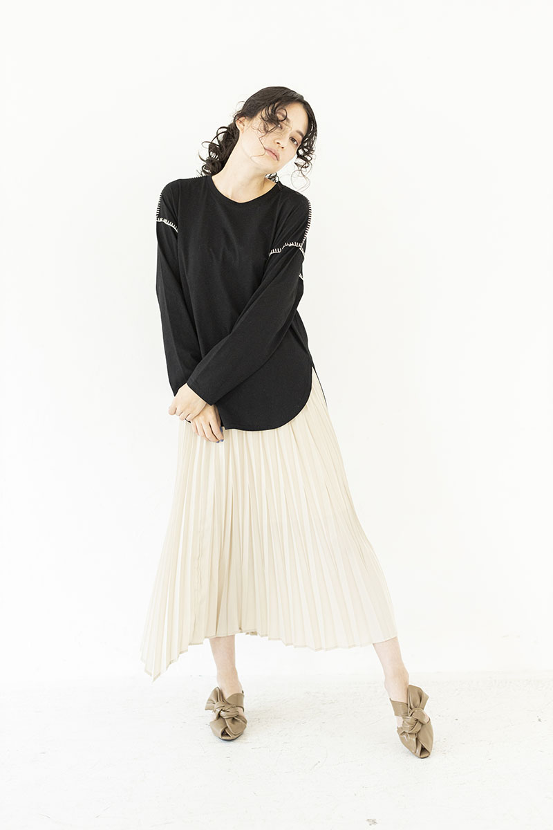 エネルギッシュなカラーを引き立てる、BLACKとのコーディネート。ボトムスなら、軽さと取り入れ易さで魅力は倍増。