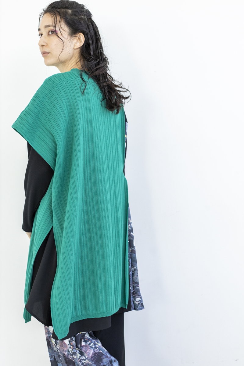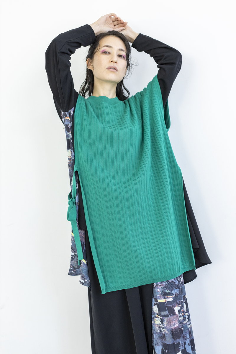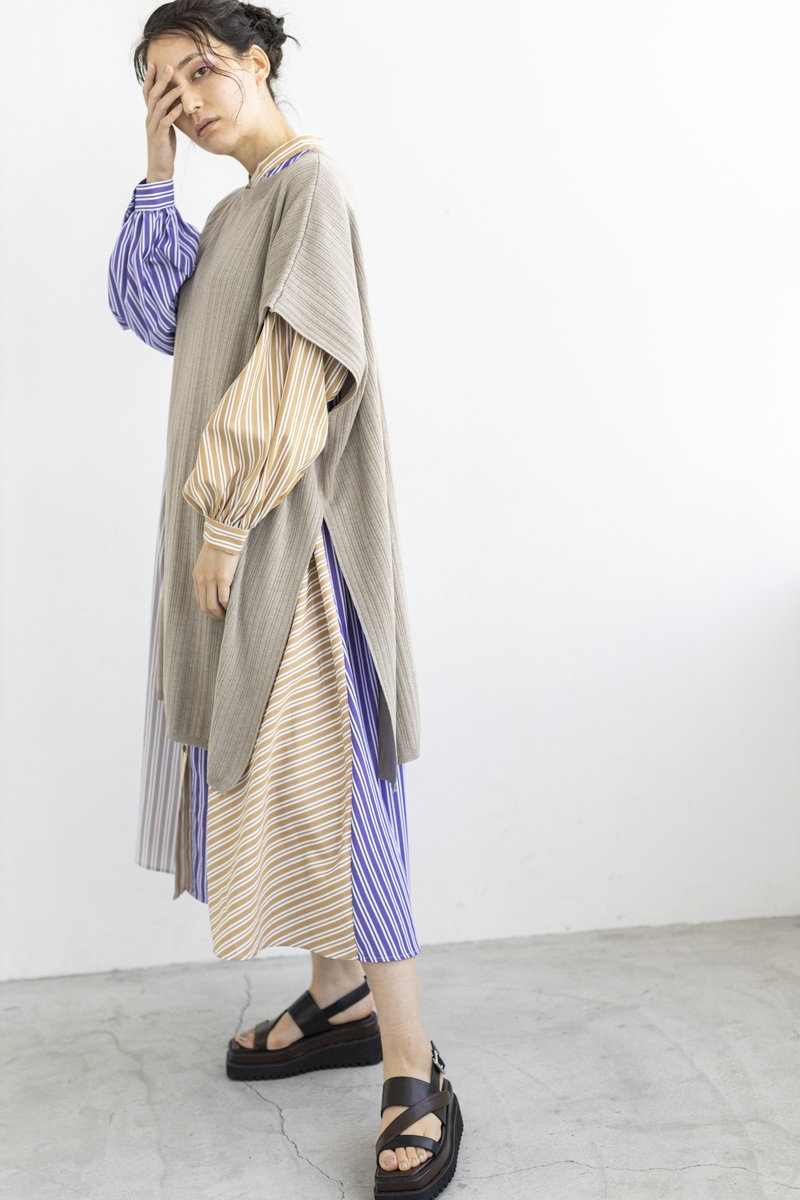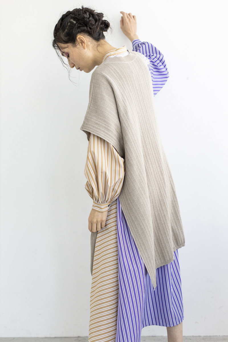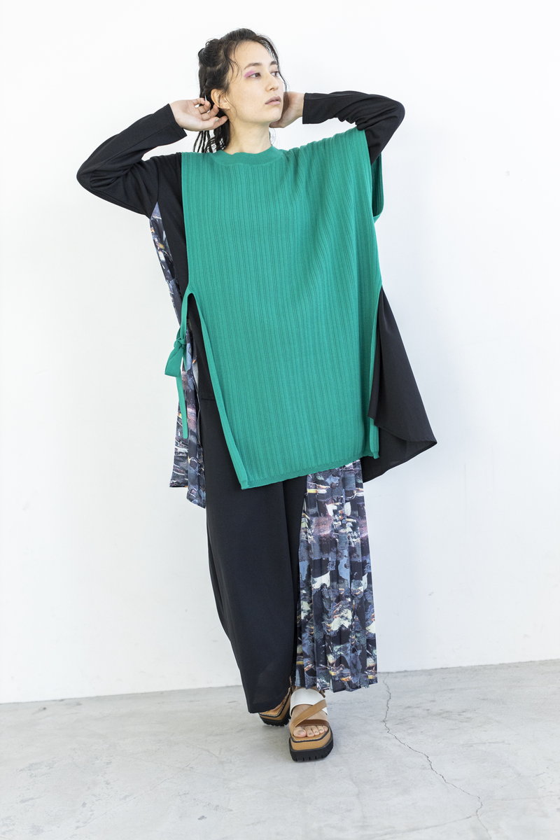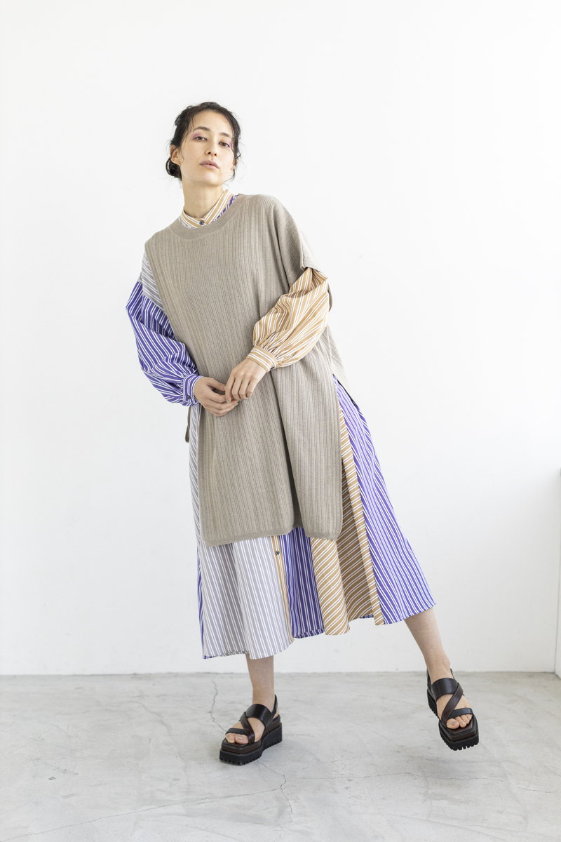 更にアシンメトリーなニットベストを重ね、