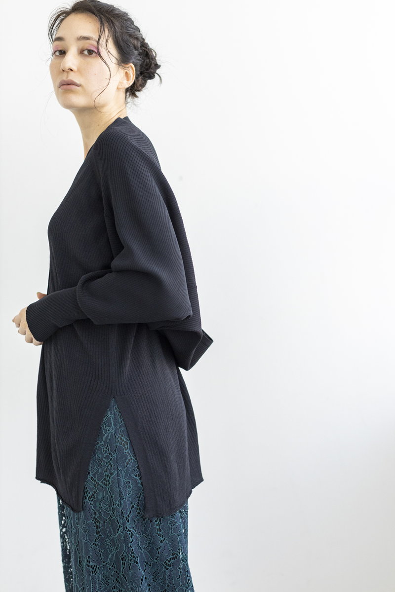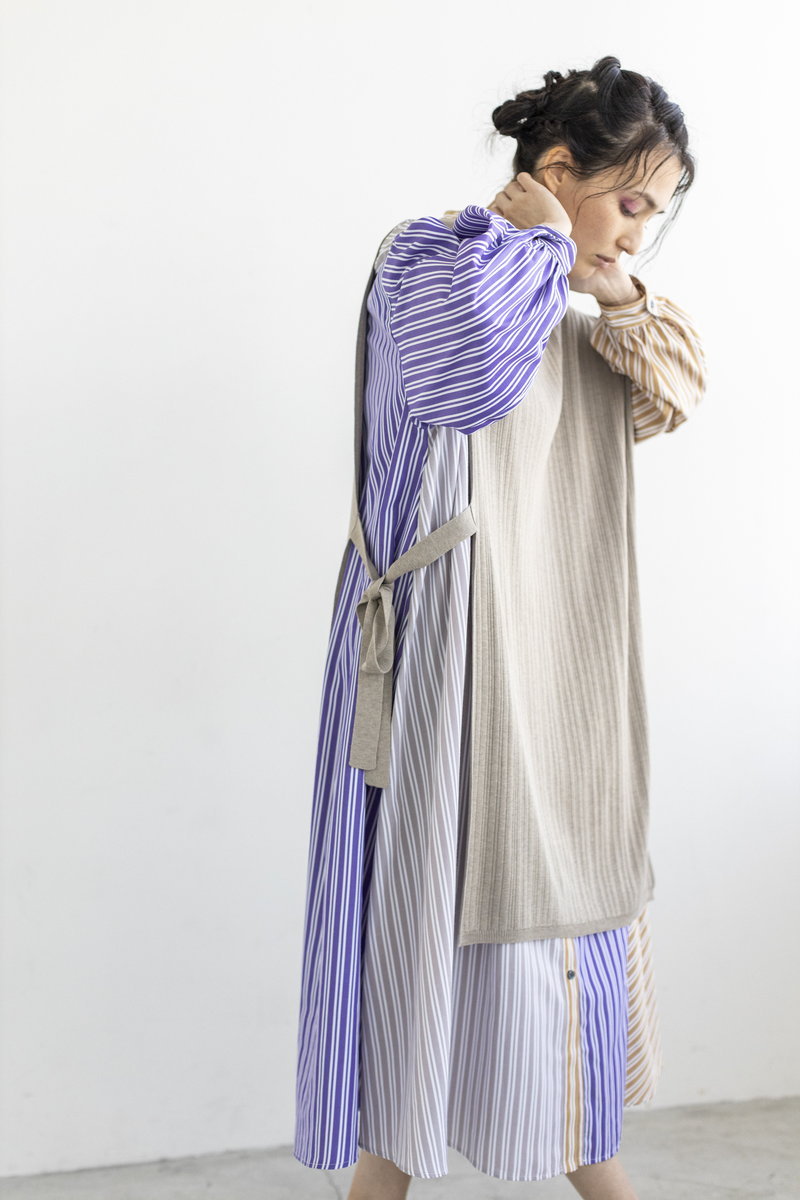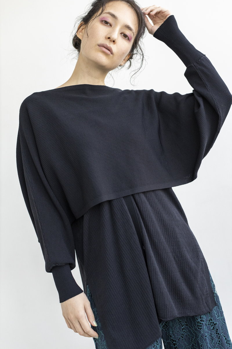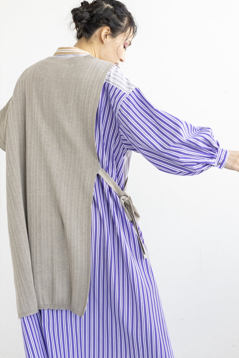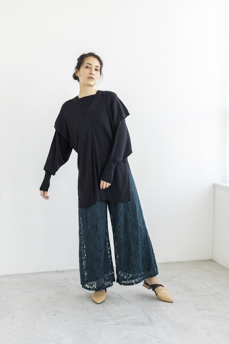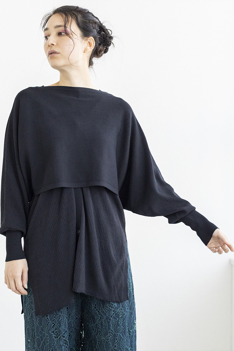 更にアシンメトリーなニットベストを重ね、