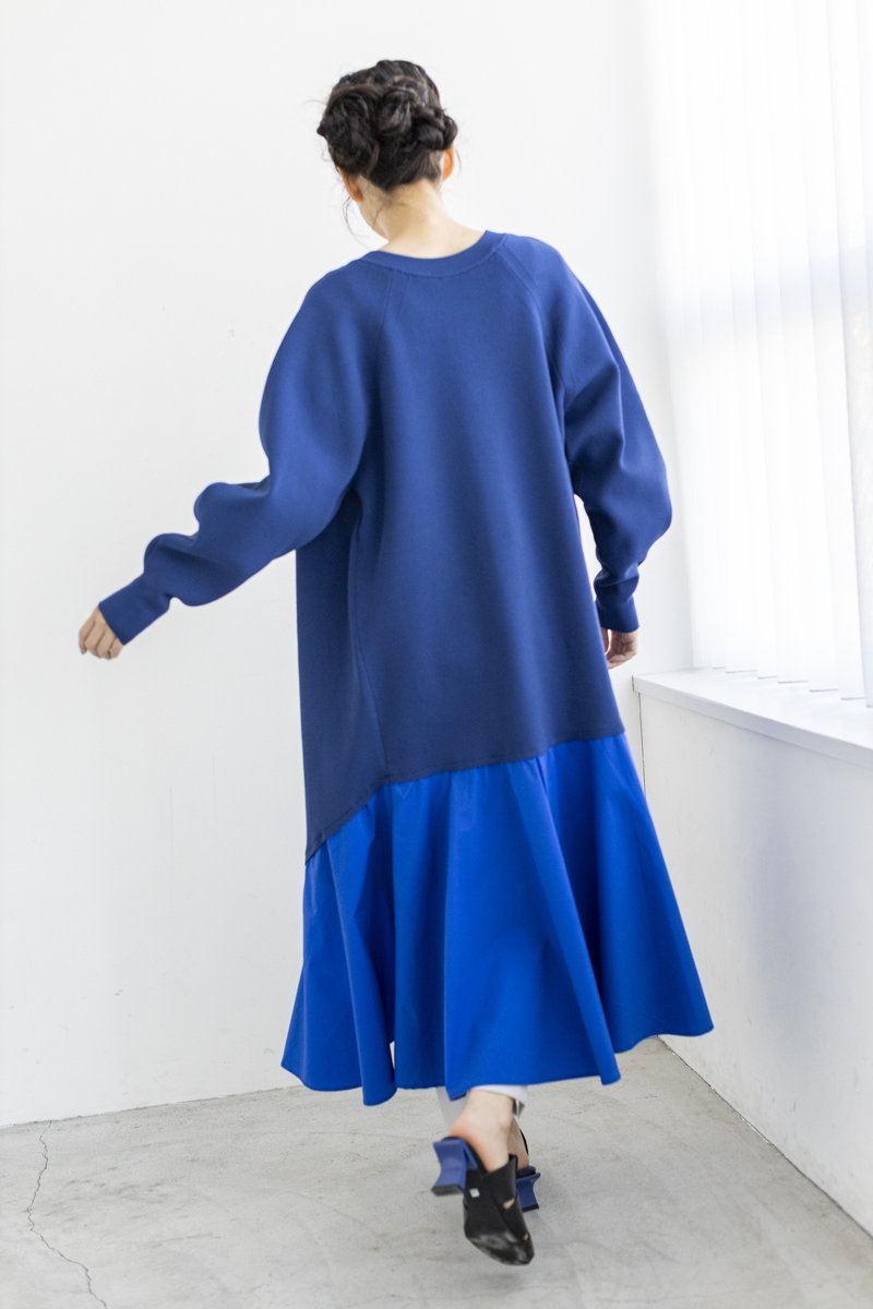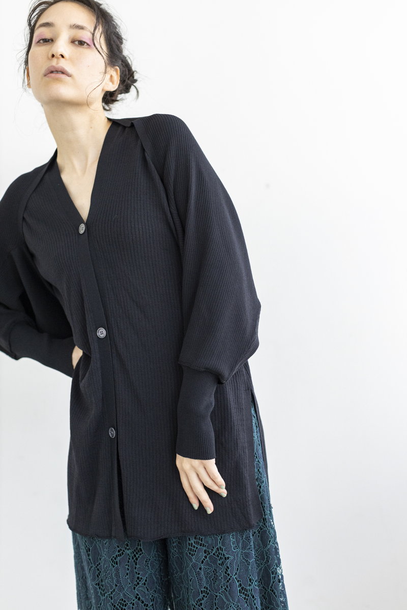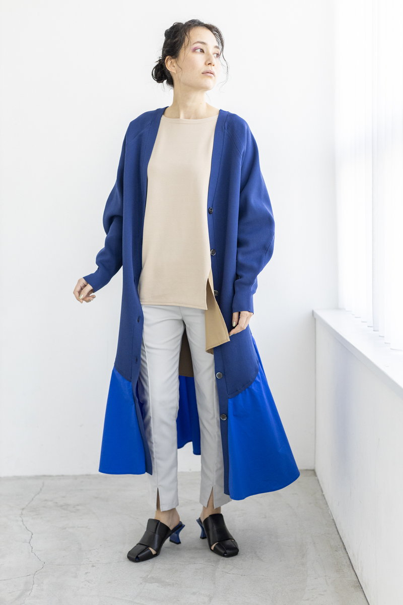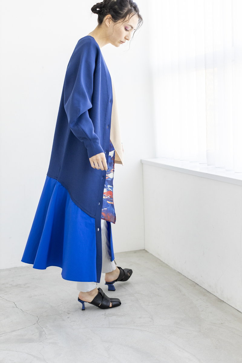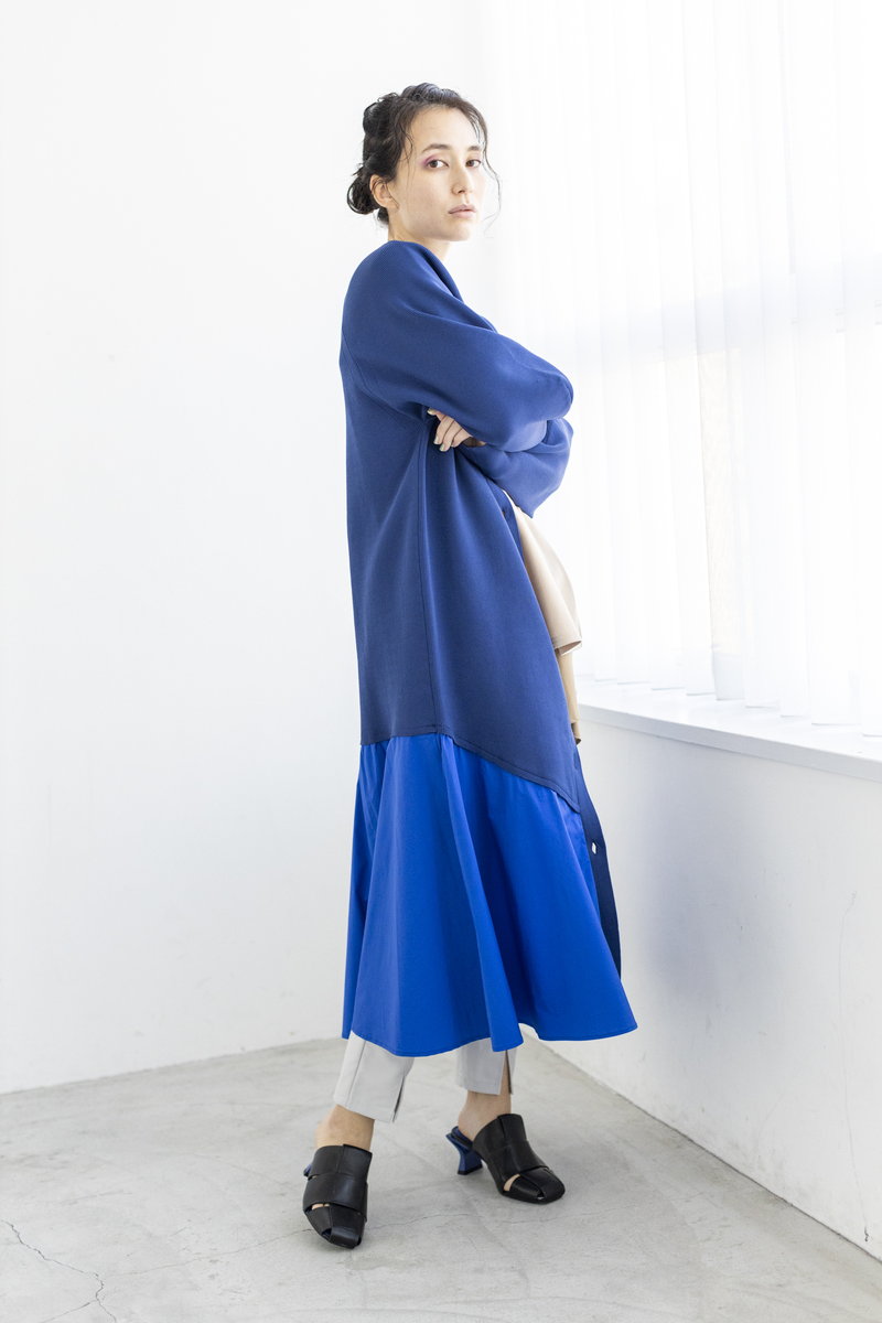 ニットワンピースを、羽織りでスタイリング。