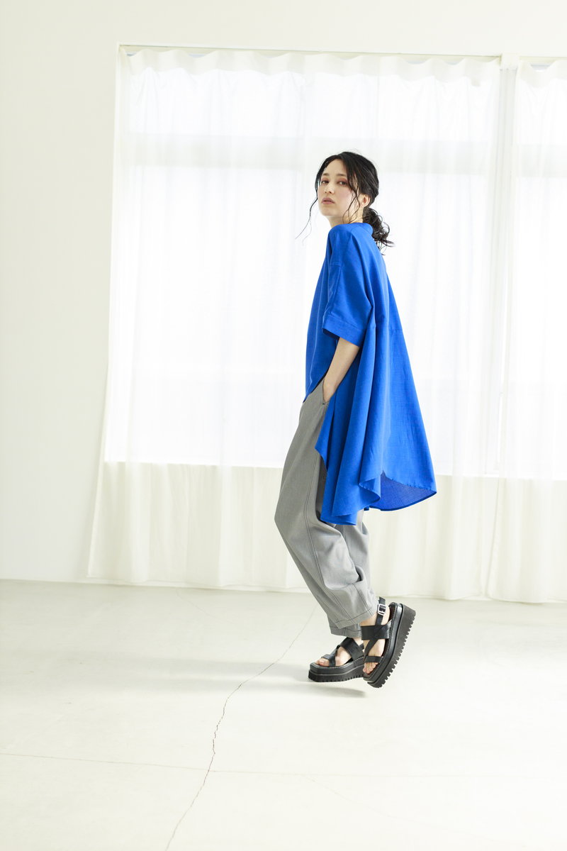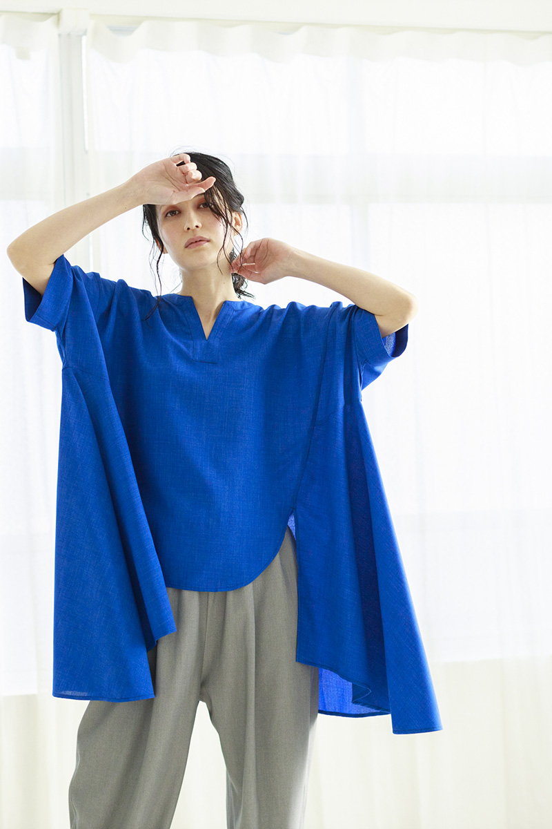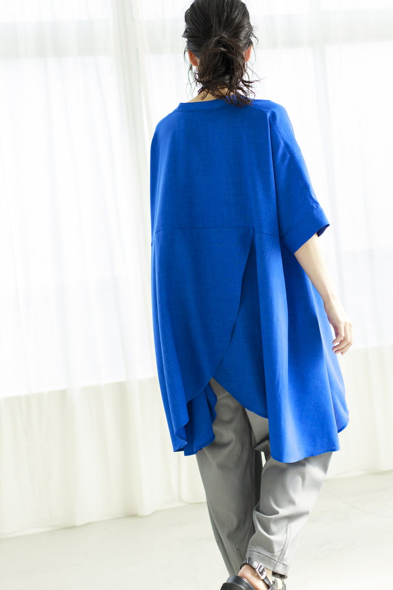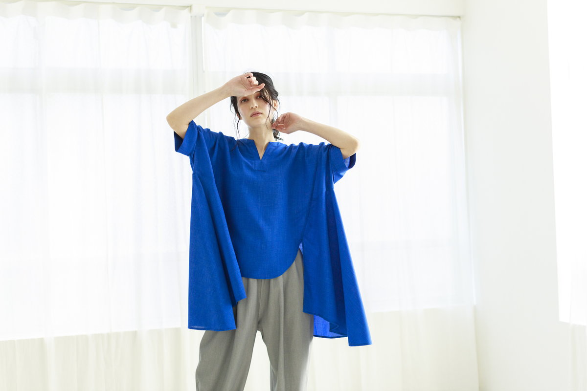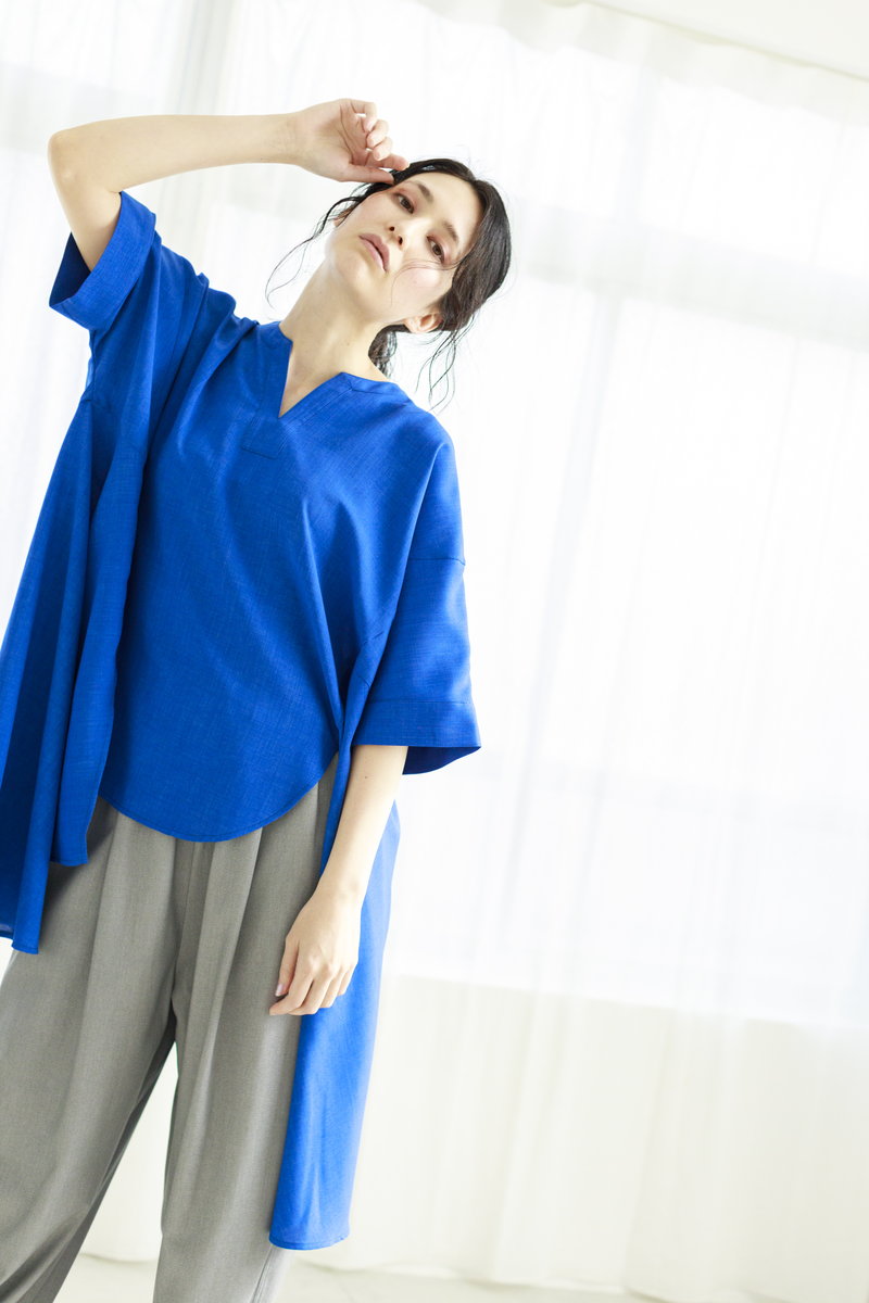 コバルトブルーのブラウス。