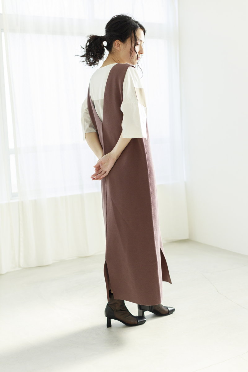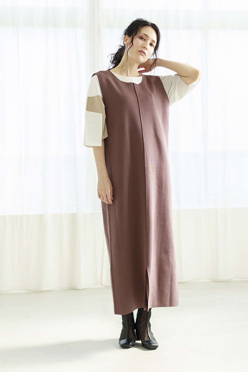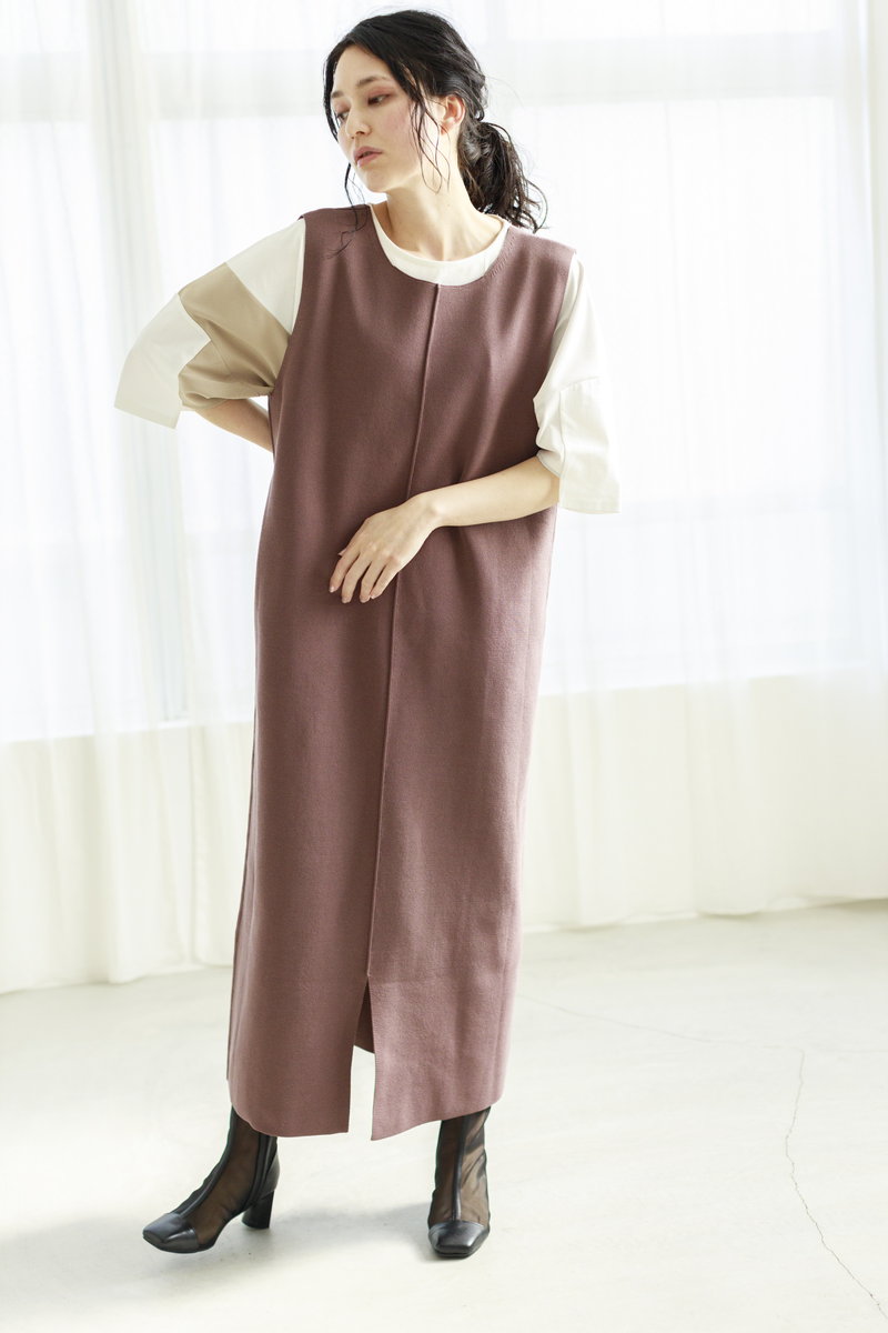 フラットなシルエットのニットワンピは、