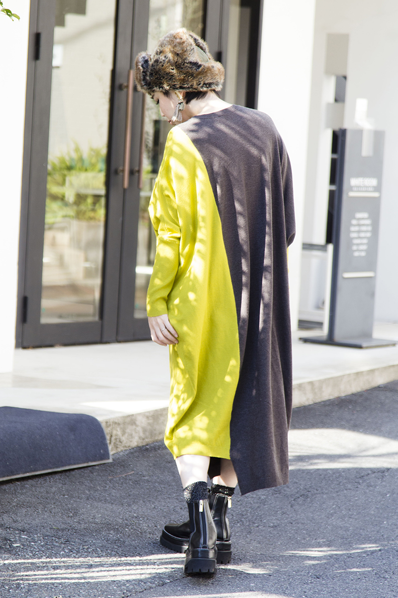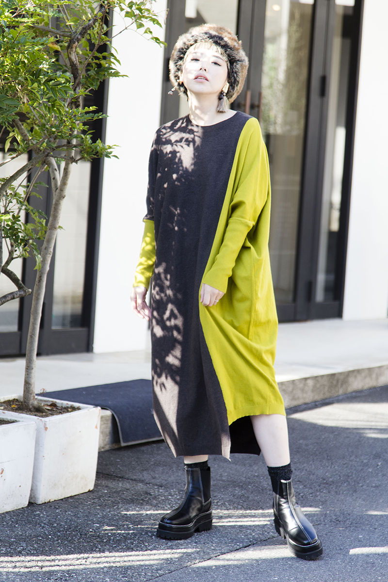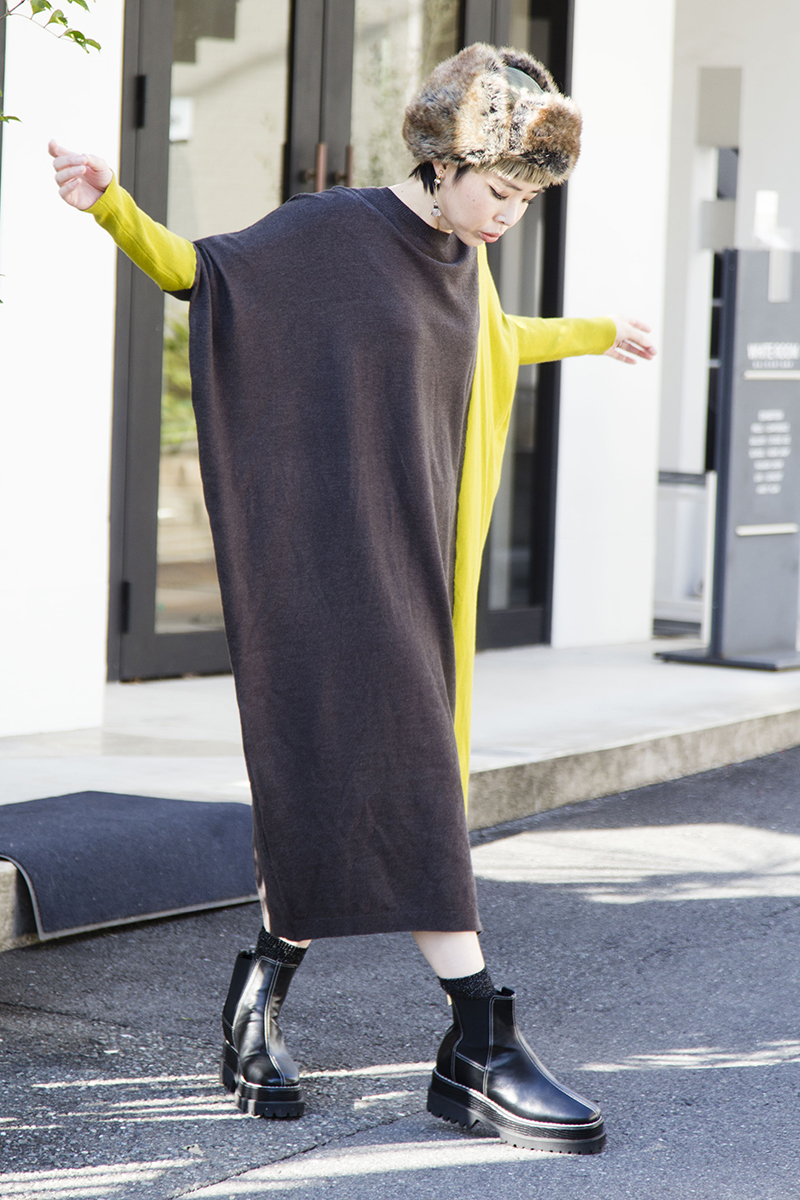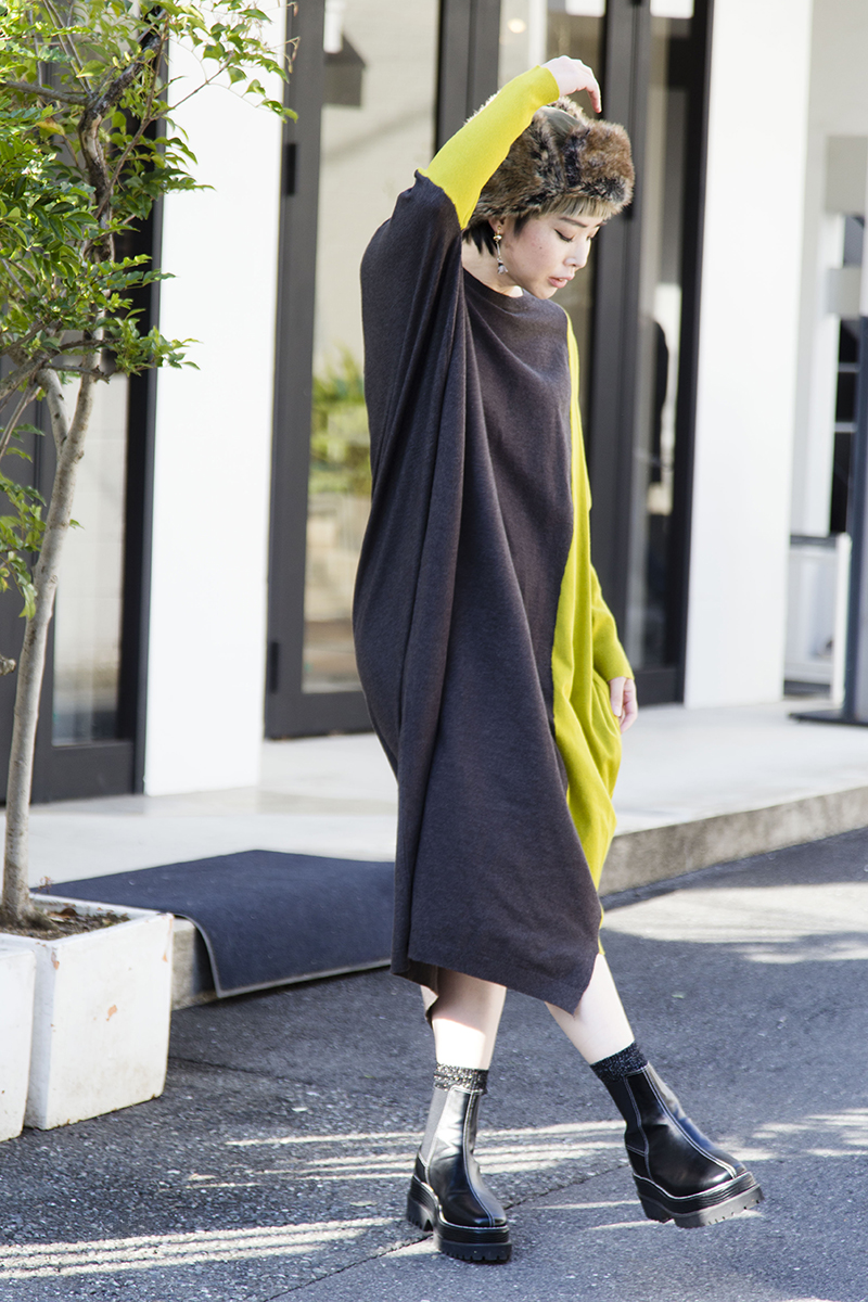 1枚で軽く温か♡ユニークシルエットのニットワンピは帰省や旅行に。