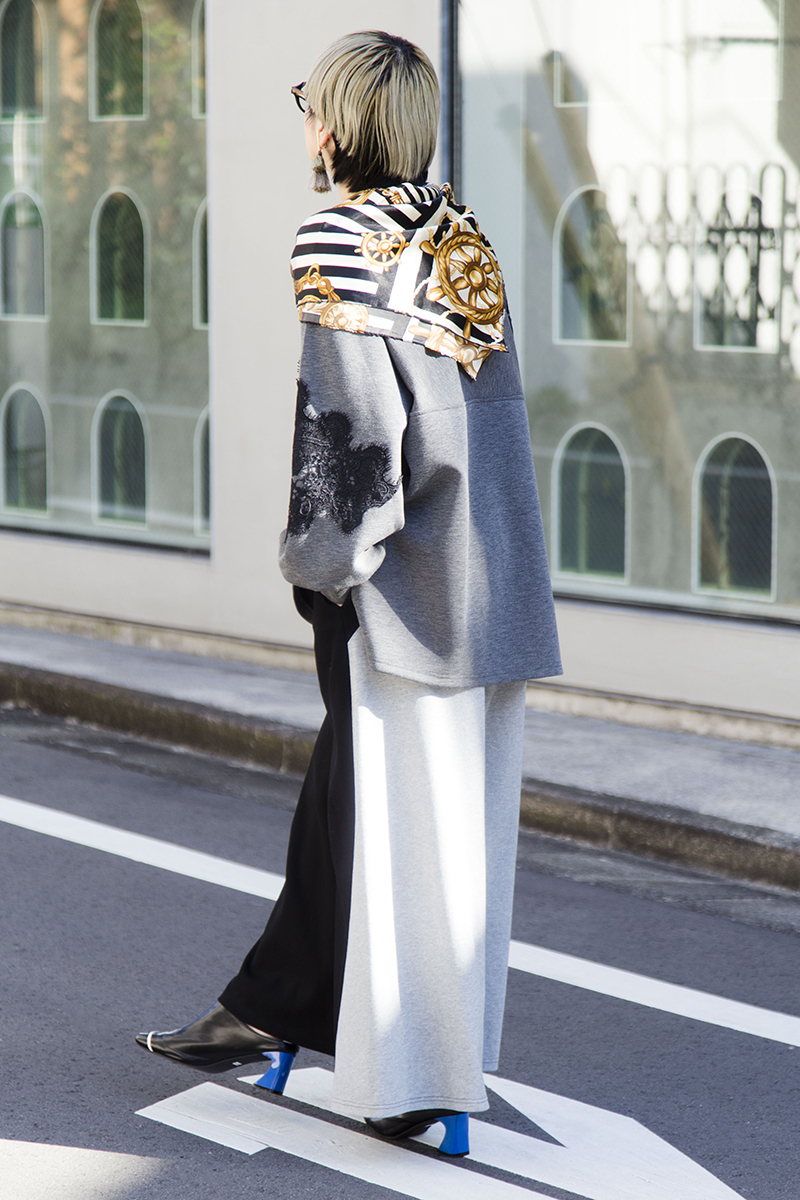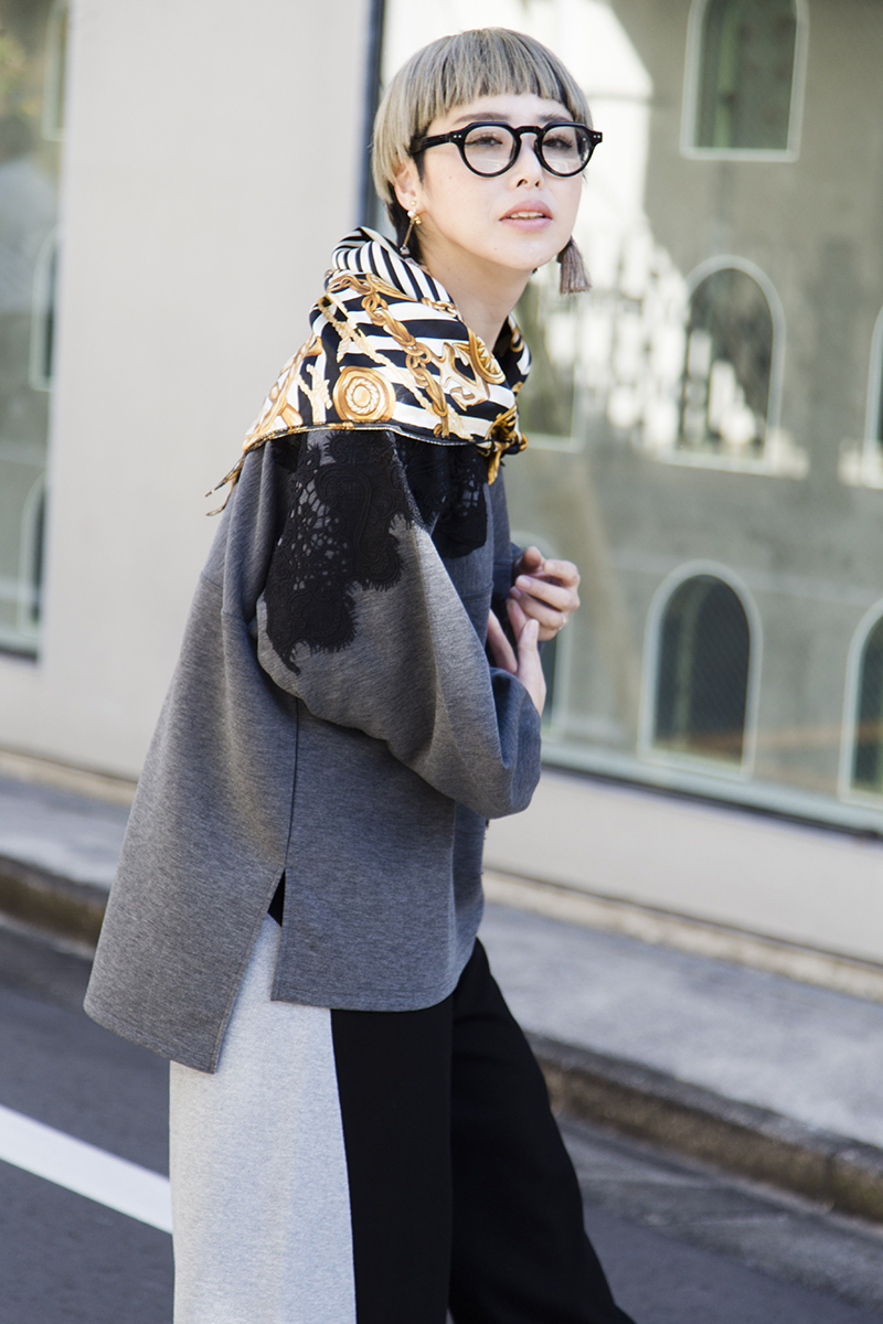 スカーフのアクセントで上品さに変えて。